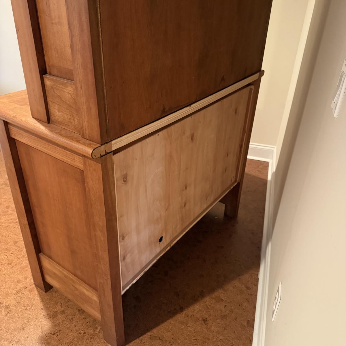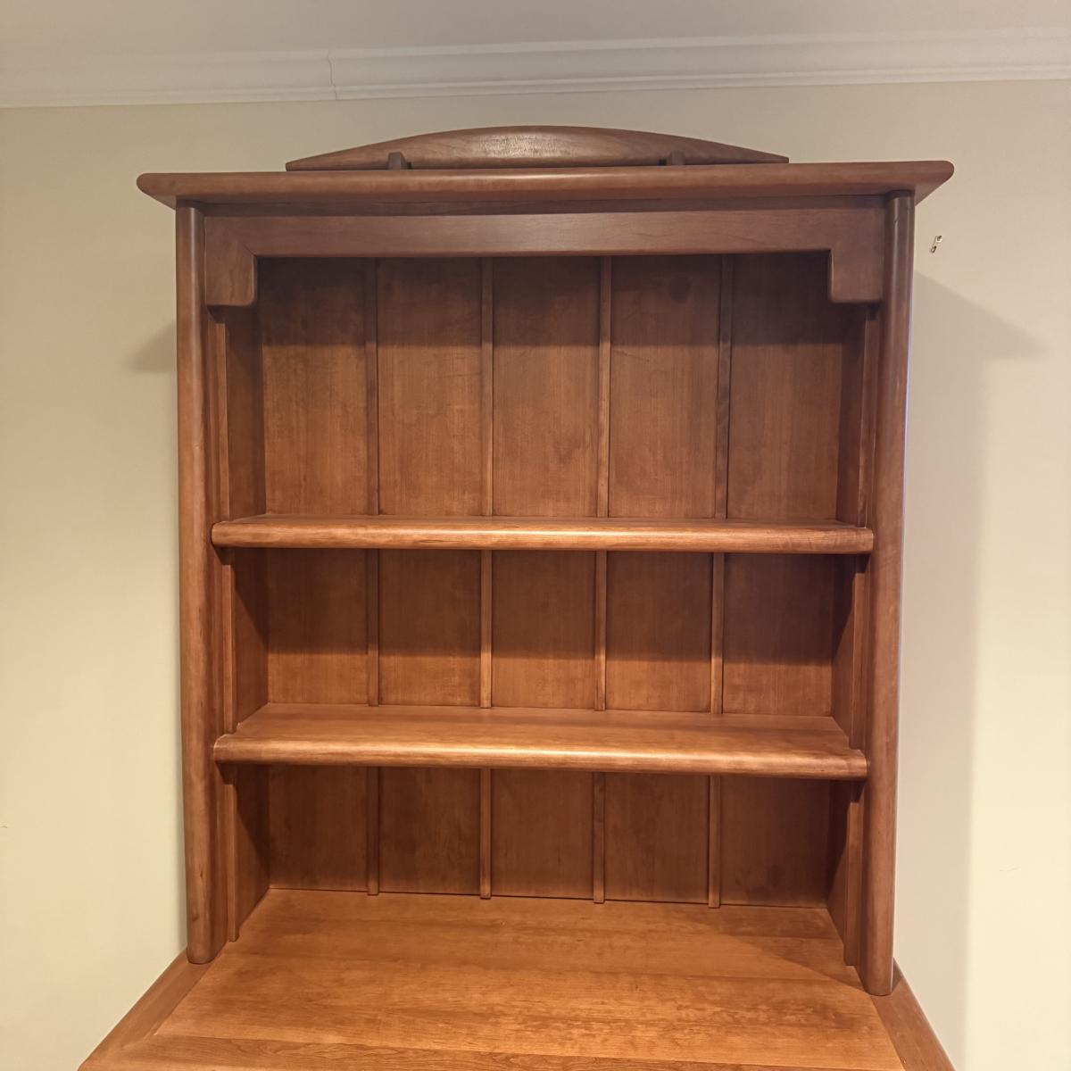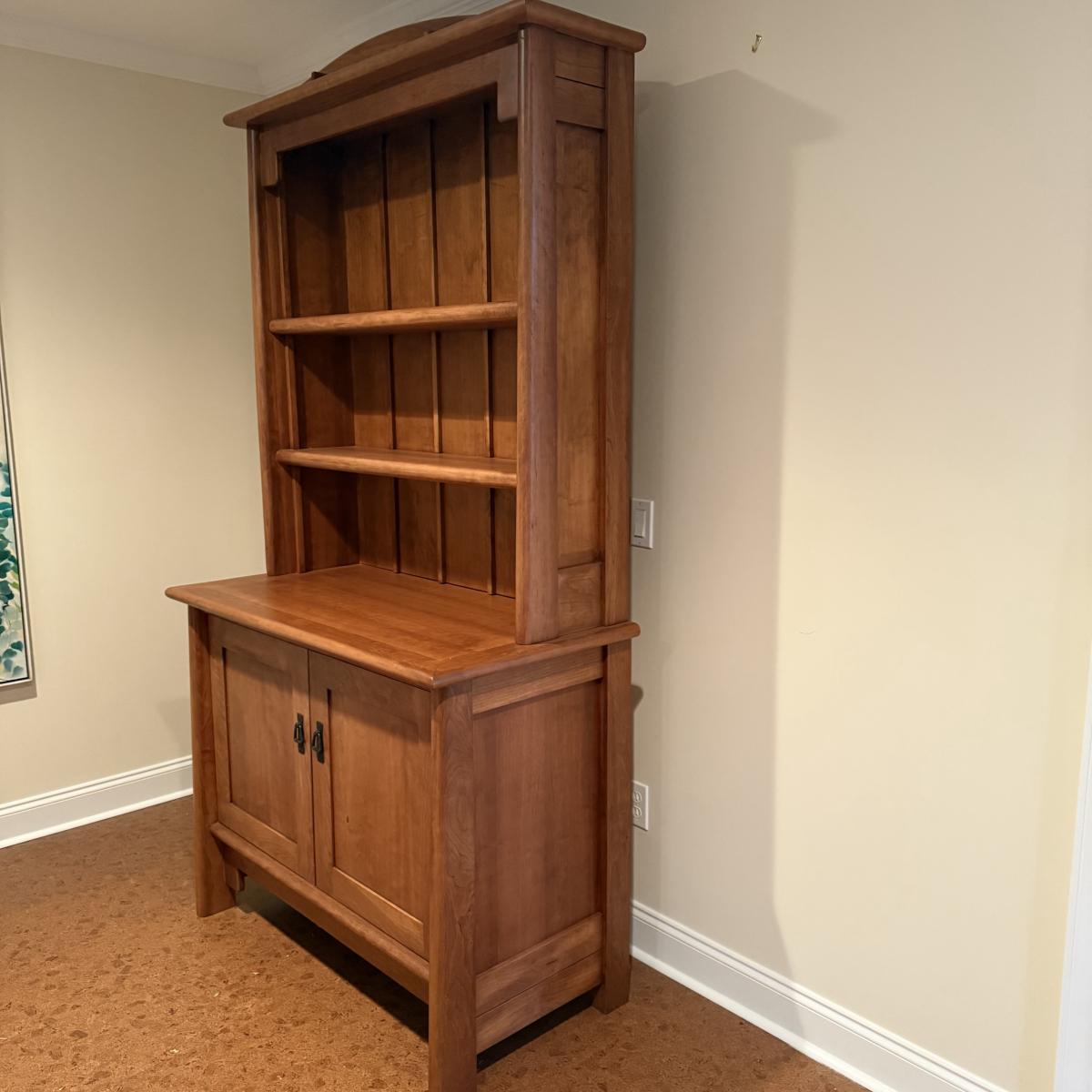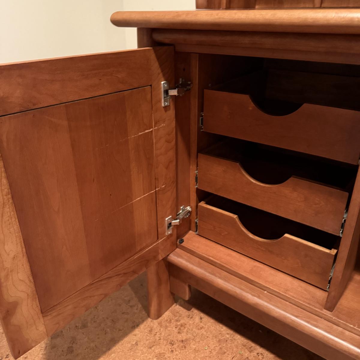 This lot contains a stunning large hutch that does appear to made out of mostly solid wood with a bit of manufactured wood for some filler pieces. This is a very sturdy very heavy piece! It has open shelves on the top. The left side of the cupboard below has three drawers on sliders and the right side of the cupboard is open storage. There is a hole in the back of the right cupboard for cords. There are some scratches on the inside of the left cupboard door from the drawers. This piece measures 45” x 22.5” x 82.5”H. The top shelves do come off the bottom cupboard. This item is located in the basement of this house. Local pick up only. Winning bidder must bring assistance to help move and load this item due to its weight and/or size.