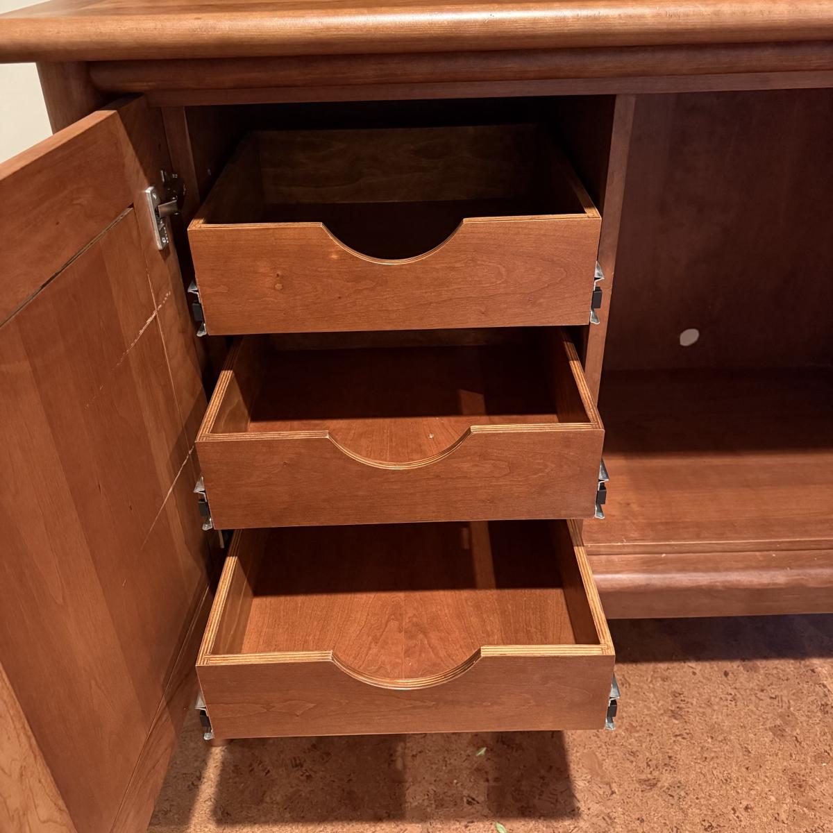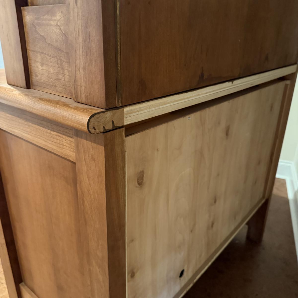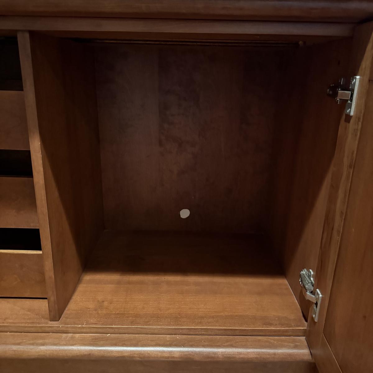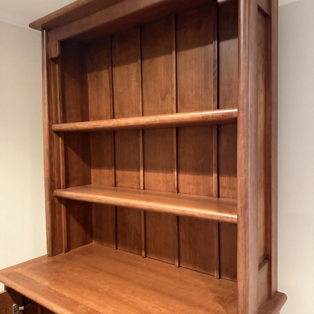 This lot contains a stunning large hutch that does appear to made out of mostly solid wood with a bit of manufactured wood for some filler pieces. This is a very sturdy very heavy piece! It has open shelves on the top. The left side of the cupboard below has three drawers on sliders and the right side of the cupboard is open storage. There is a hole in the back of the right cupboard for cords. There are some scratches on the inside of the left cupboard door from the drawers. This piece measures 45” x 22.5” x 82.5”H. The top shelves do come off the bottom cupboard. This item is located in the basement of this house. Local pick up only. Winning bidder must bring assistance to help move and load this item due to its weight and/or size.
