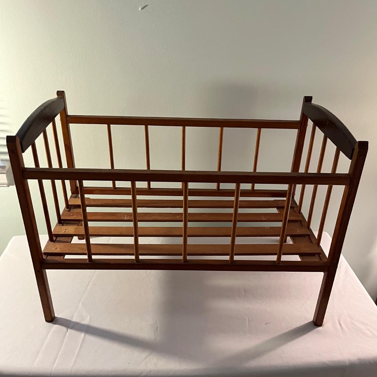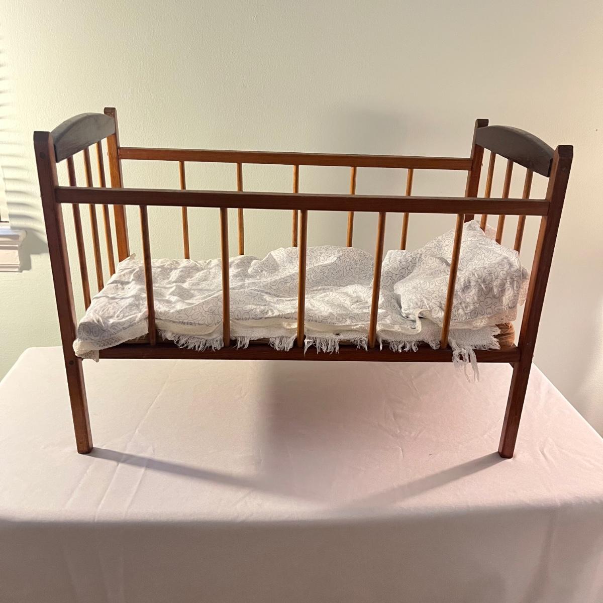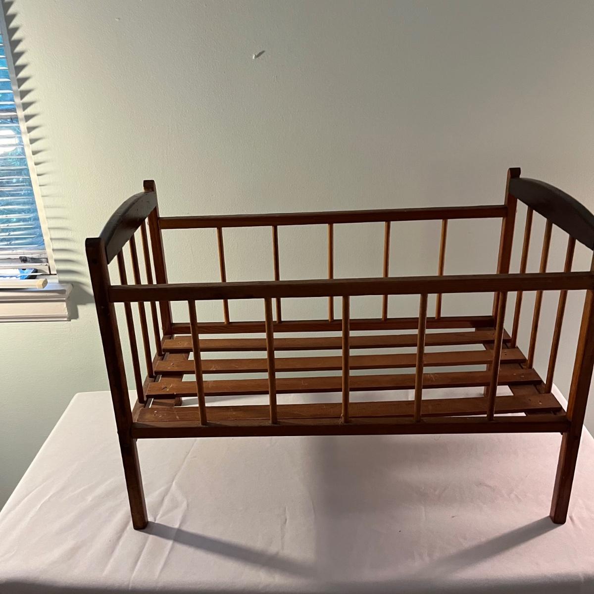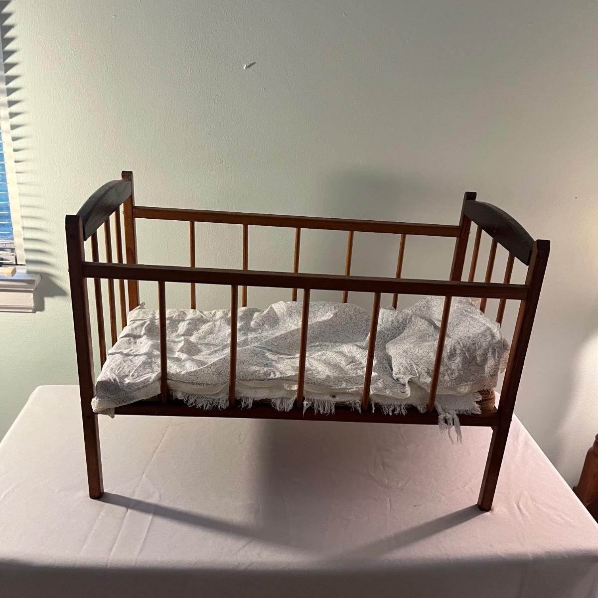 Lot includes solid wood crib with removable bottom. Also includes thin mattress and pillow. Crib measures 13.6” x 25”5” x 18.5”. Crib is not up to today's safety standard as is only for display purposes.