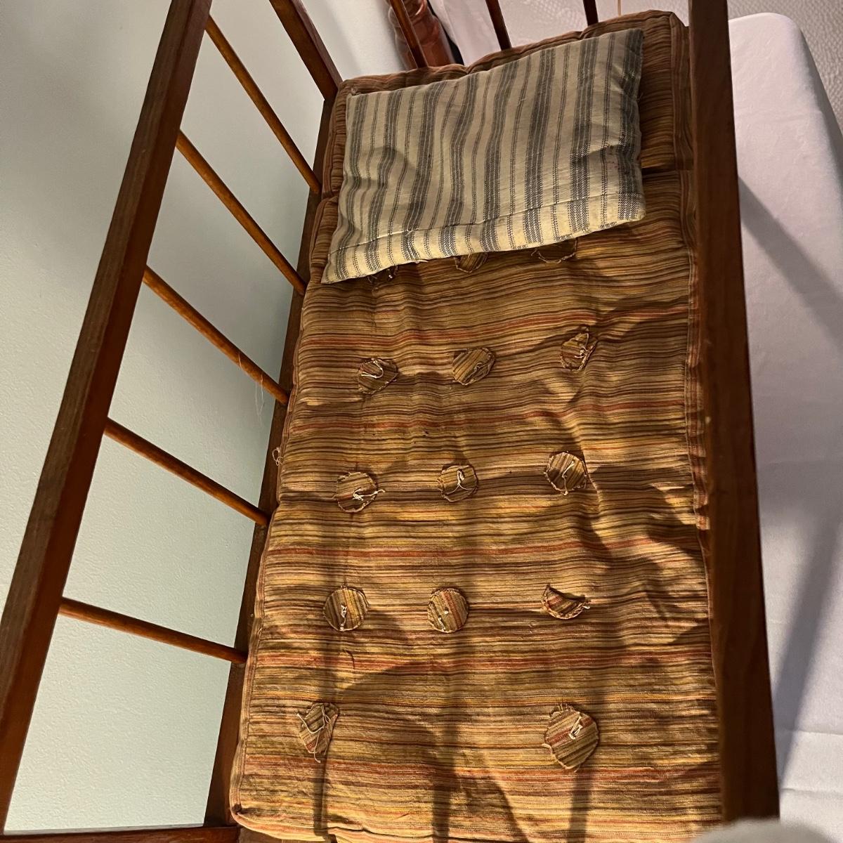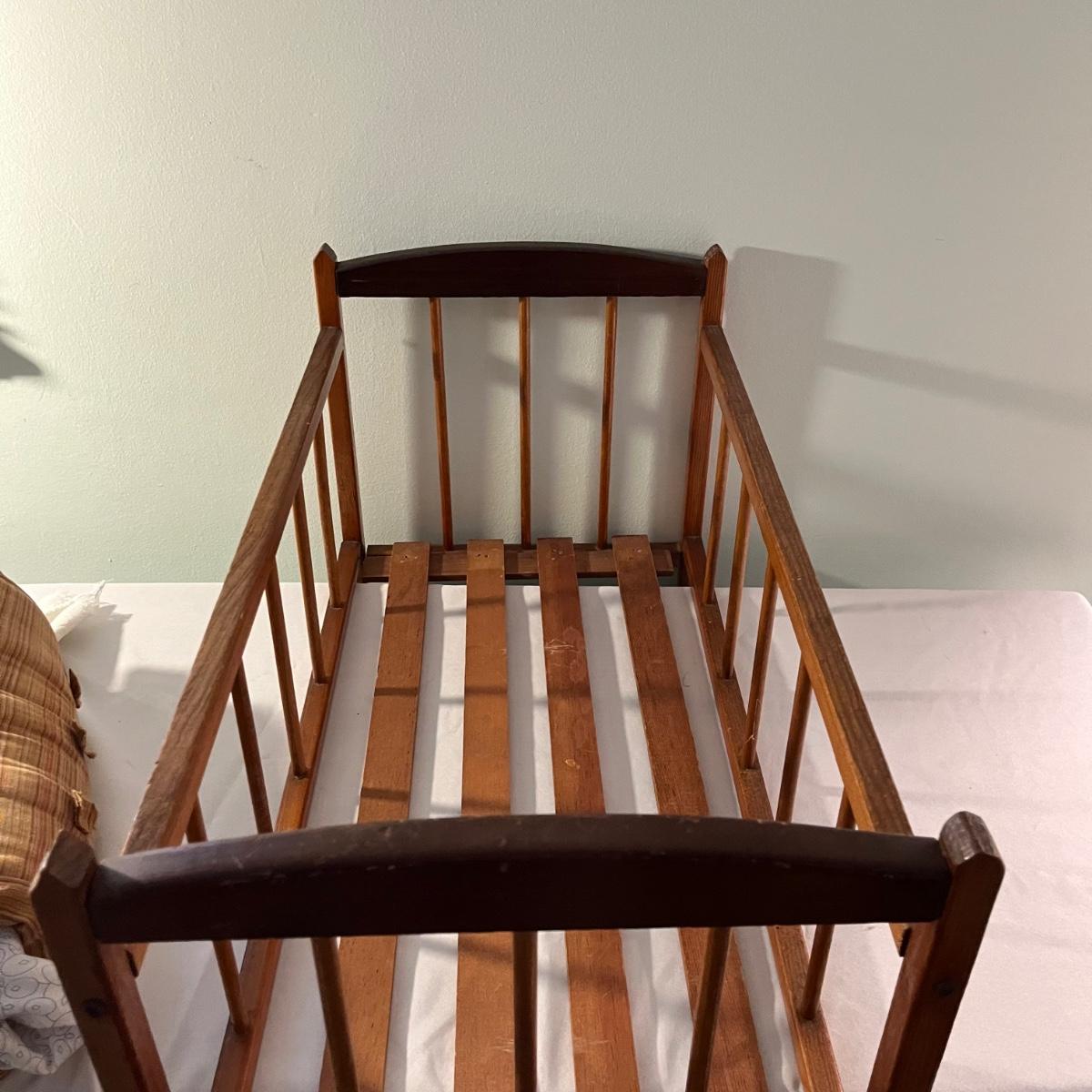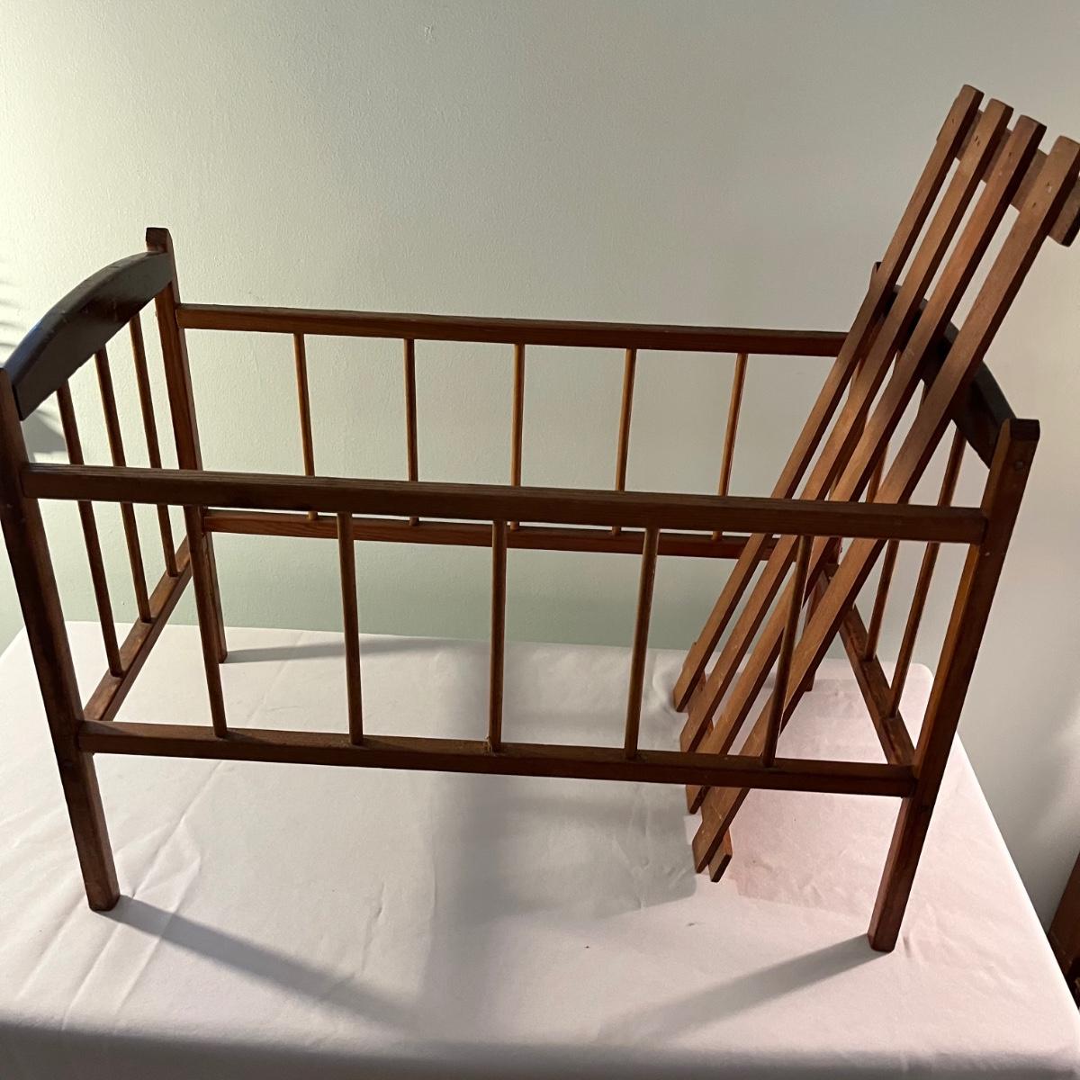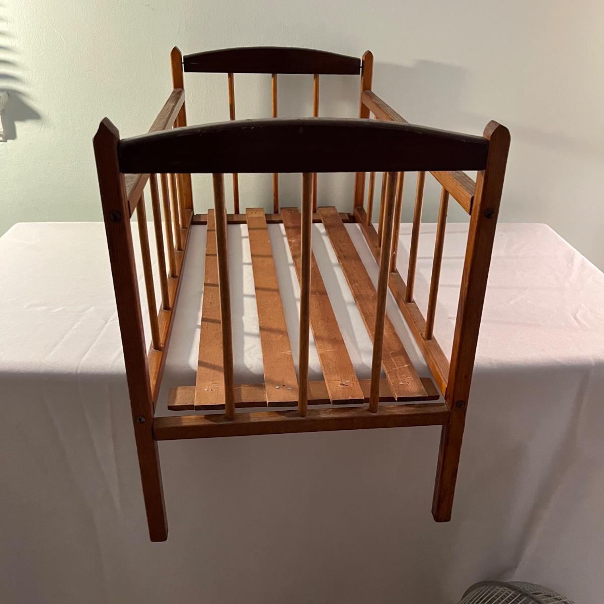 Lot includes solid wood crib with removable bottom. Also includes thin mattress and pillow. Crib measures 13.6” x 25”5” x 18.5”. Crib is not up to today's safety standard as is only for display purposes.