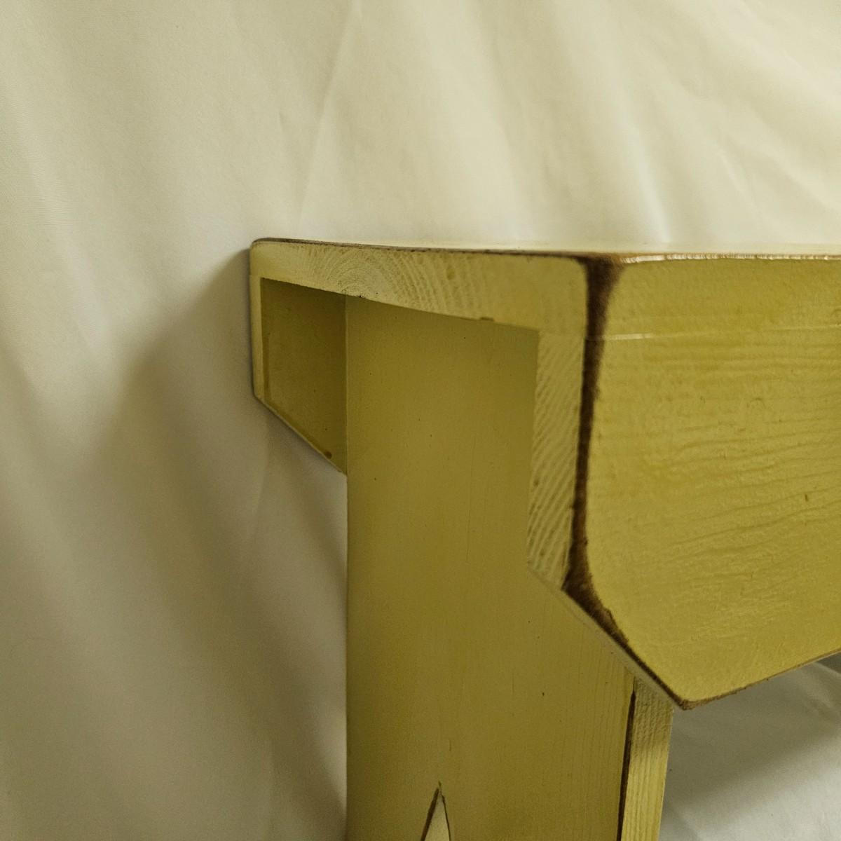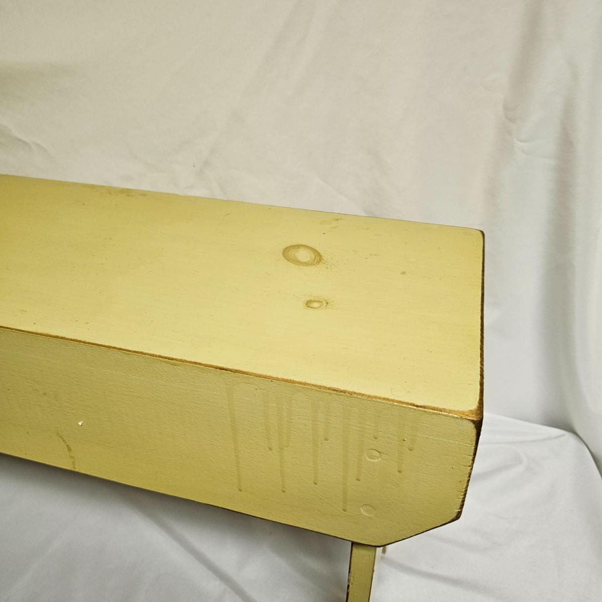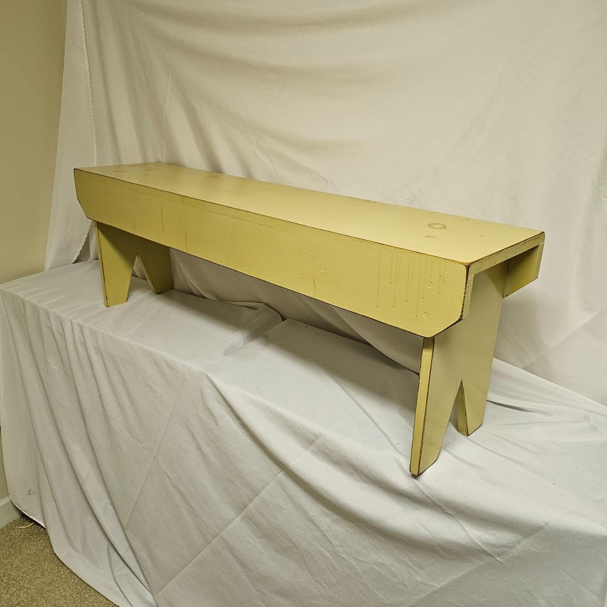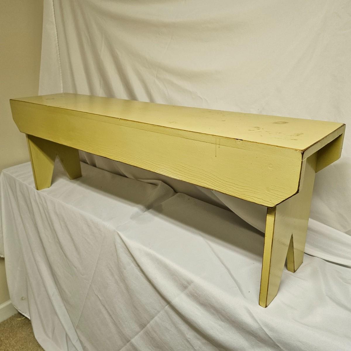 Painted in ochre yellow color, this solid wood bench appears to be pine and is compact enough to use anywhere. Measures 48" x 10.5" x 16"H. The edges have been roughed over for contrast with the finish. See photos for details. Local pickup only. Please note, item is located upstairs.