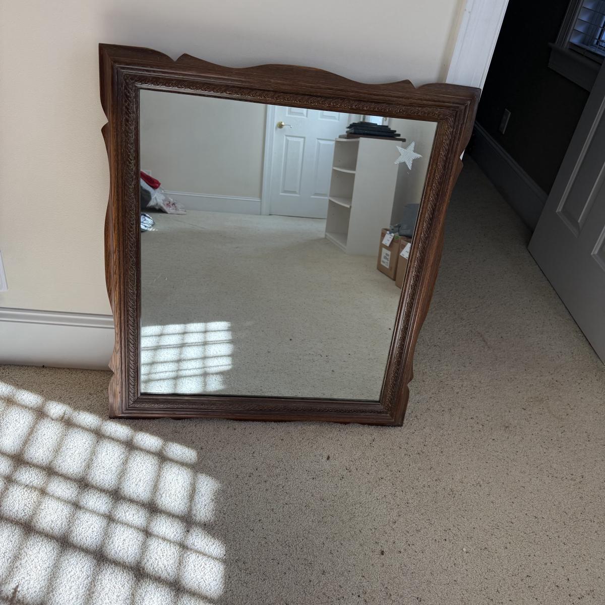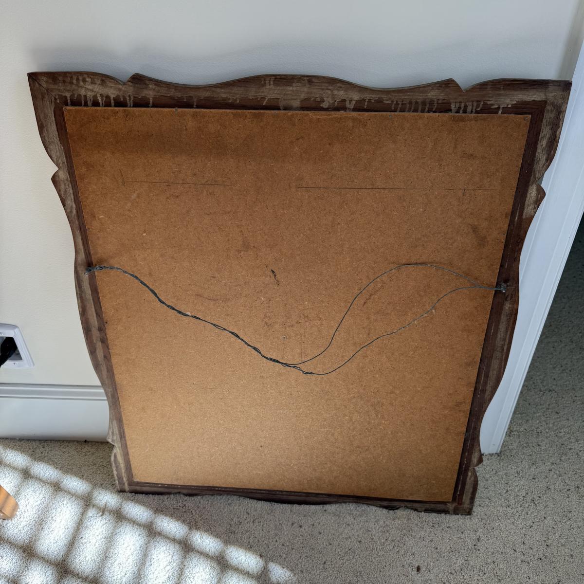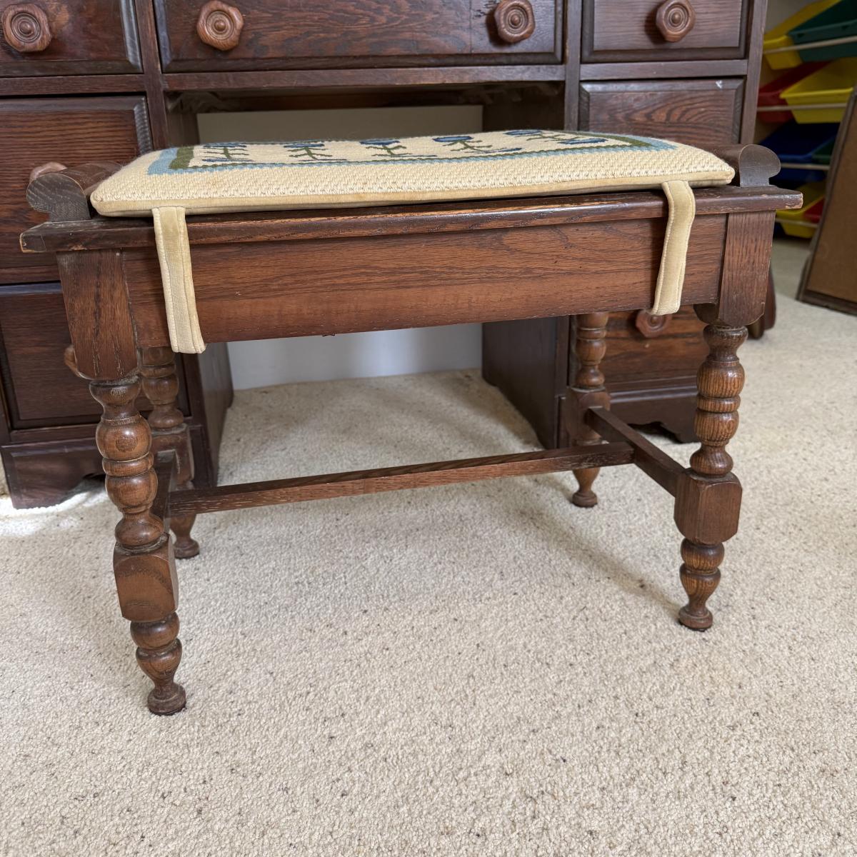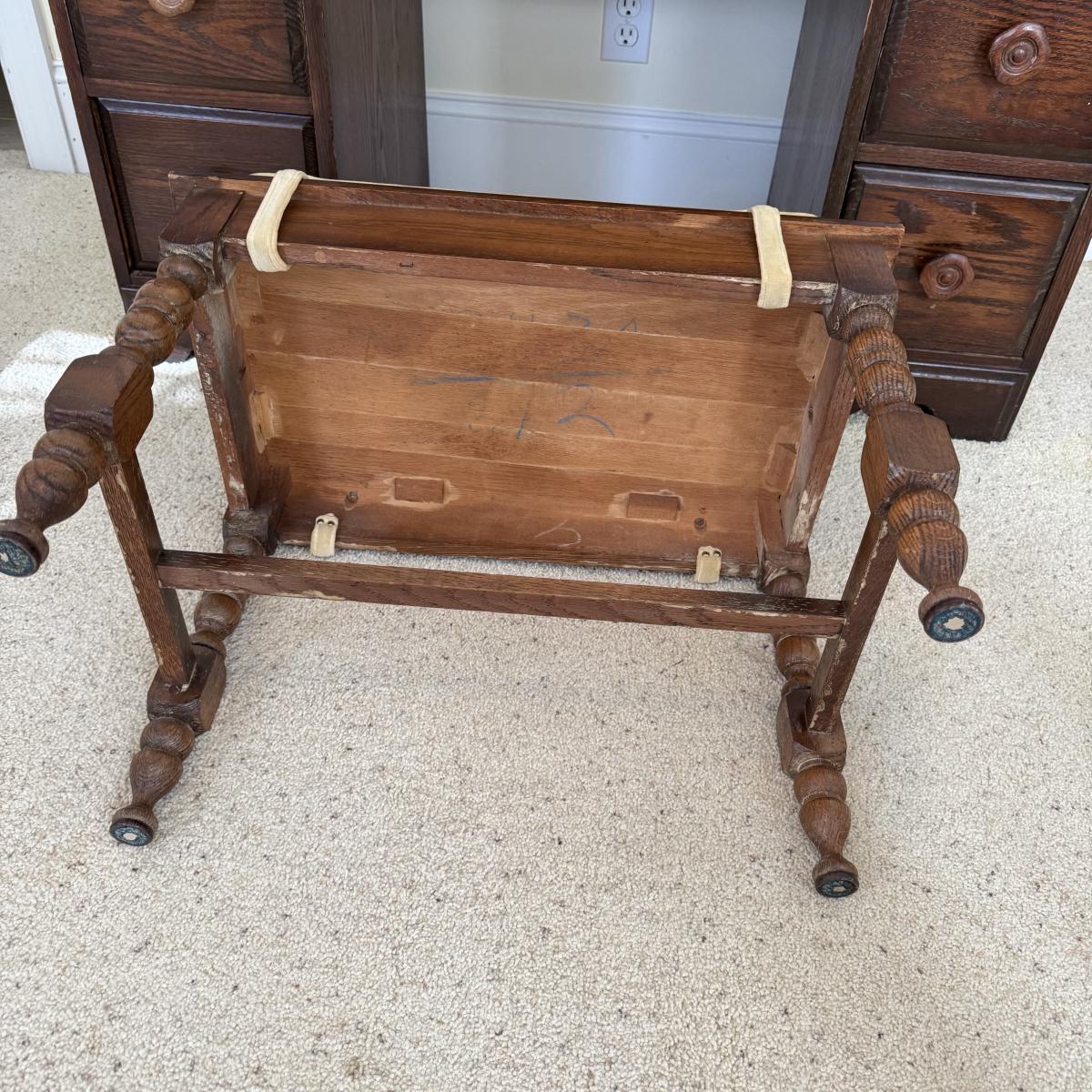 This lot contains a solid wood desk, a stool and a mirror. The desk has seven drawers and measures 44” x 19.5” x 28”H. This desk is heavy. Next is a perfect little stool with a floral pillow that is attached to the stool via bolts on the bottom (see pictures for details). This piece measures 24” x 14” x 18.5”H with a 17”seat height. Last is a mirror with the same wood finish as the desk and stool. The mirror measures 29” x 33” and does have hardware to be hung (this piece is heavy too!). The mirror has a star painted on the corner, see pictures for details. These items are located basement but does have a door straight out to the main level. Local pick up only.