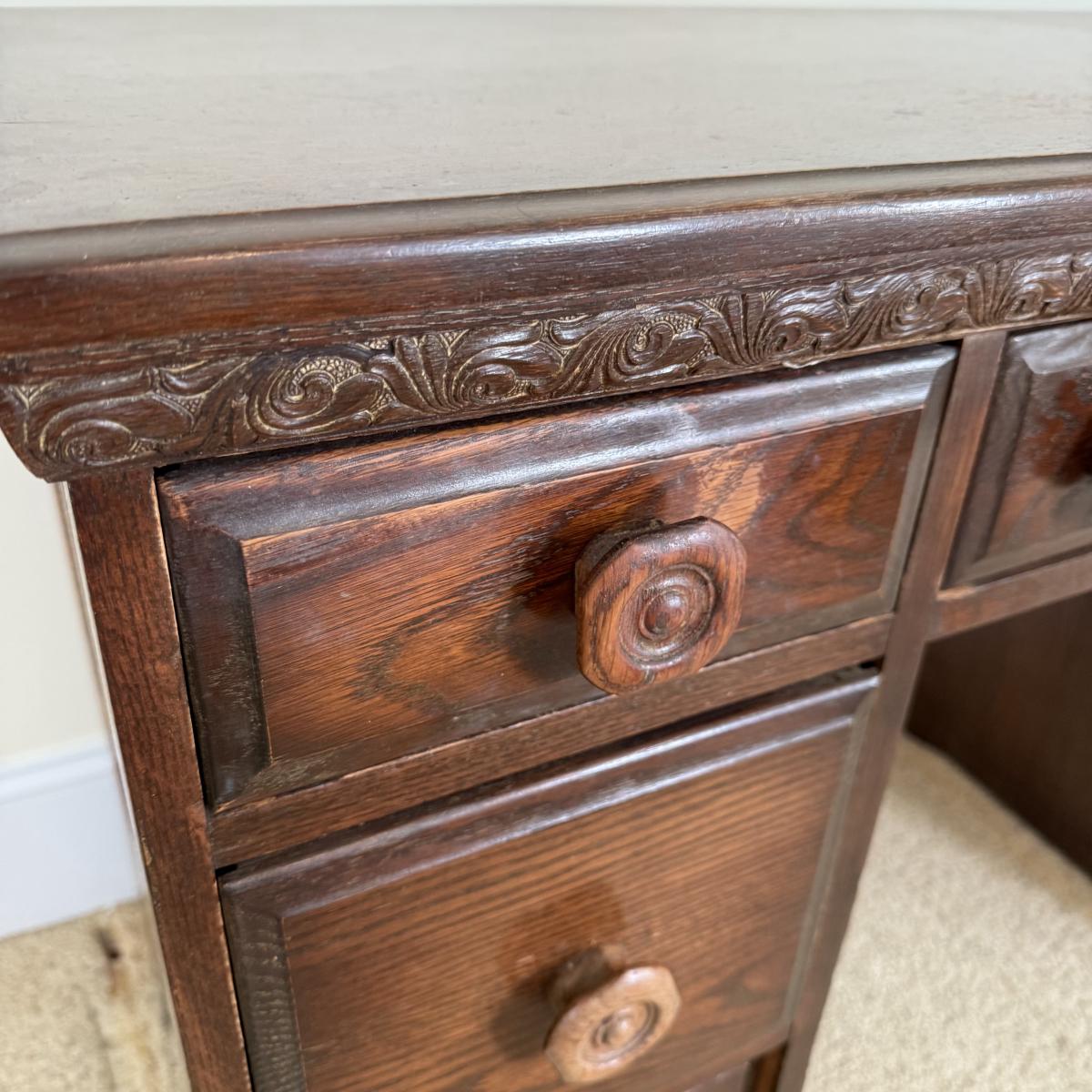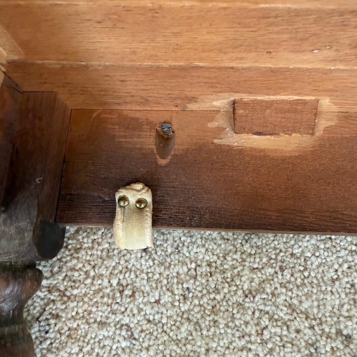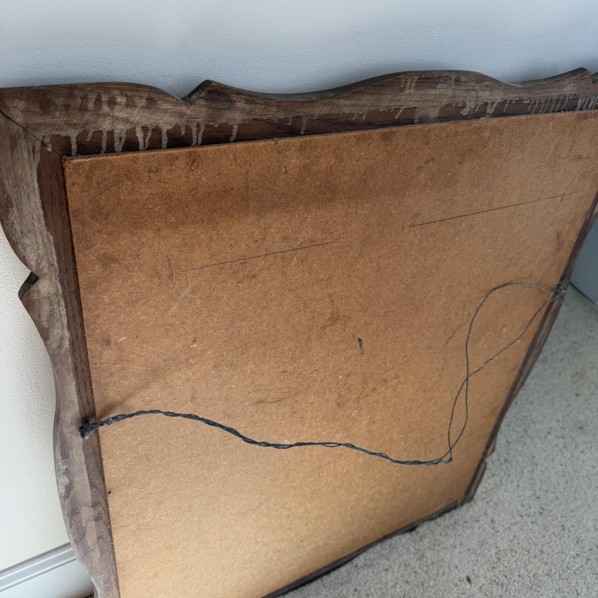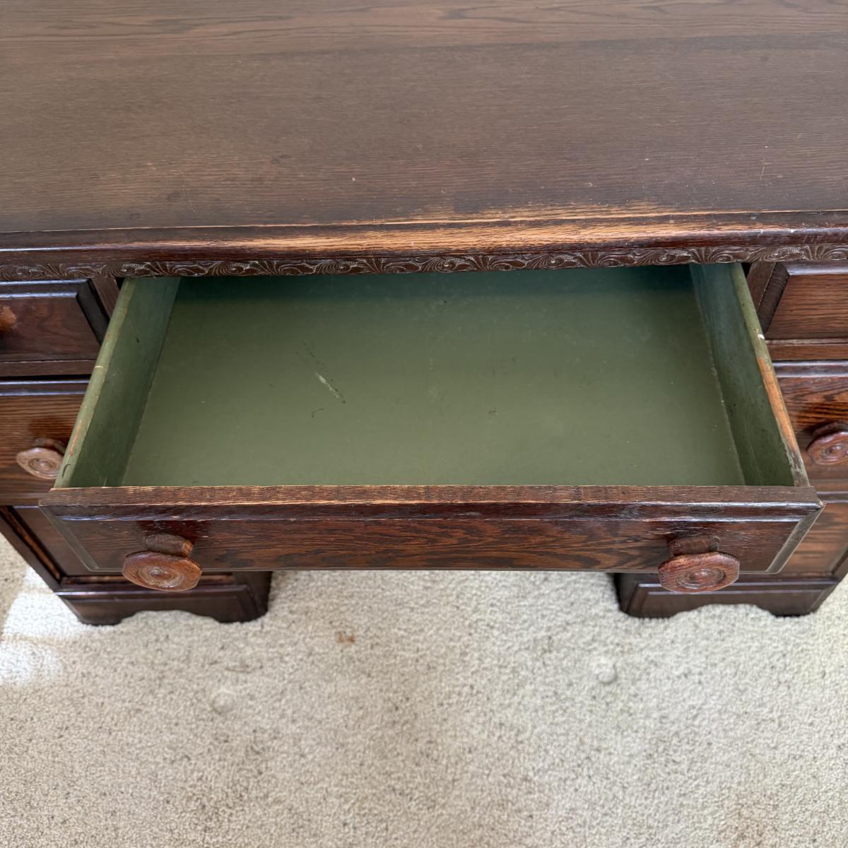 This lot contains a solid wood desk, a stool and a mirror. The desk has seven drawers and measures 44” x 19.5” x 28”H. This desk is heavy. Next is a perfect little stool with a floral pillow that is attached to the stool via bolts on the bottom (see pictures for details). This piece measures 24” x 14” x 18.5”H with a 17”seat height. Last is a mirror with the same wood finish as the desk and stool. The mirror measures 29” x 33” and does have hardware to be hung (this piece is heavy too!). The mirror has a star painted on the corner, see pictures for details. These items are located basement but does have a door straight out to the main level. Local pick up only.