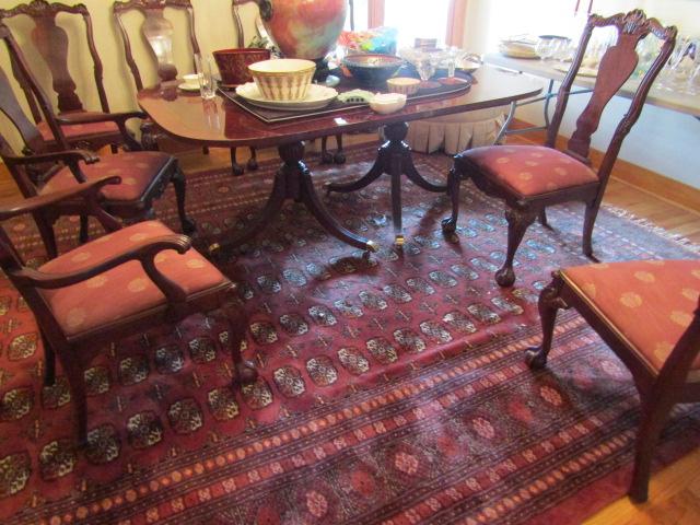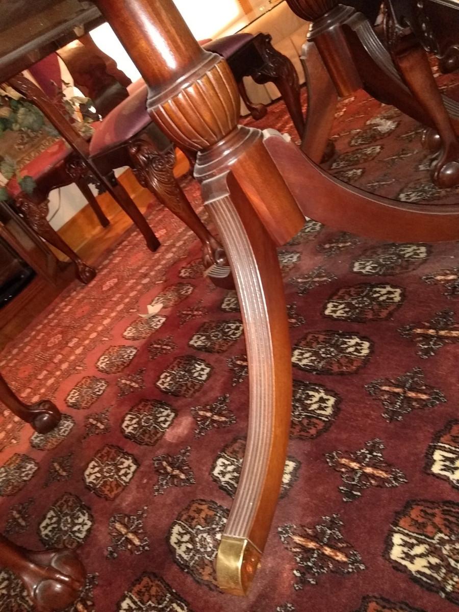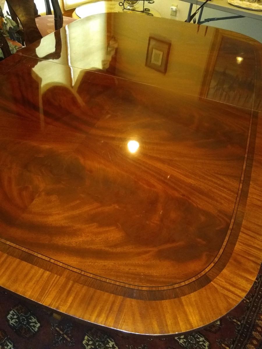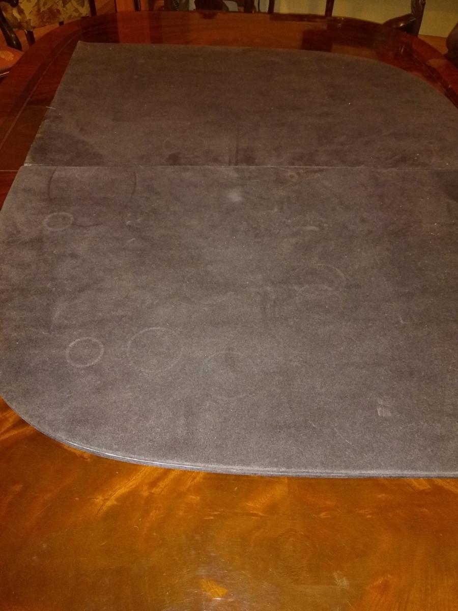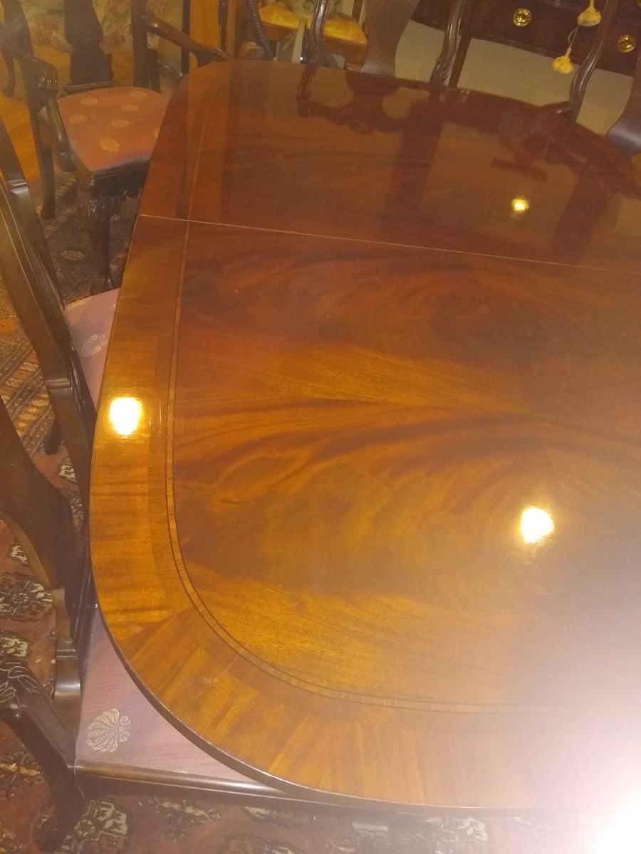 Solid Wood Dining Room Table and Chairs by Bernhardt. Table is approx 72 1/2" long, 46 1/2" wide, 29" tall. There are 3 additional leaves (each 18"). 8 chairs total- 2 are captain's chairs. Table also has protective pad.