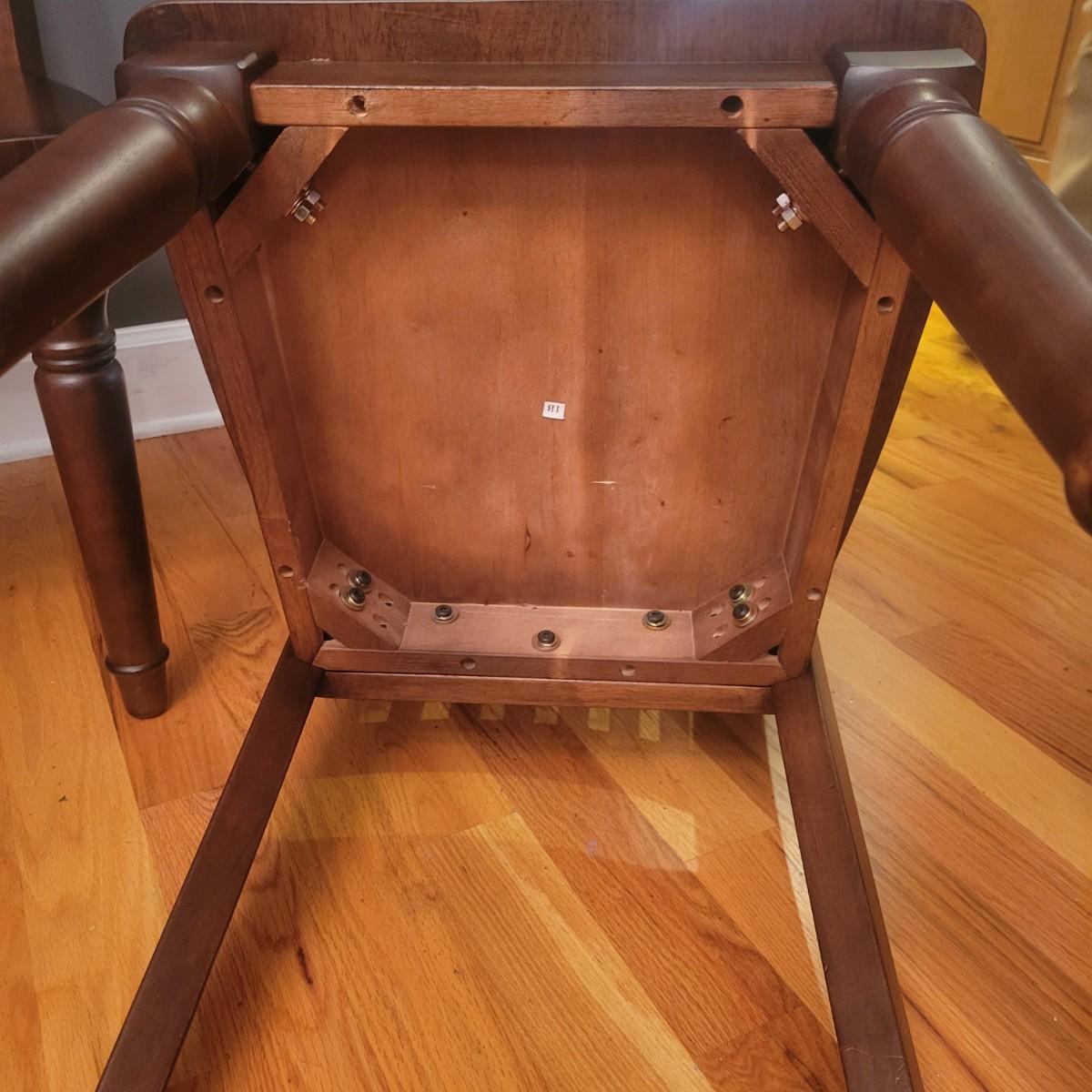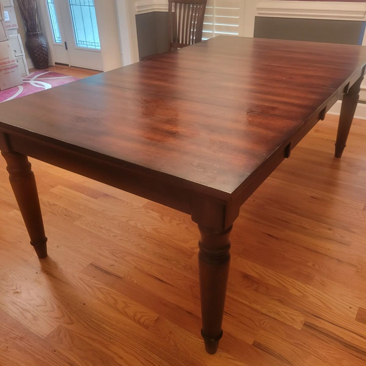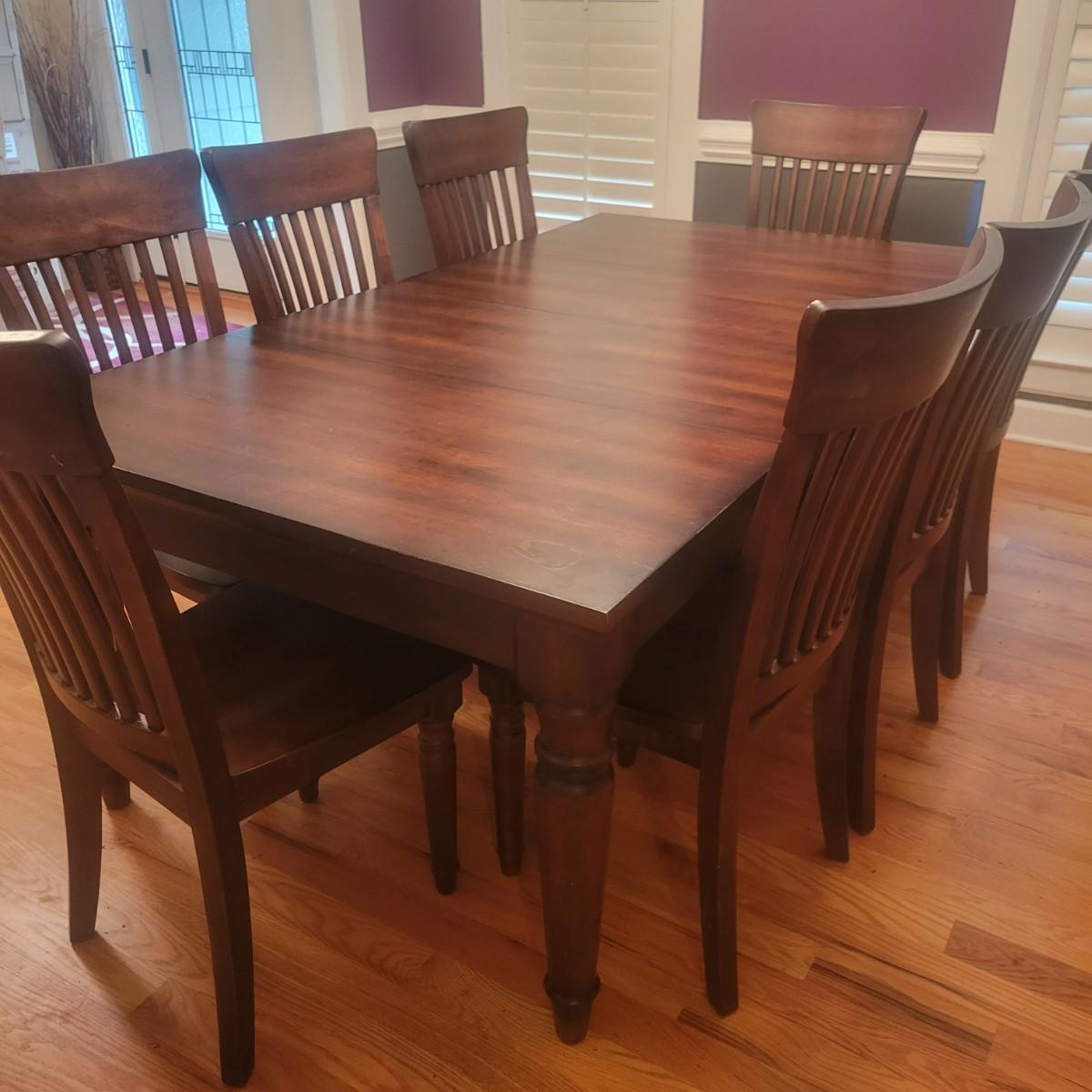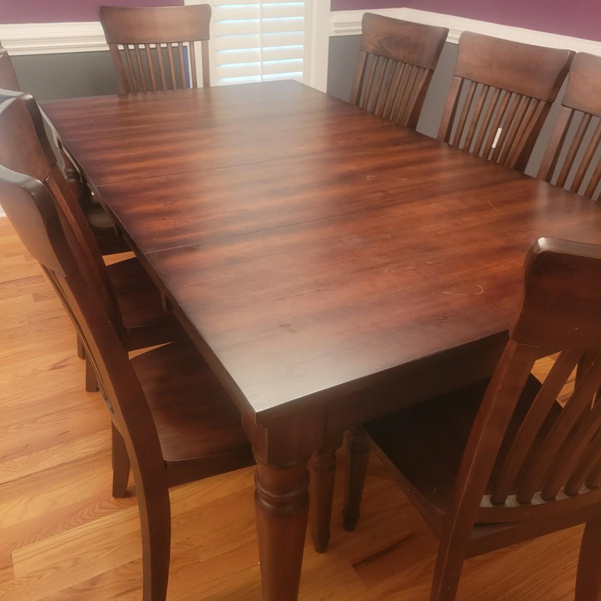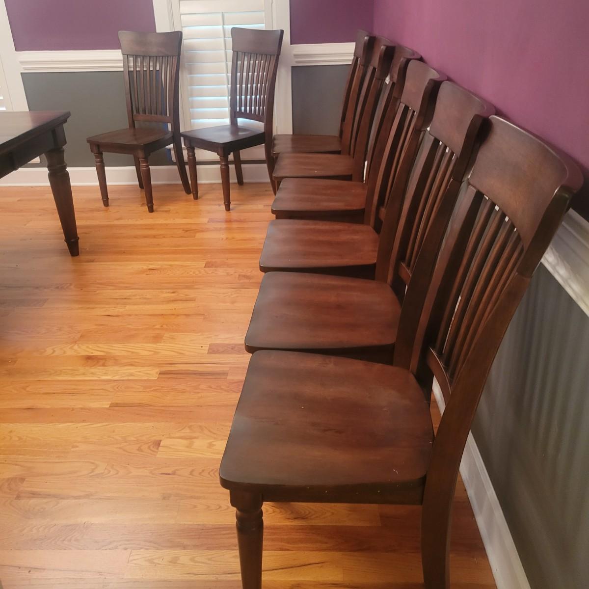 A solid wood Hsien Yang dining room table and eight chairs. The dining room table is made of solid wood and features a rich dark brown stain. It has two 18" leafs. Without the leafs, the table measures approximately 44" x 45" x 30". Also included are eight matching chairs made of solid wood as well, that measure approximately 20" x 23" x 41.5" with a seat height of 18". Table and chairs are in mostly good condition with some scratches and blemishes, including some paint splatters. Local pickup only. Winning bidder must bring assistance to help move and load these items due to their weight and/or size.