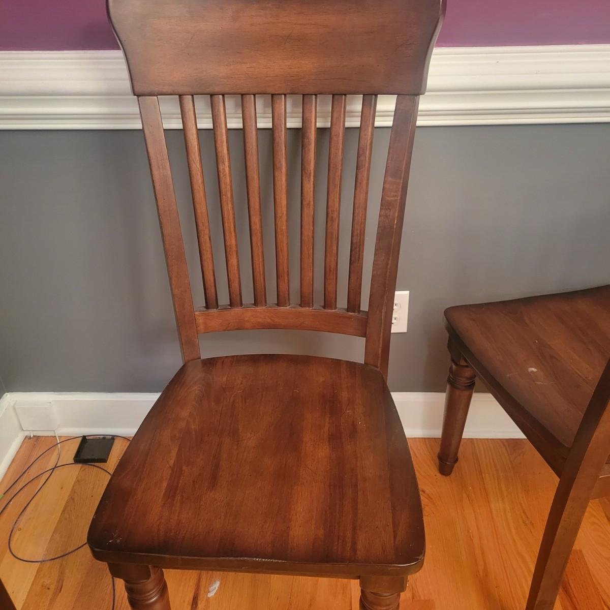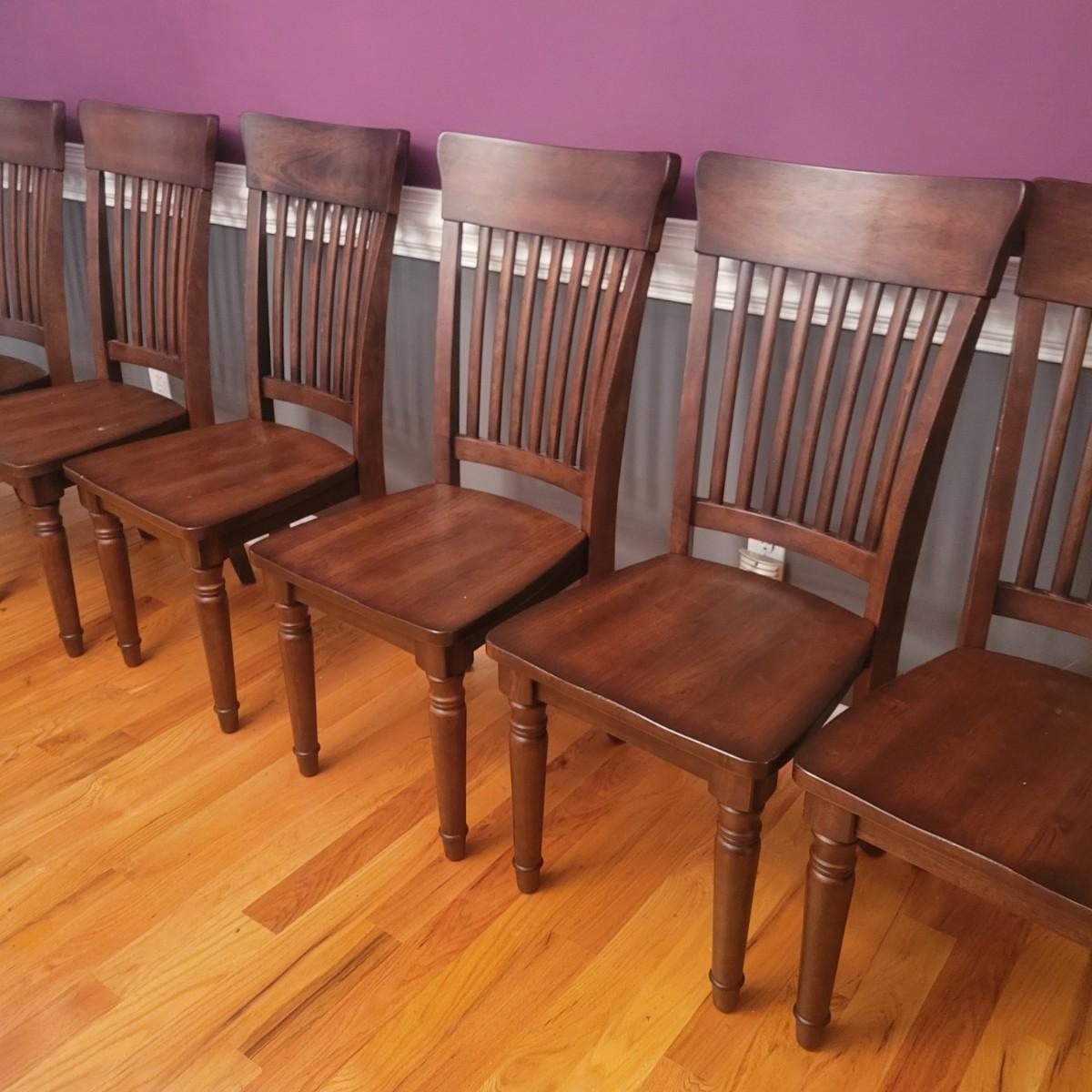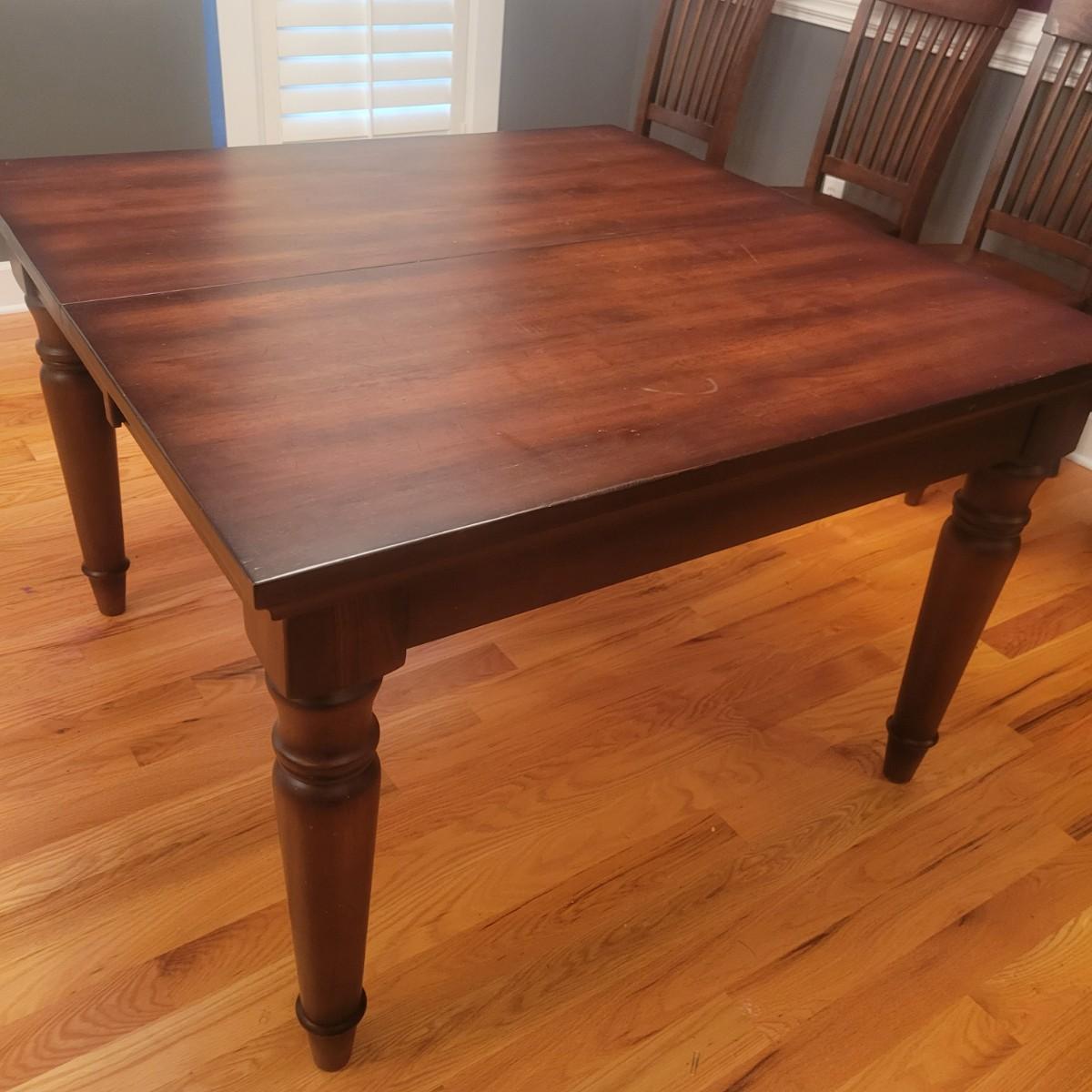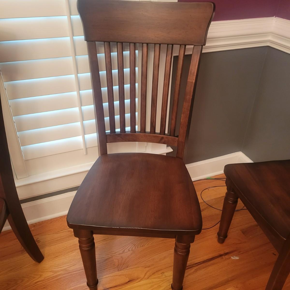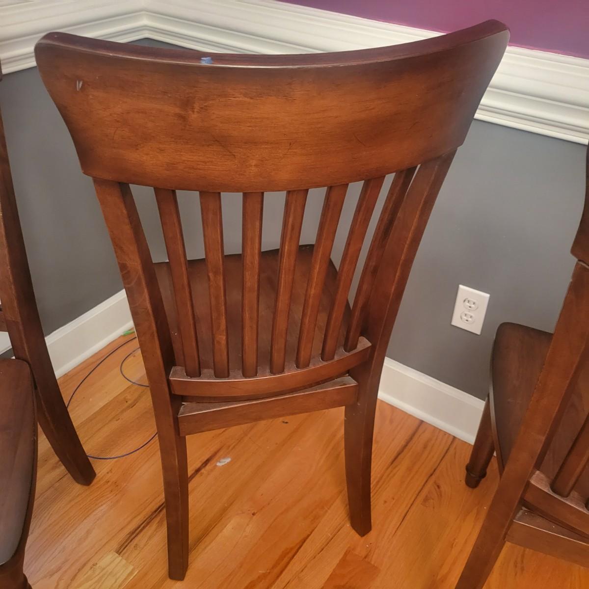 A solid wood Hsien Yang dining room table and eight chairs. The dining room table is made of solid wood and features a rich dark brown stain. It has two 18" leafs. Without the leafs, the table measures approximately 44" x 45" x 30". Also included are eight matching chairs made of solid wood as well, that measure approximately 20" x 23" x 41.5" with a seat height of 18". Table and chairs are in mostly good condition with some scratches and blemishes, including some paint splatters. Local pickup only. Winning bidder must bring assistance to help move and load these items due to their weight and/or size.
