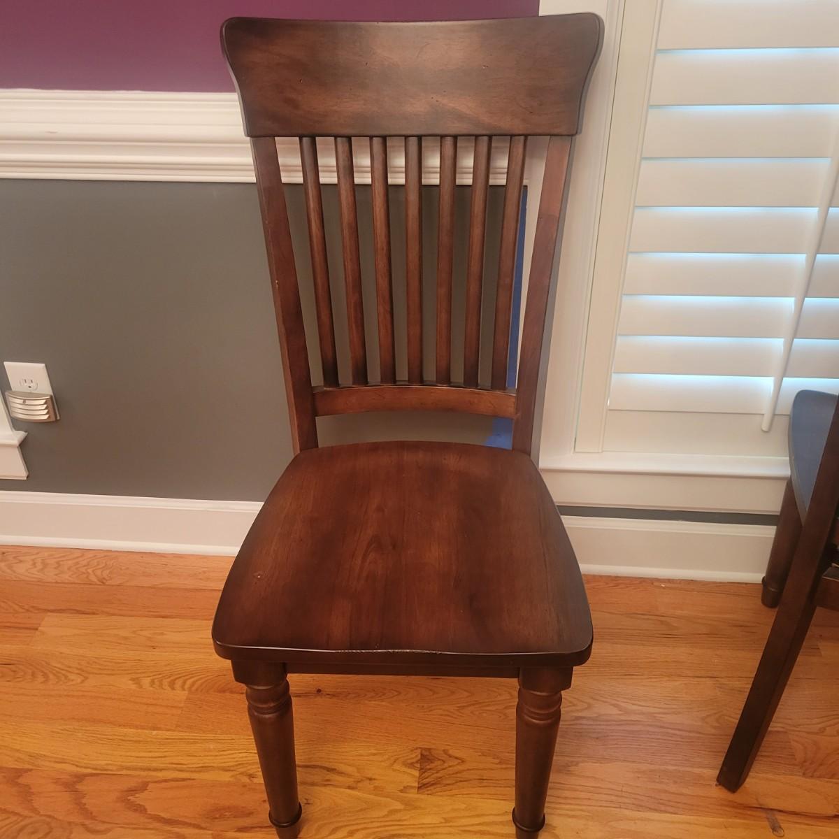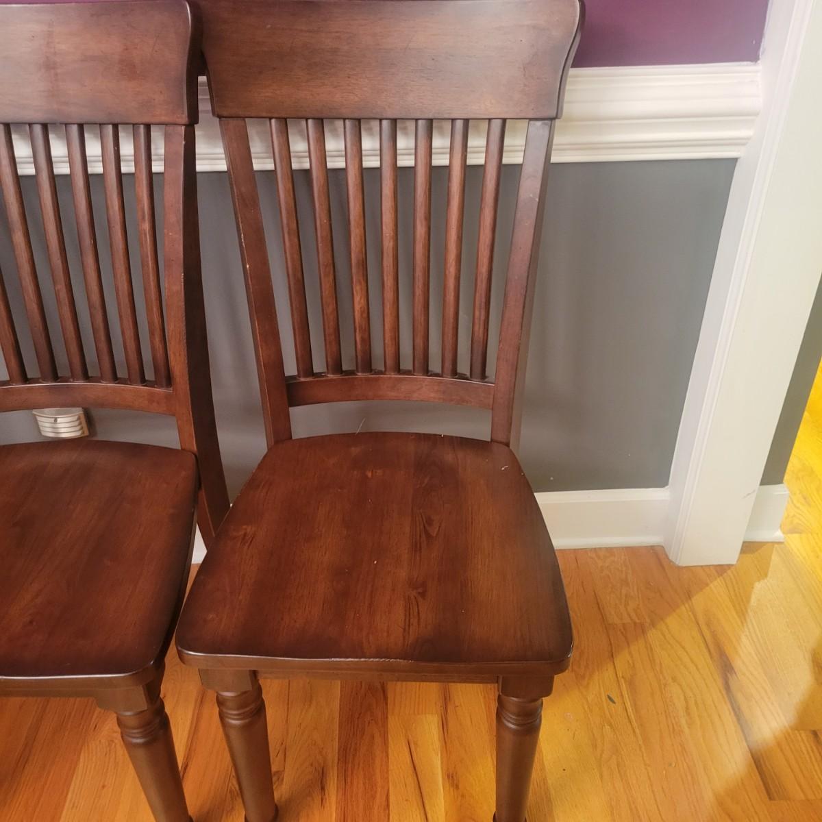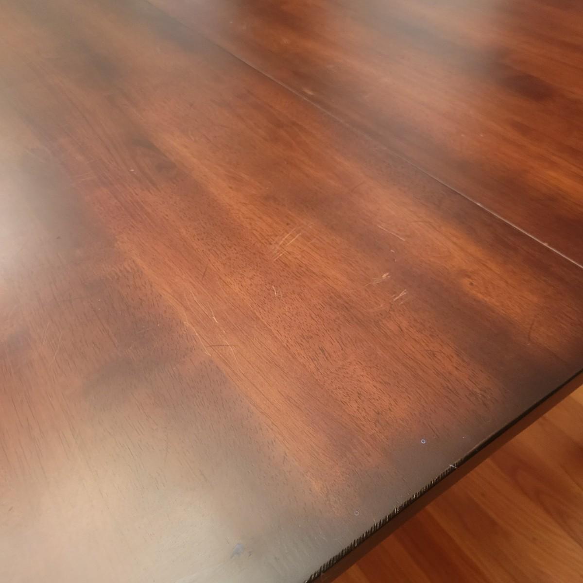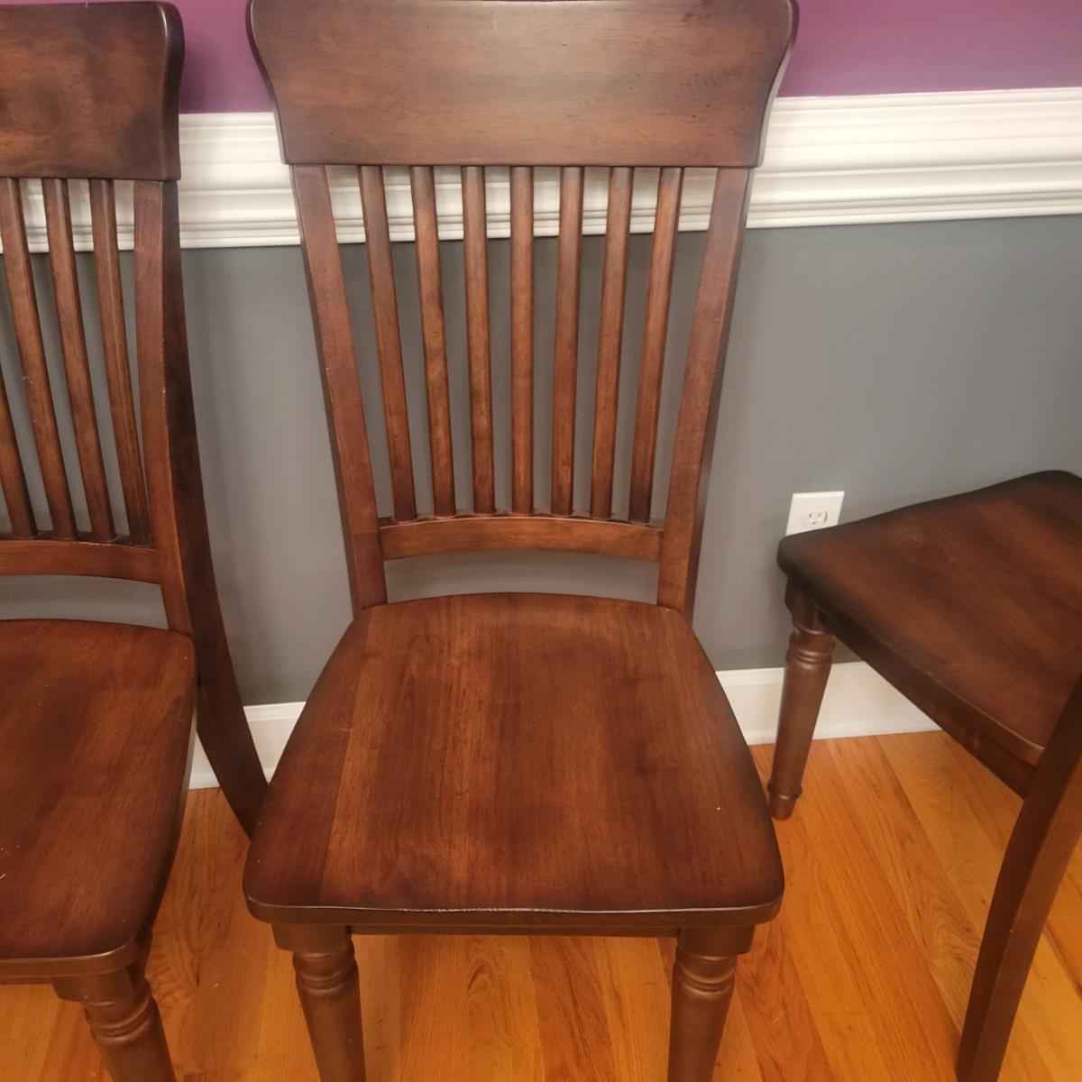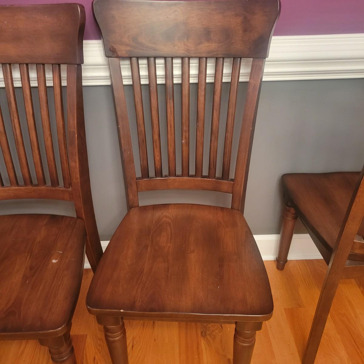 A solid wood Hsien Yang dining room table and eight chairs. The dining room table is made of solid wood and features a rich dark brown stain. It has two 18" leafs. Without the leafs, the table measures approximately 44" x 45" x 30". Also included are eight matching chairs made of solid wood as well, that measure approximately 20" x 23" x 41.5" with a seat height of 18". Table and chairs are in mostly good condition with some scratches and blemishes, including some paint splatters. Local pickup only. Winning bidder must bring assistance to help move and load these items due to their weight and/or size.