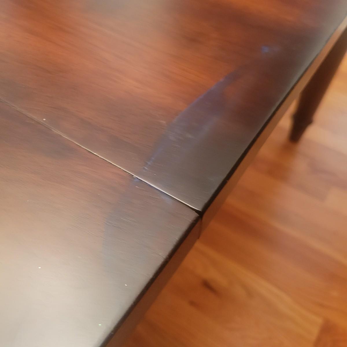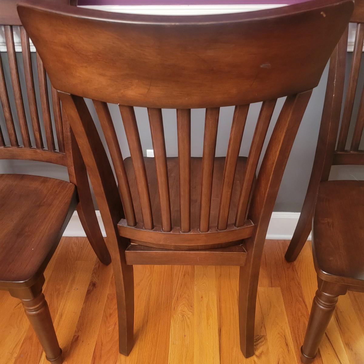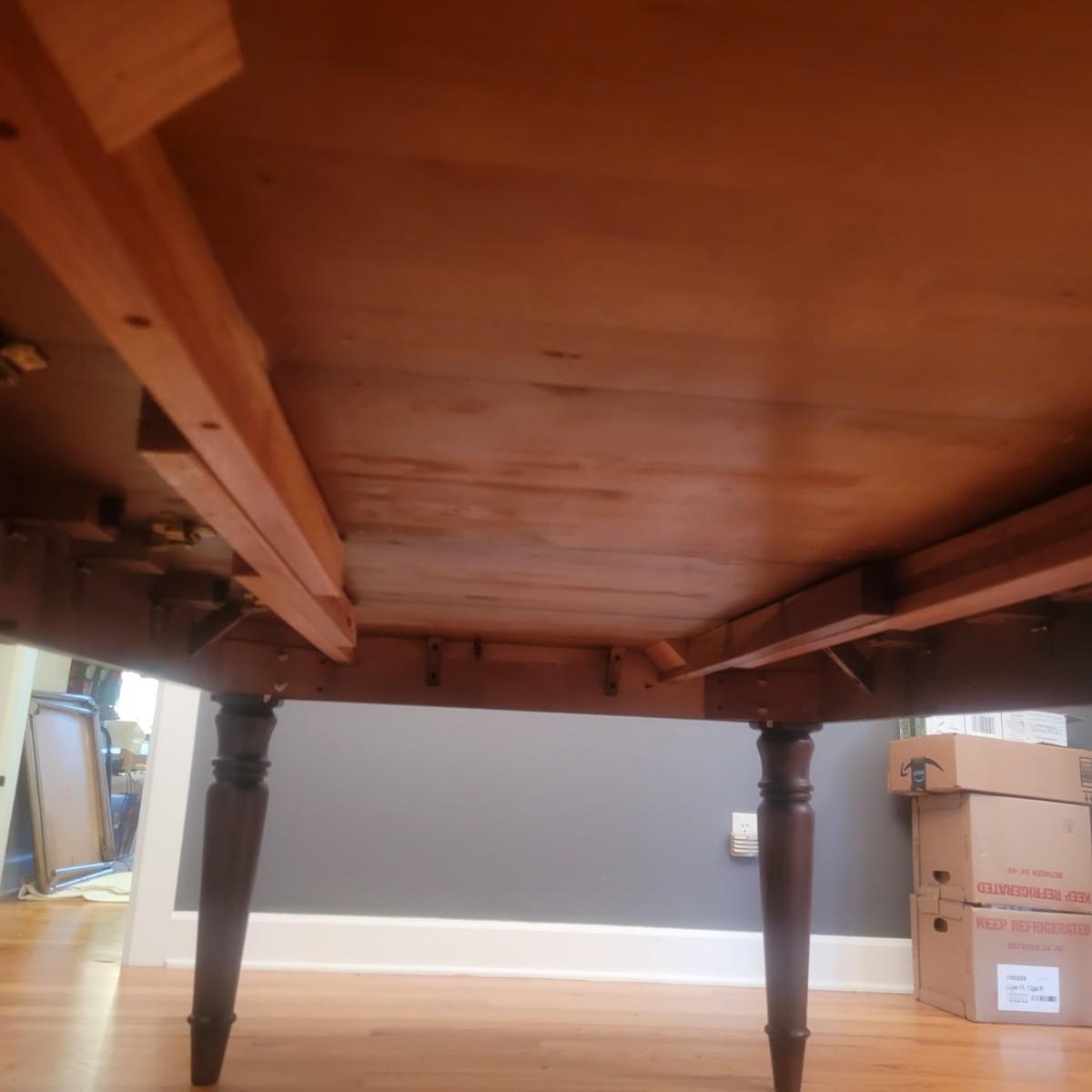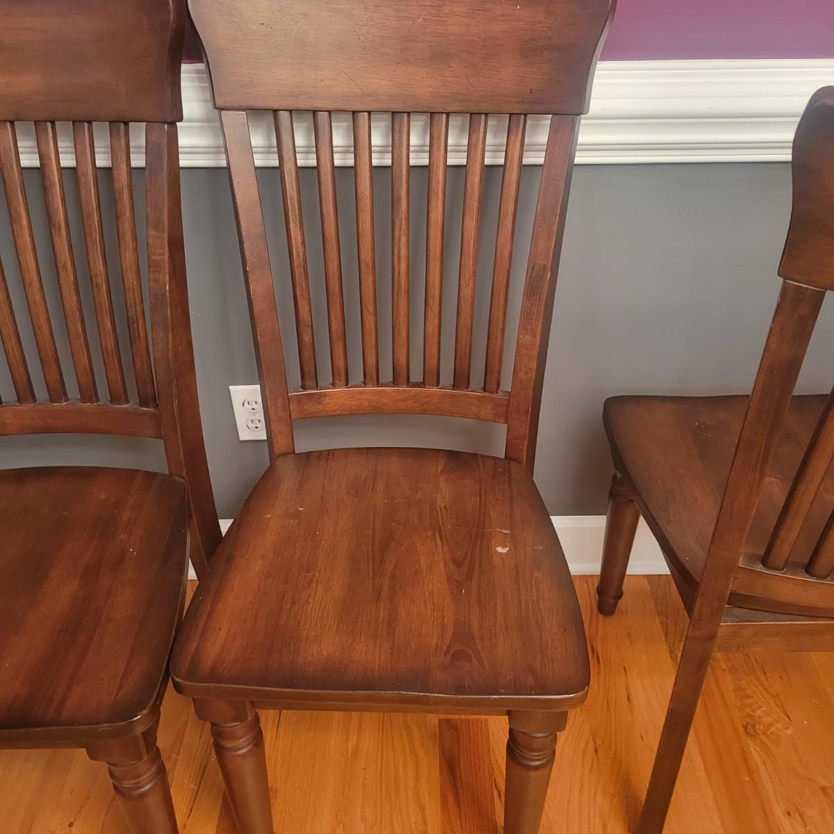A solid wood Hsien Yang dining room table and eight chairs. The dining room table is made of solid wood and features a rich dark brown stain. It has two 18" leafs. Without the leafs, the table measures approximately 44" x 45" x 30". Also included are eight matching chairs made of solid wood as well, that measure approximately 20" x 23" x 41.5" with a seat height of 18". Table and chairs are in mostly good condition with some scratches and blemishes, including some paint splatters. Local pickup only. Winning bidder must bring assistance to help move and load these items due to their weight and/or size.