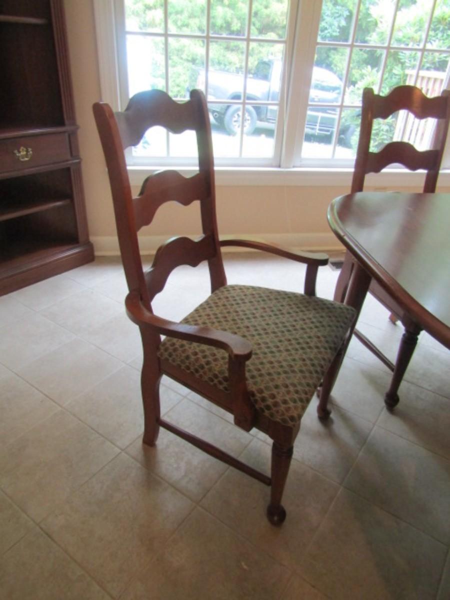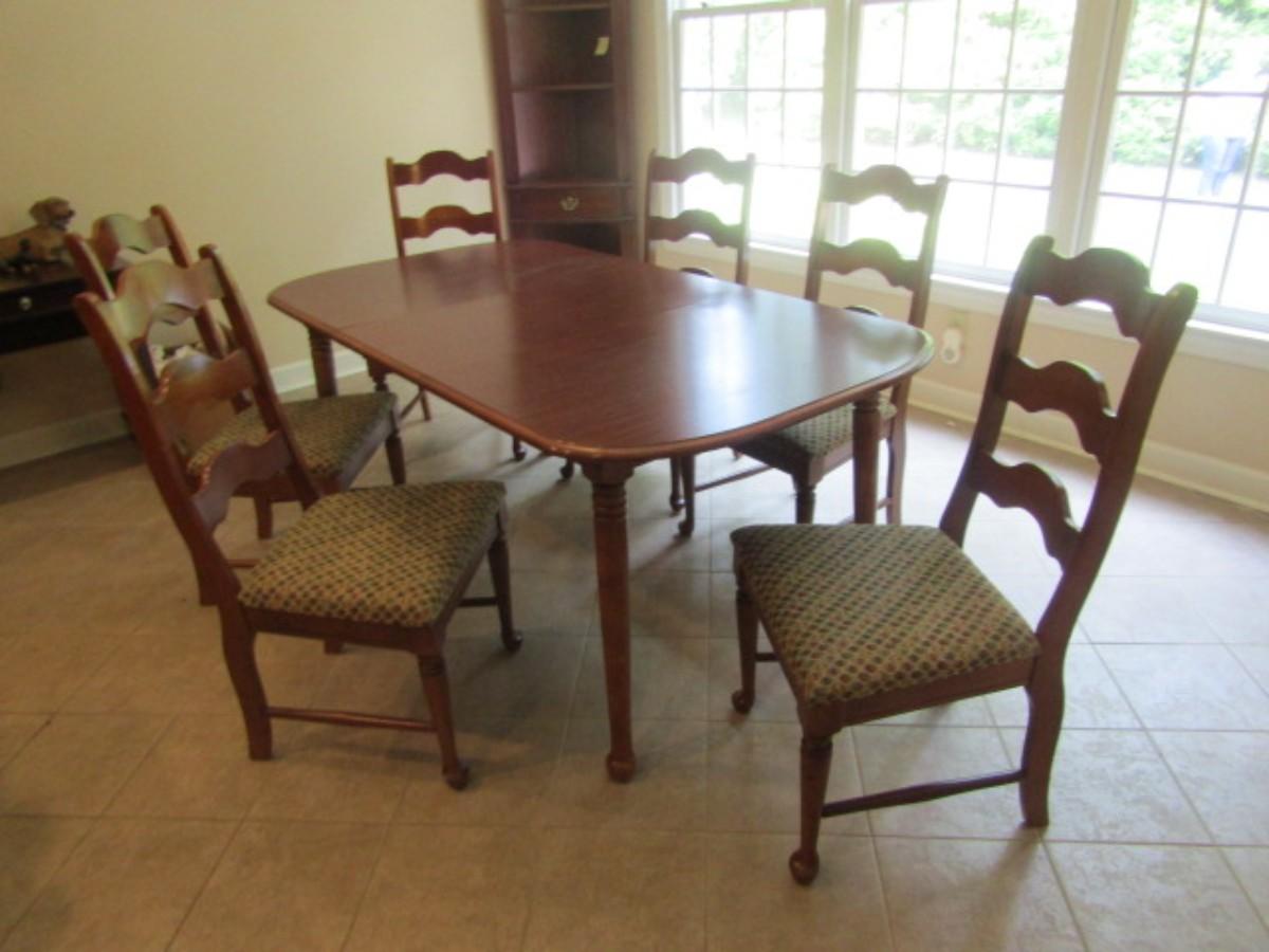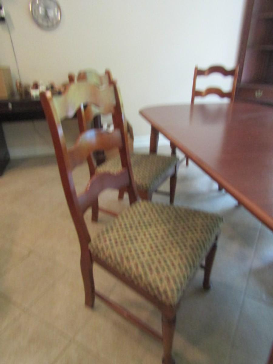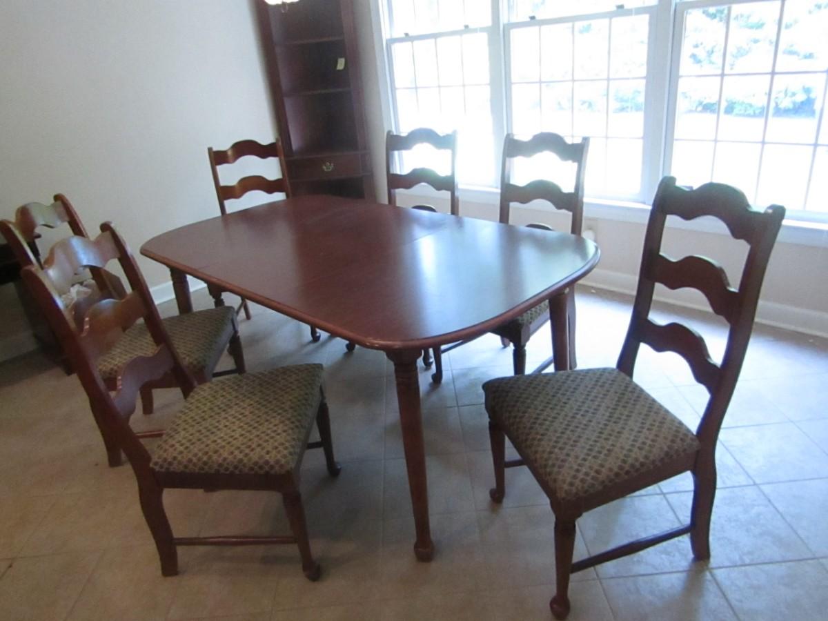 Wood Finish Dining Room Table with Six Matching Ladder Back Chairs