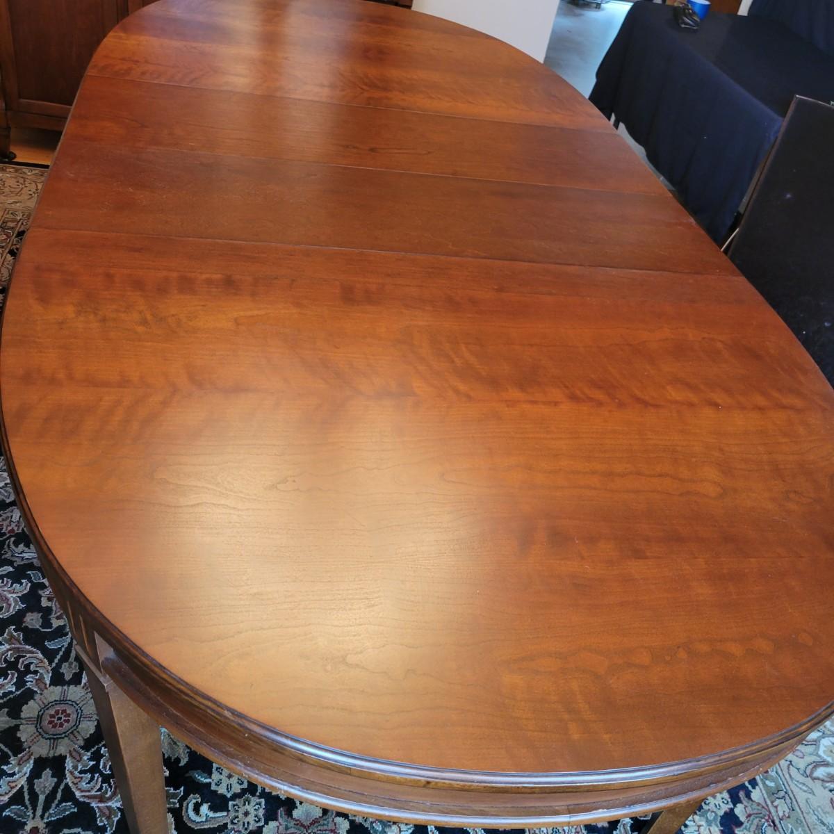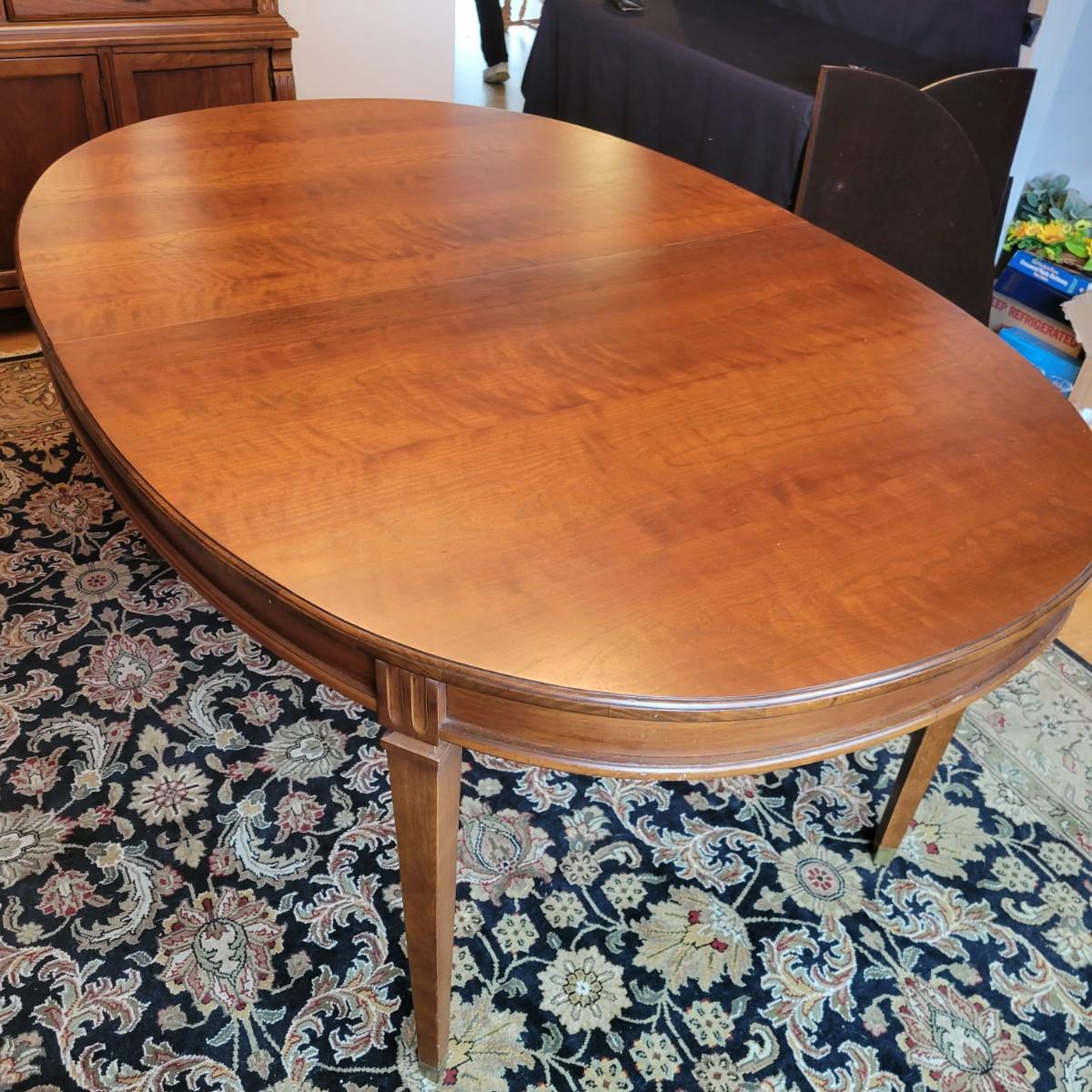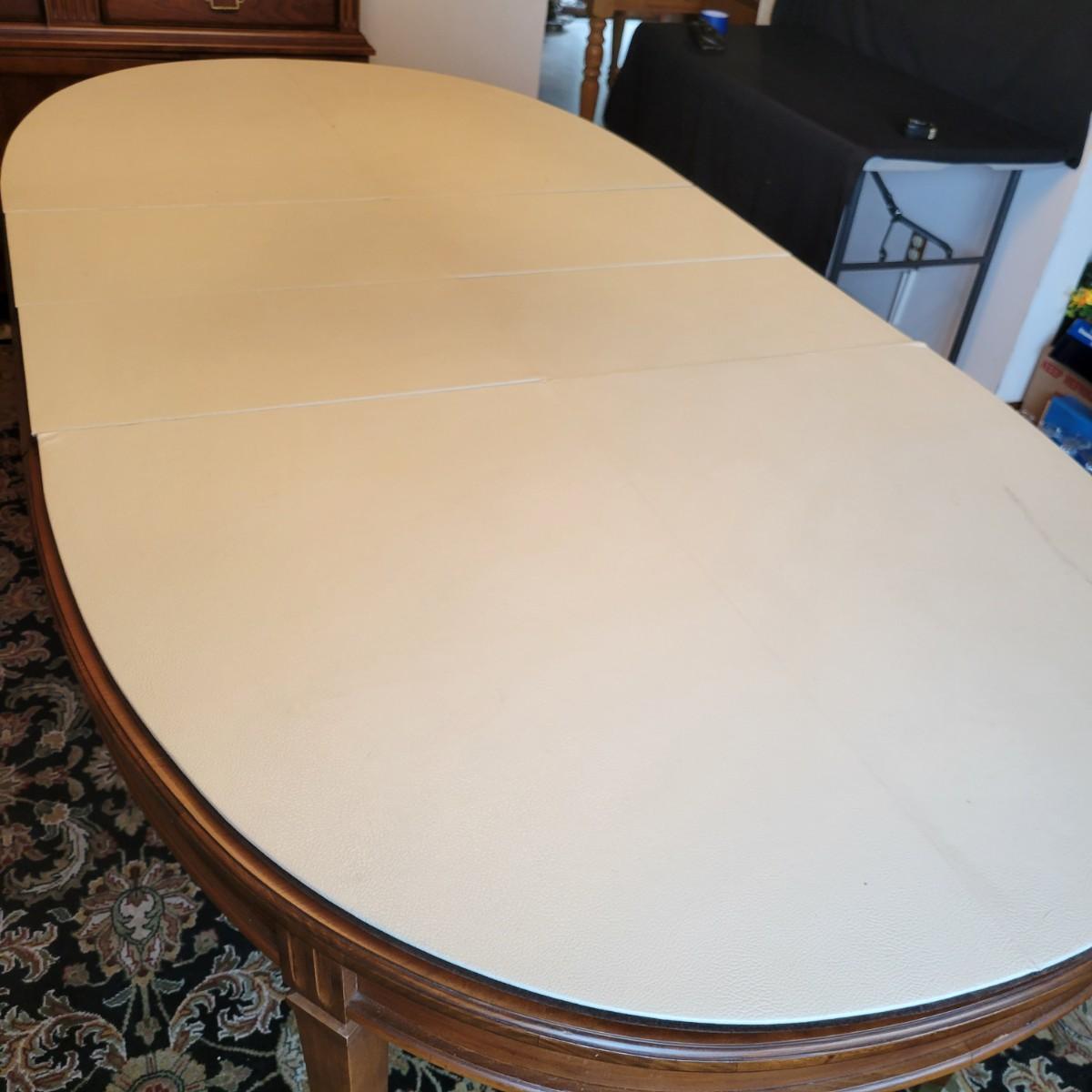 A solid wood dining room table that includes two 10” W leaves and a four piece table cover. This table measures approximately 64.5" x 44" x 30”H at its smallest (without leaves). There are some minor scratches on the table surface. Local pickup only. Winning bidder must bring assistance to help move and load this item due to its weight and/or size.