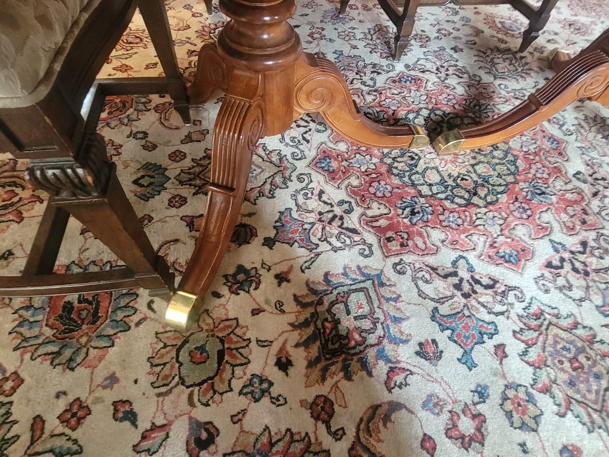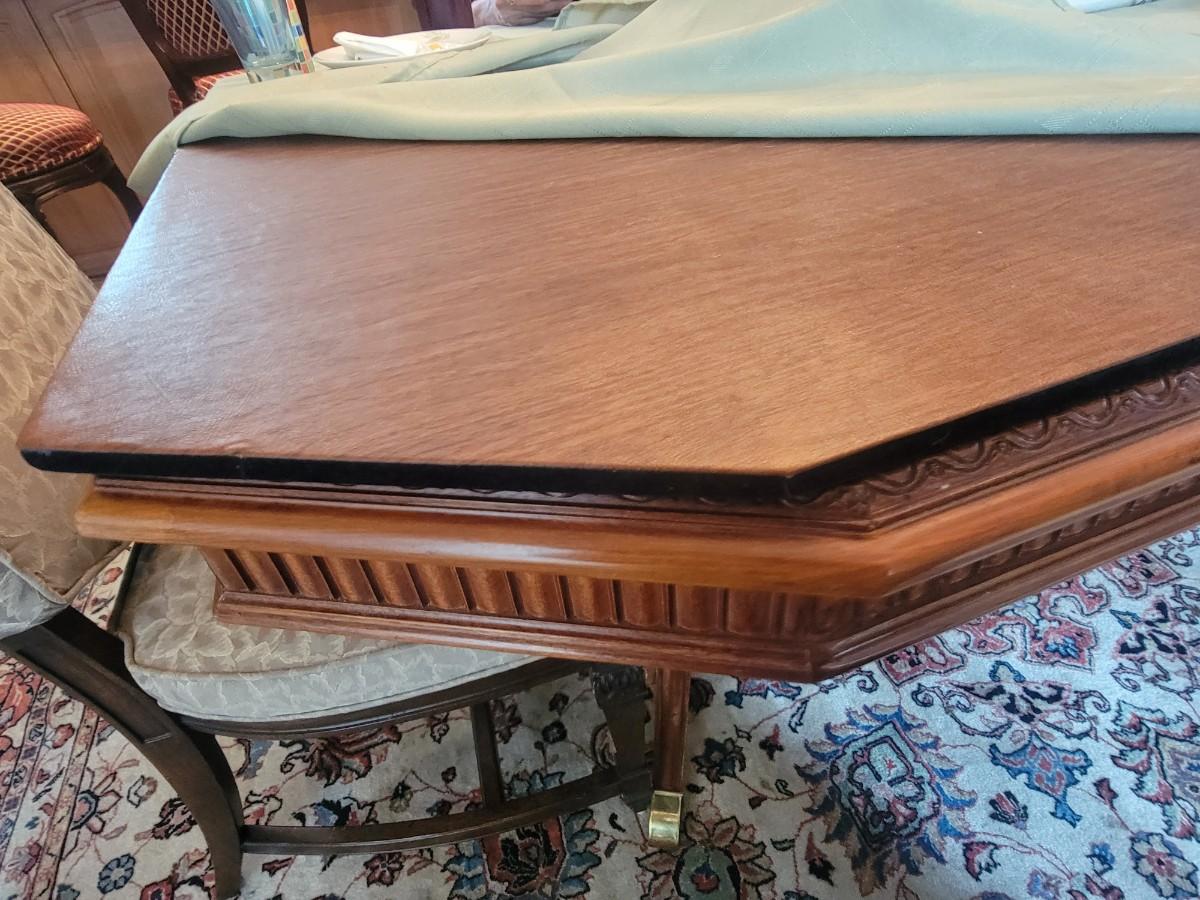 Very nice table, circa 1970, large base, 8 chairs, two leafs, near perfect.,