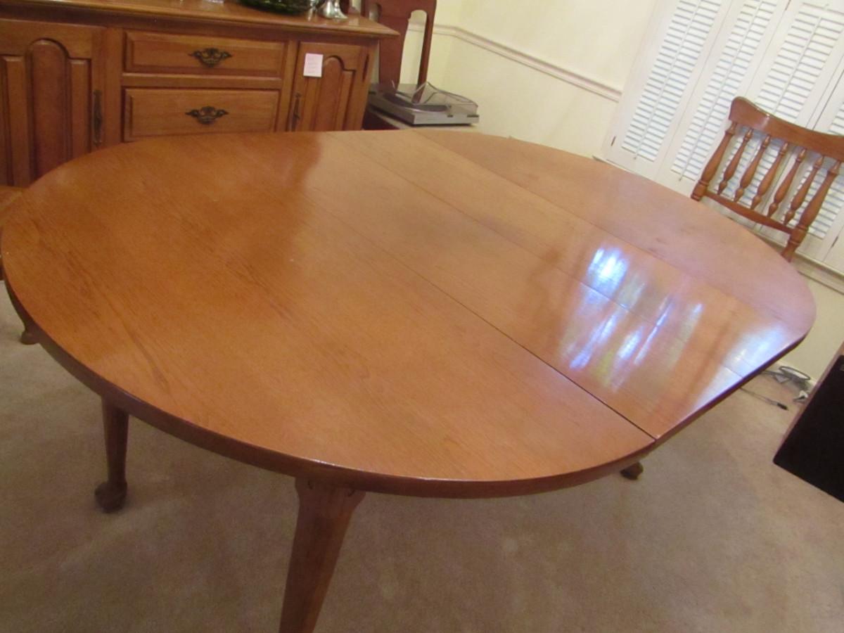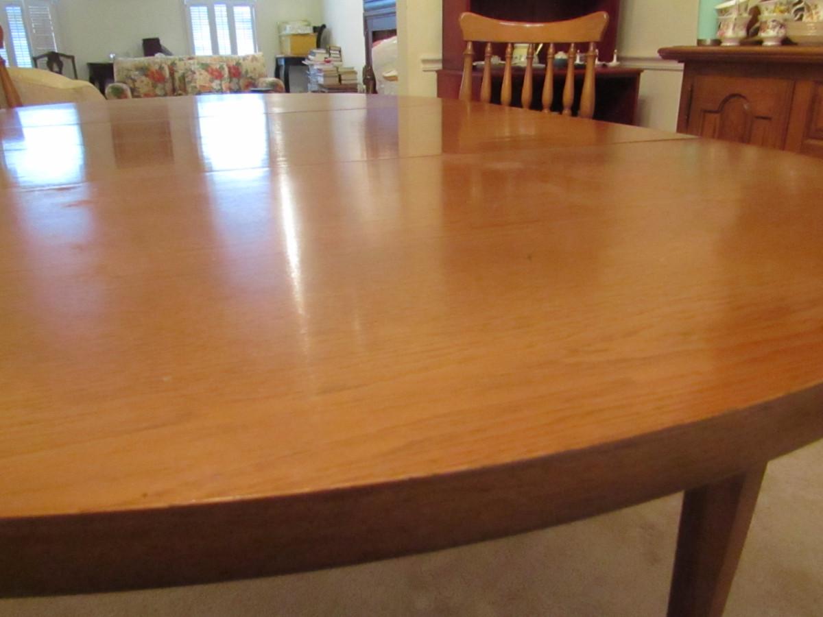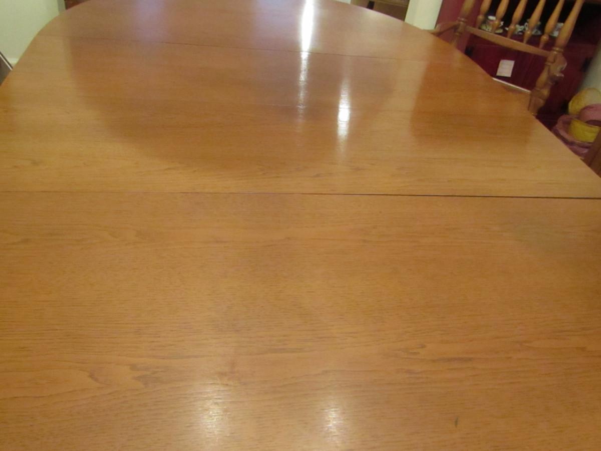 Solid Wood Dining Table. Total length with both leaves (12" each) added is 68". Table comes with protective pad top.