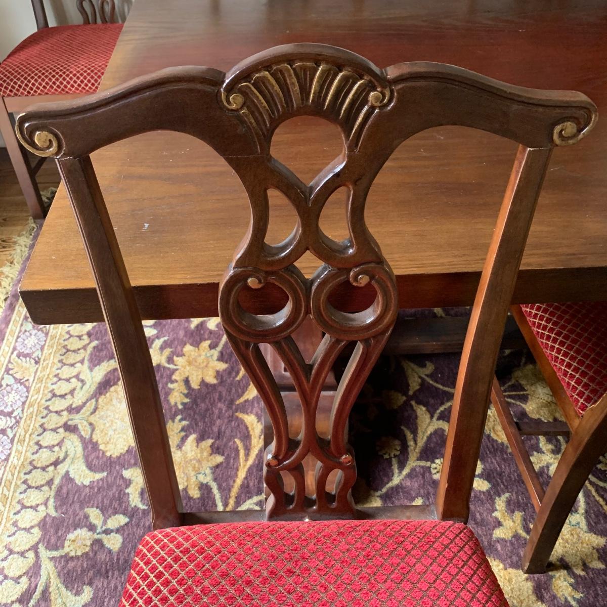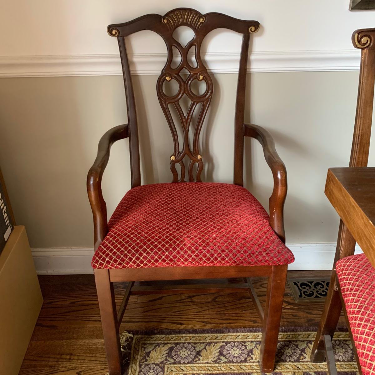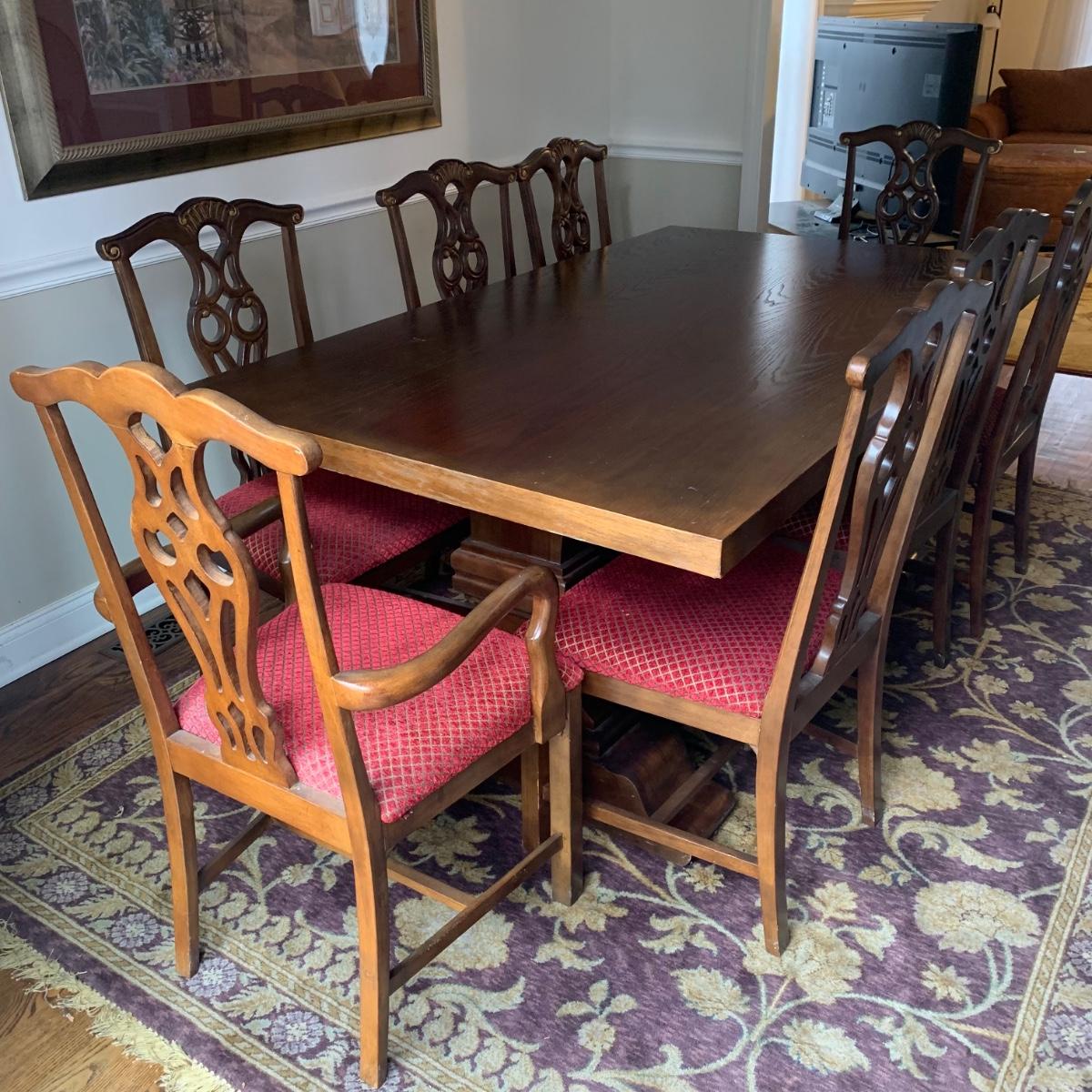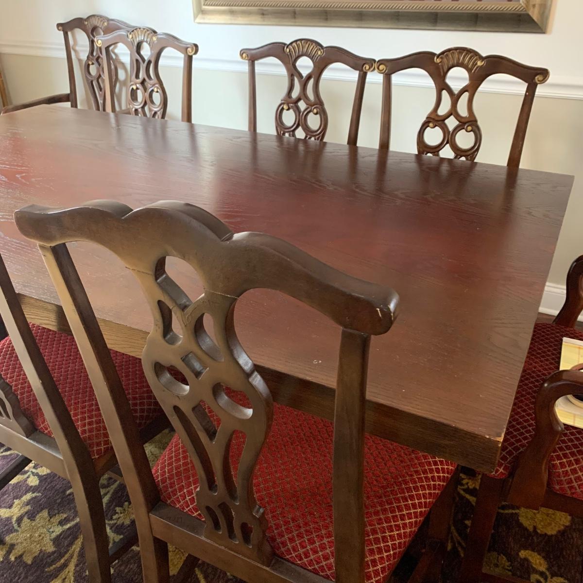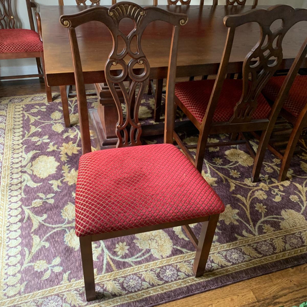 Solid wood dining table comes with eight chairs, including two armchairs. Both the table and chairs are crafted from solid wood. The chairs feature gold painted accents on the wood and upholstery in red and gold fabric adorned with diamond-shaped designs. Although the table's top shows signs of sun spotting and blemishes, it can be easily restored through refinishing.