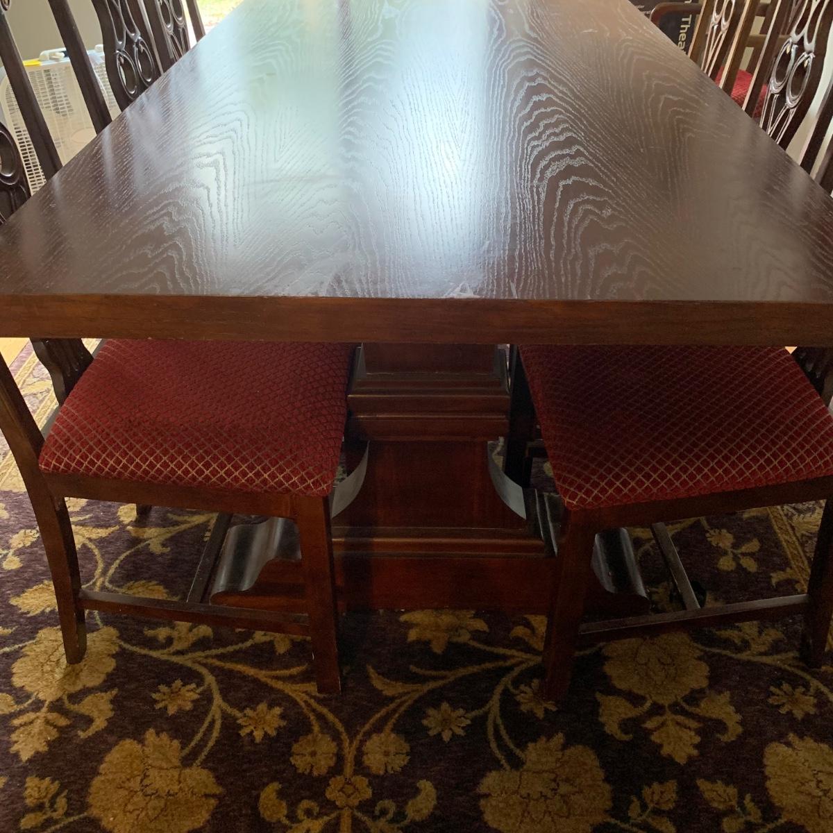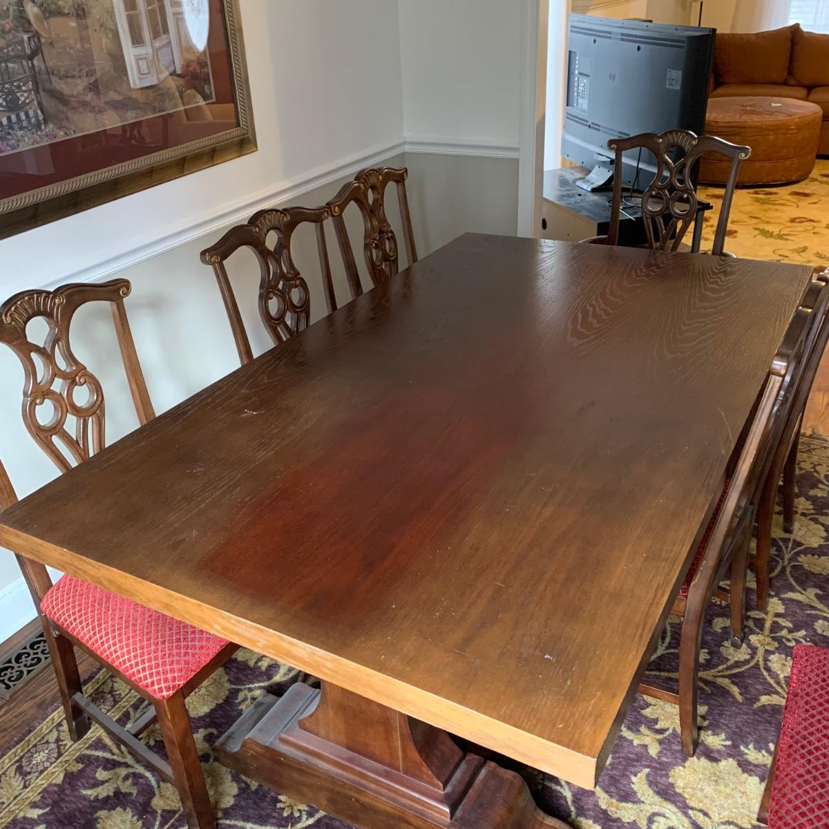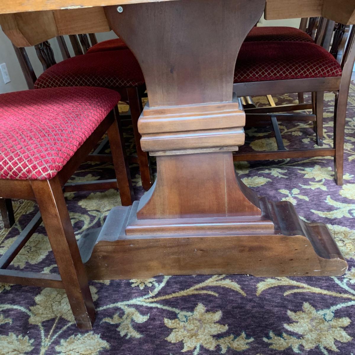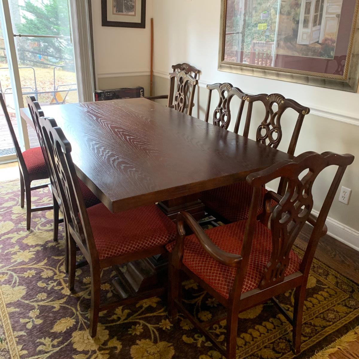 Solid wood dining table comes with eight chairs, including two armchairs. Both the table and chairs are crafted from solid wood. The chairs feature gold painted accents on the wood and upholstery in red and gold fabric adorned with diamond-shaped designs. Although the table's top shows signs of sun spotting and blemishes, it can be easily restored through refinishing.