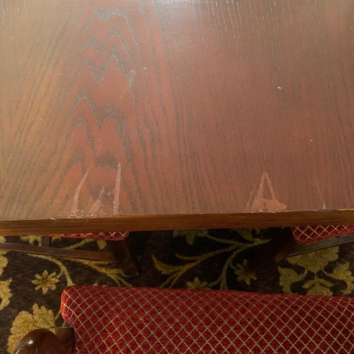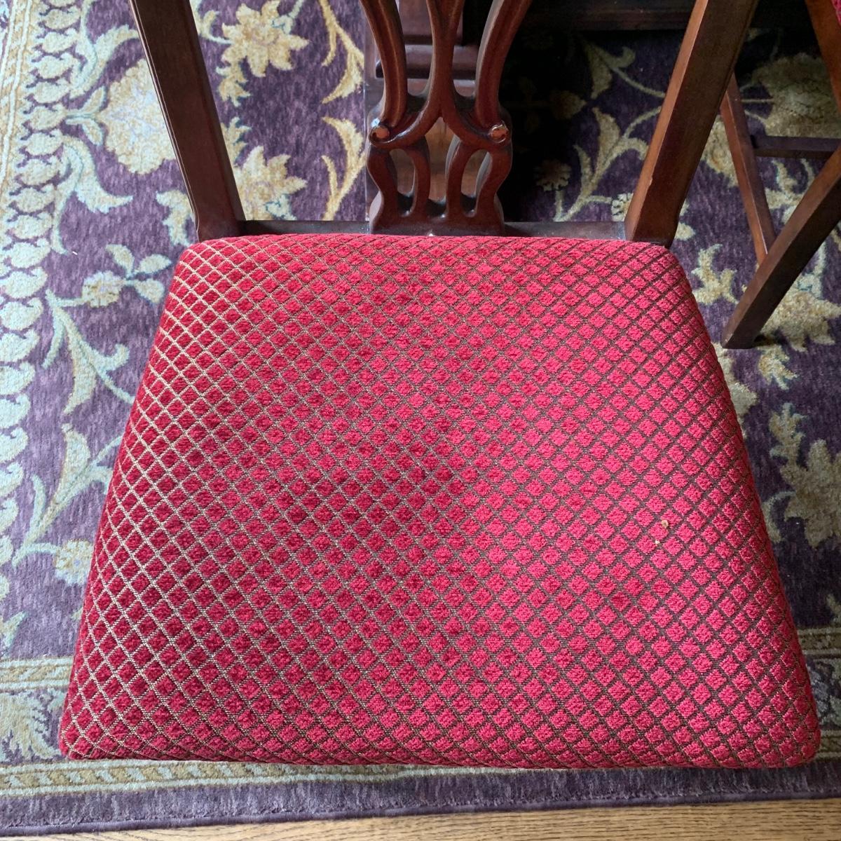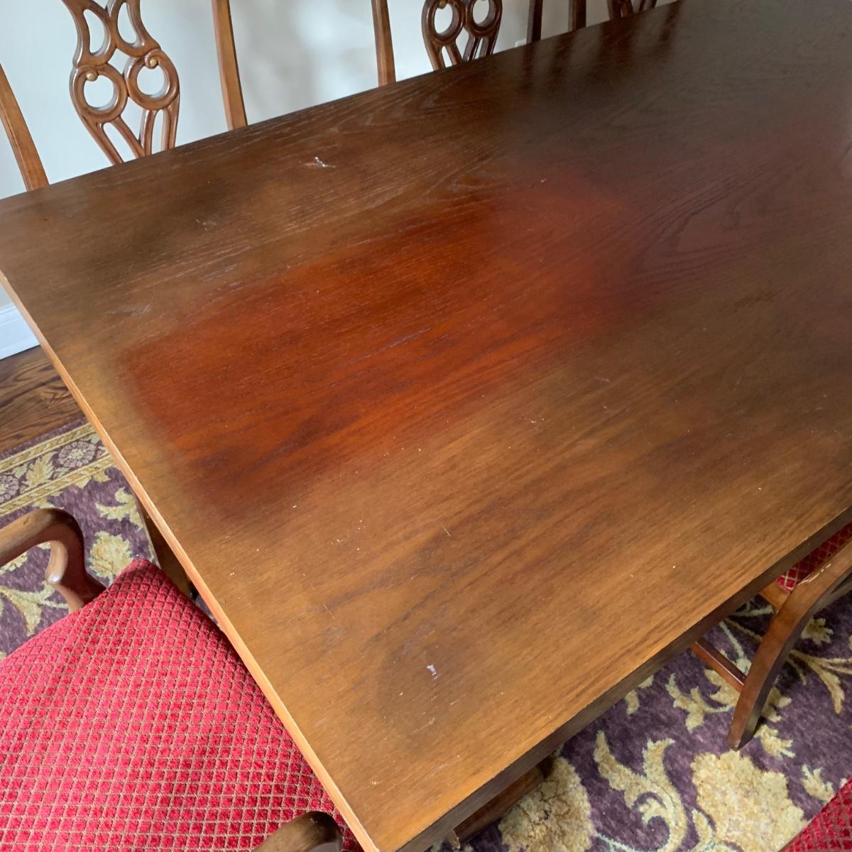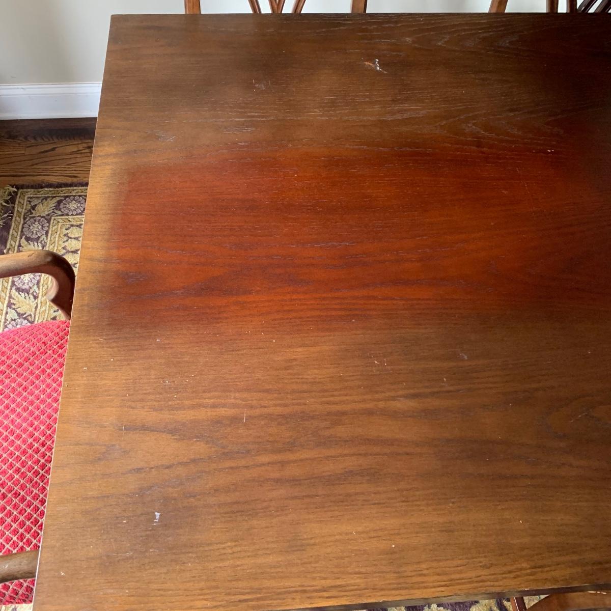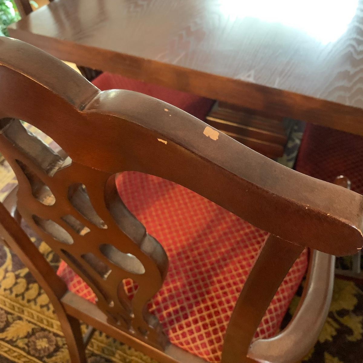 Solid wood dining table comes with eight chairs, including two armchairs. Both the table and chairs are crafted from solid wood. The chairs feature gold painted accents on the wood and upholstery in red and gold fabric adorned with diamond-shaped designs. Although the table's top shows signs of sun spotting and blemishes, it can be easily restored through refinishing.