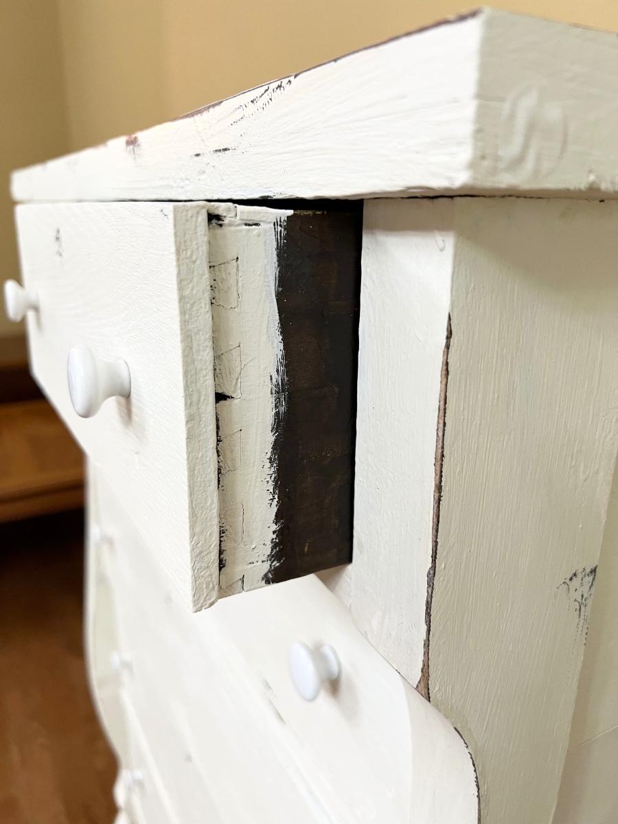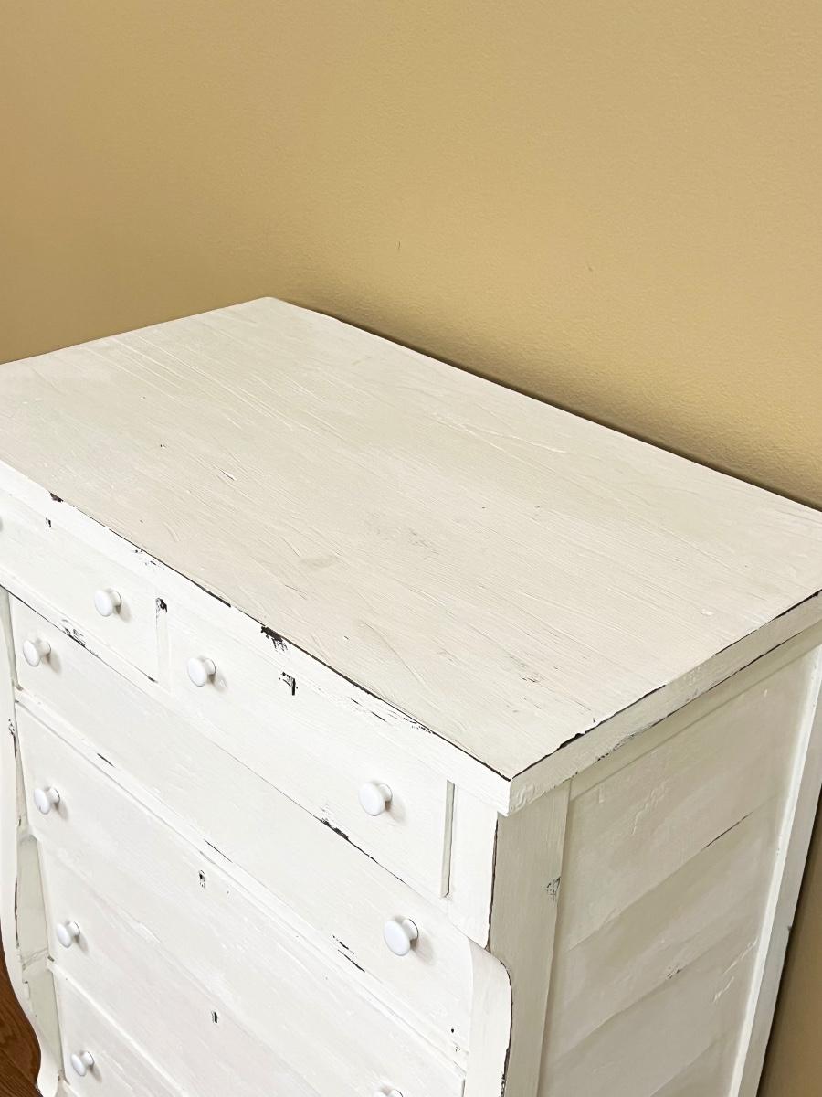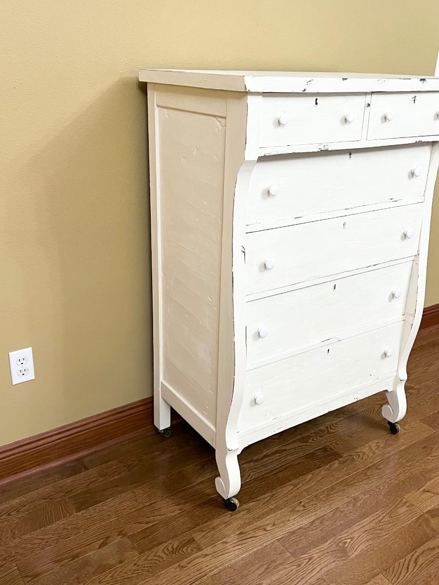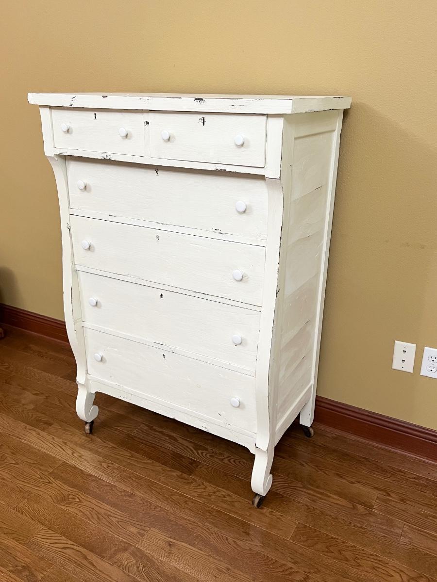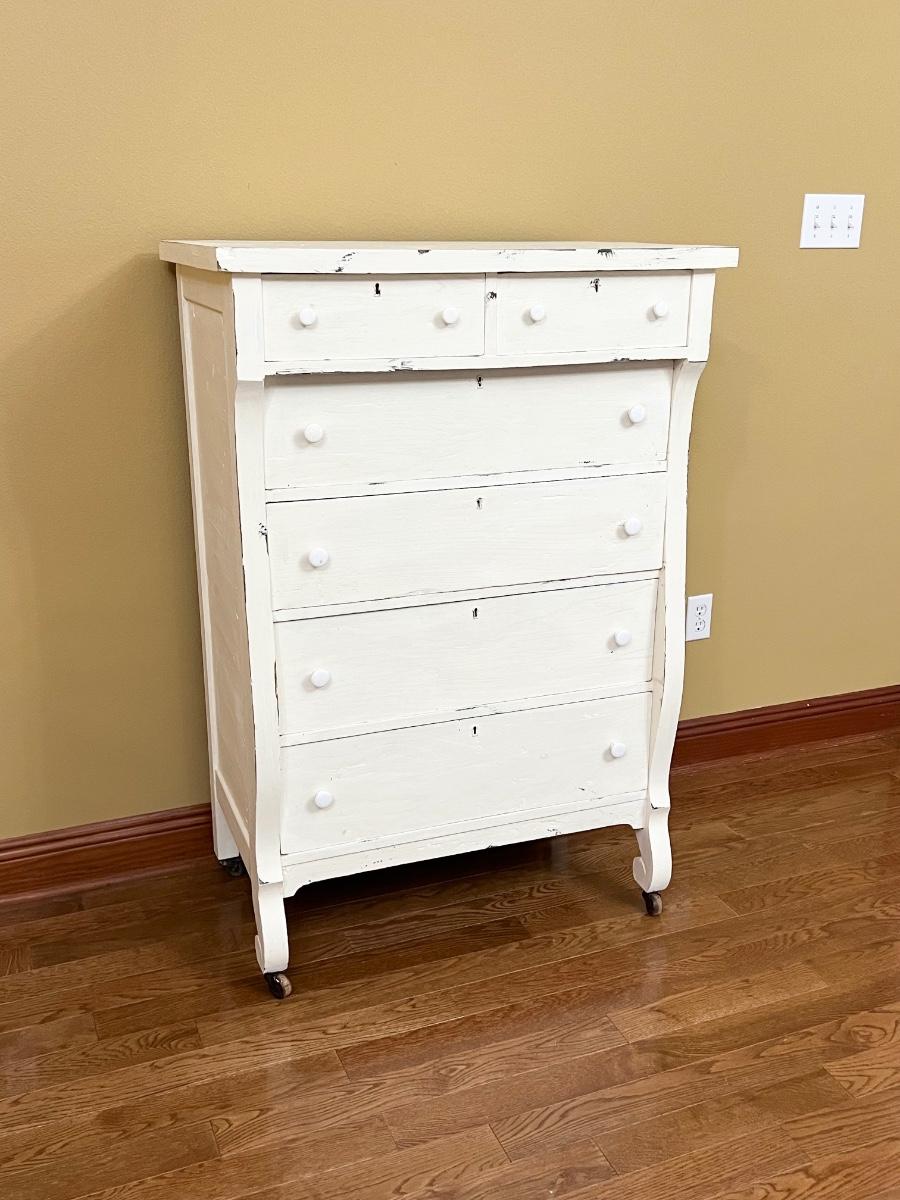 Wooden Wheels ~ Dresser has been painted white with a little distressing ~ Does not have key ~ 50” H x 34” W x 20” D