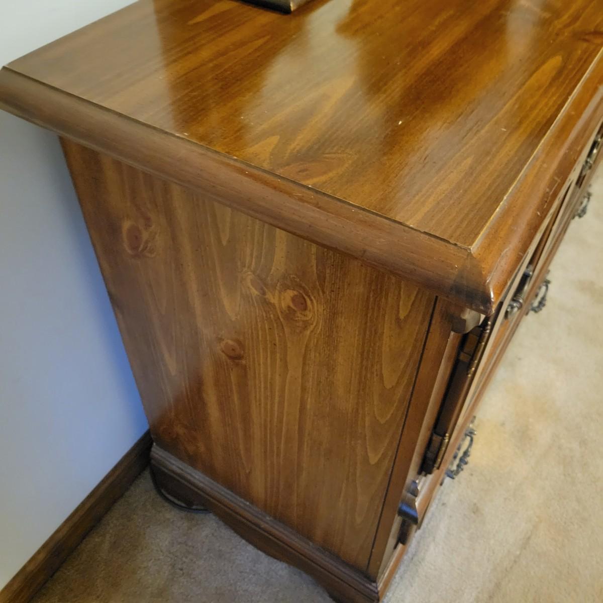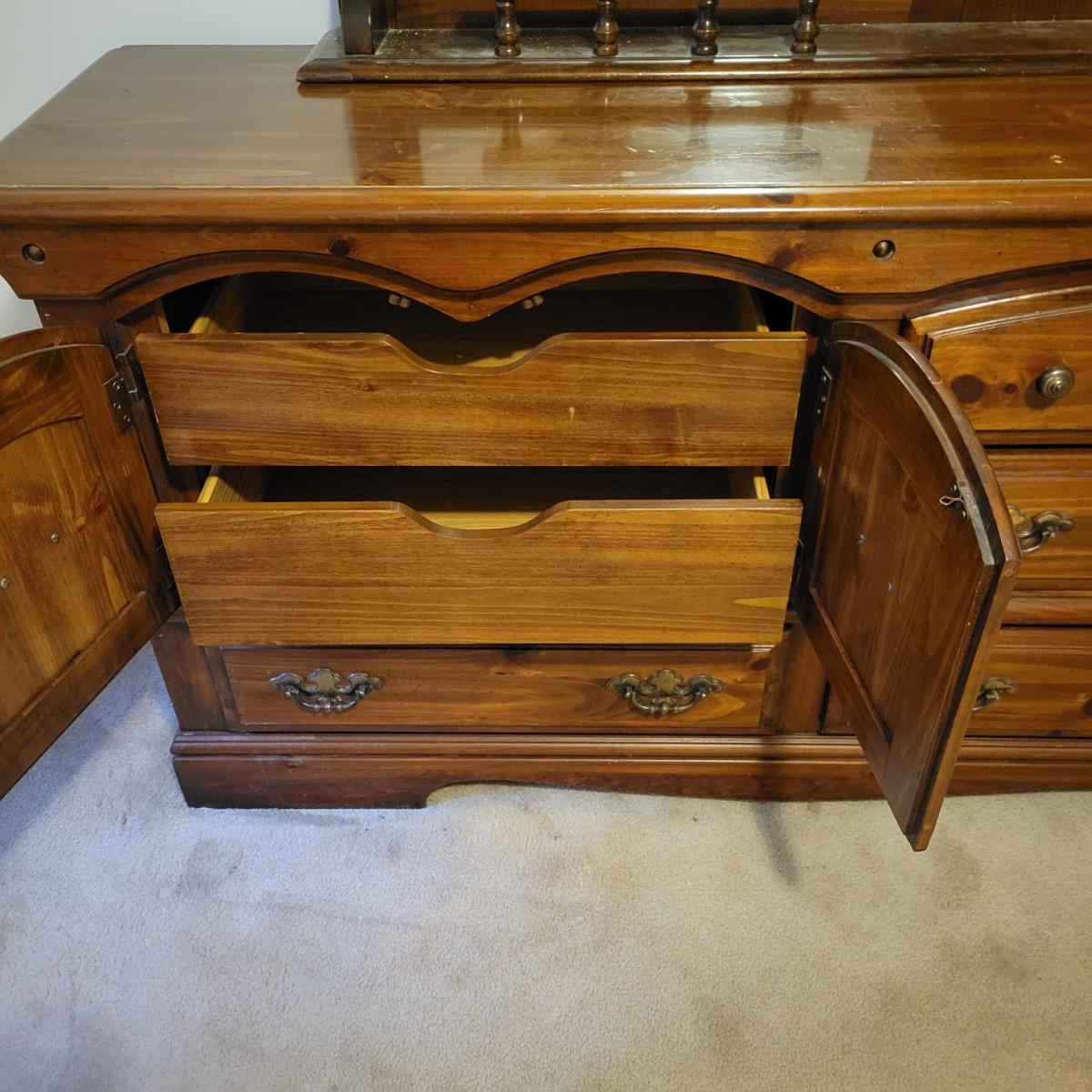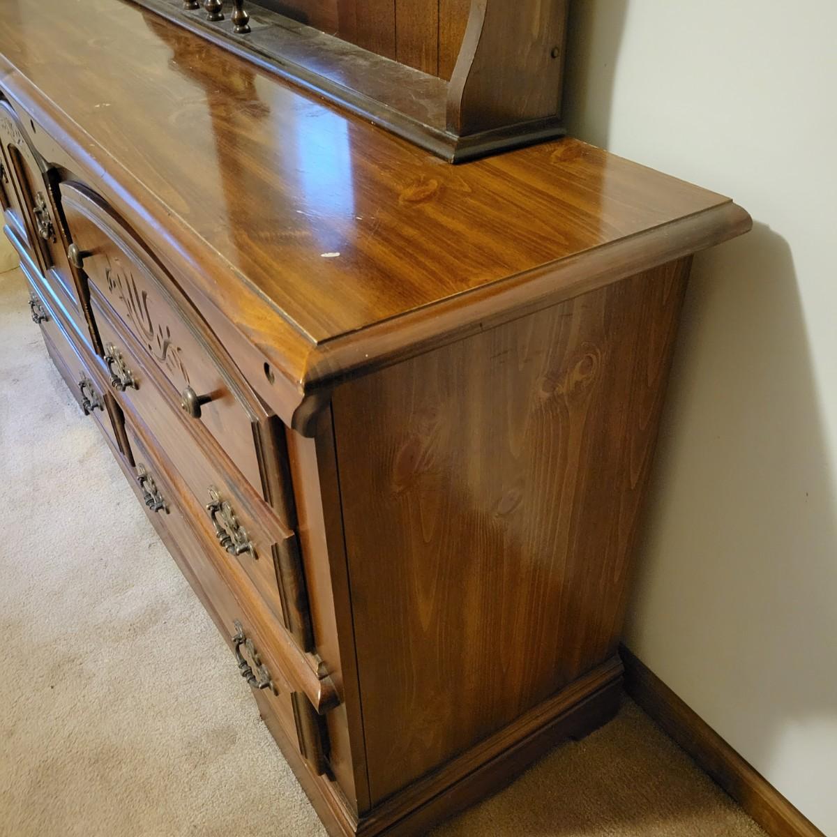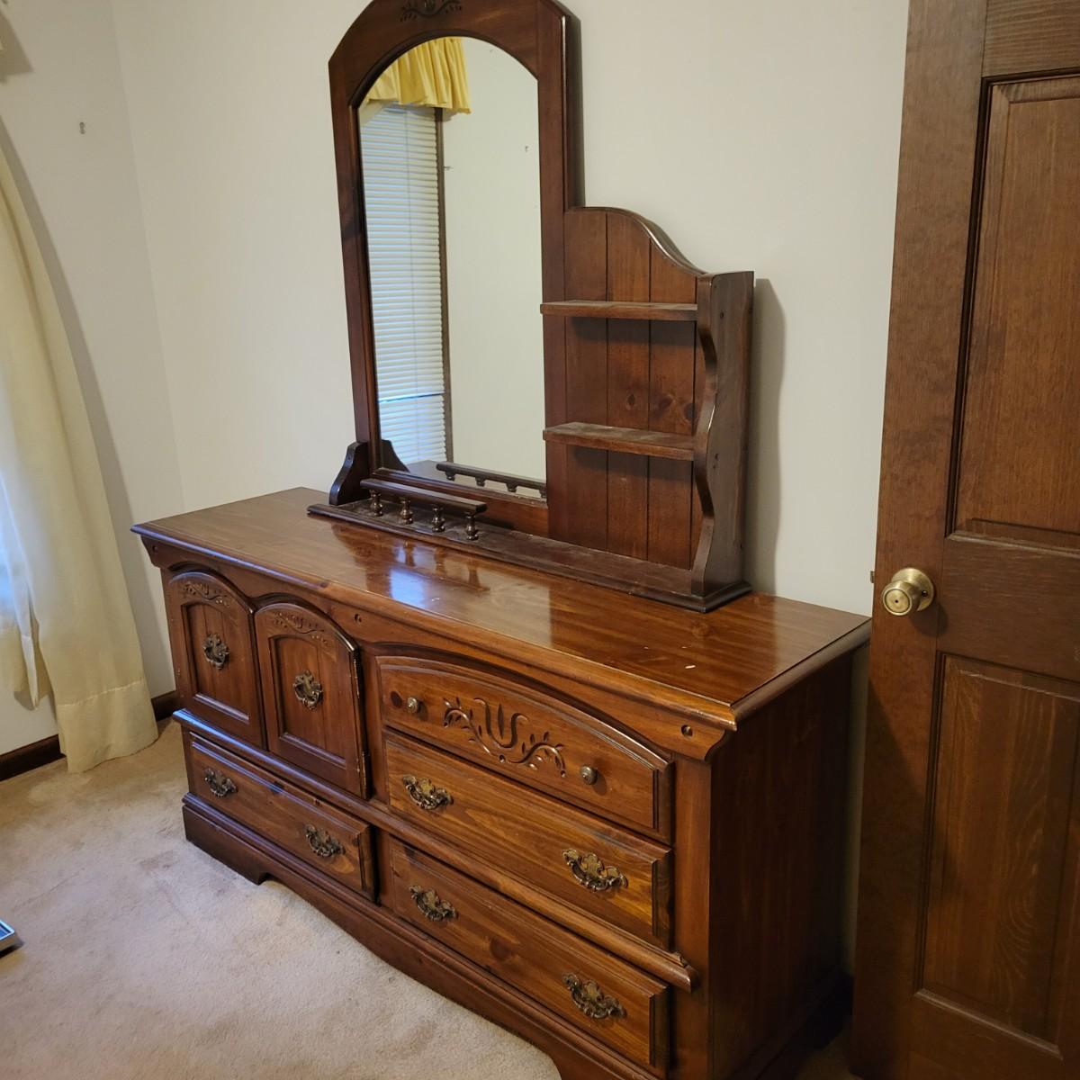 A solid wood dresser with a mirror that sits on top of it. This dresser features a dark brown stain and brass hardware. It has four drawers and a cabinet that opens to two pull out drawers. Measures approximately 64" x 18" x 84". Local pickup only. Winning bidder must bring assistance to help move and load this item due to its weight and/or size.