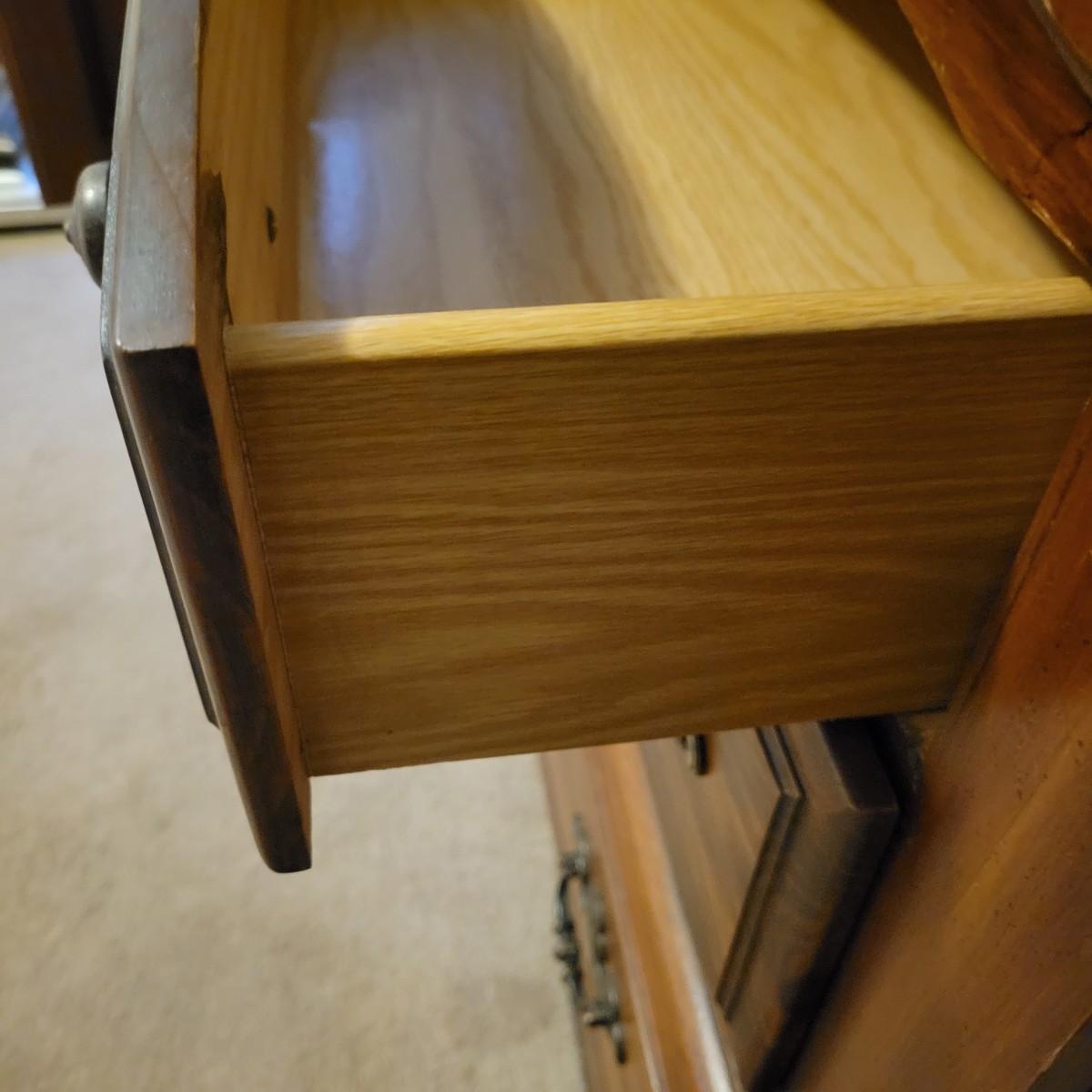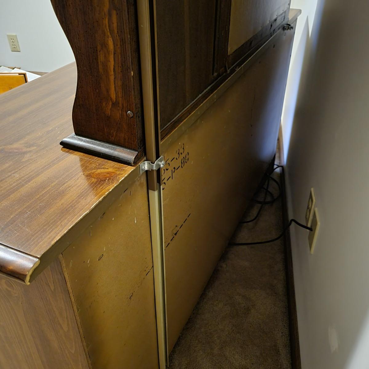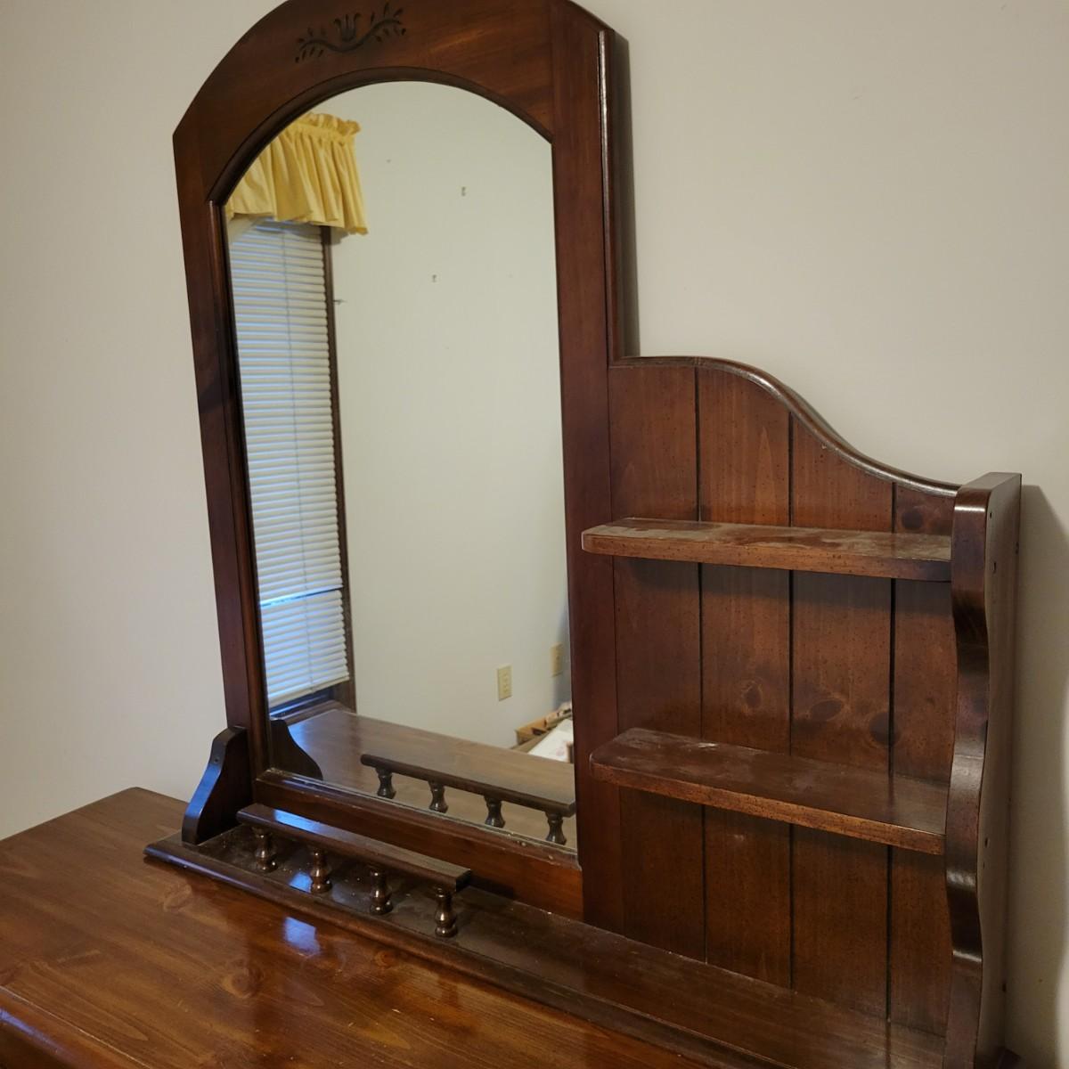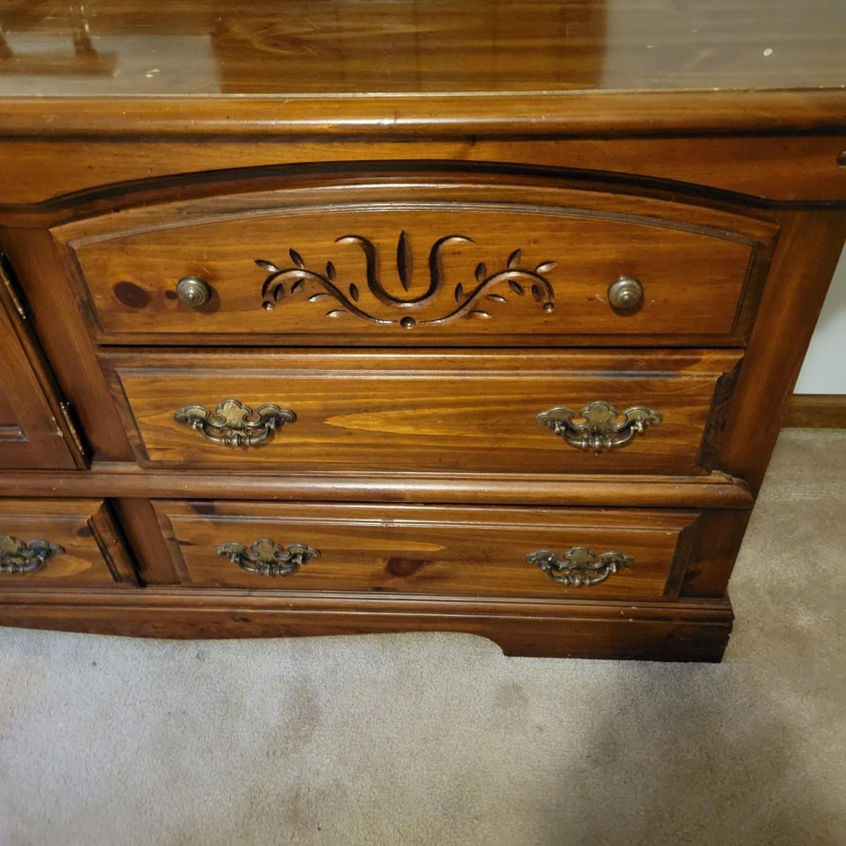A solid wood dresser with a mirror that sits on top of it. This dresser features a dark brown stain and brass hardware. It has four drawers and a cabinet that opens to two pull out drawers. Measures approximately 64" x 18" x 84". Local pickup only. Winning bidder must bring assistance to help move and load this item due to its weight and/or size.