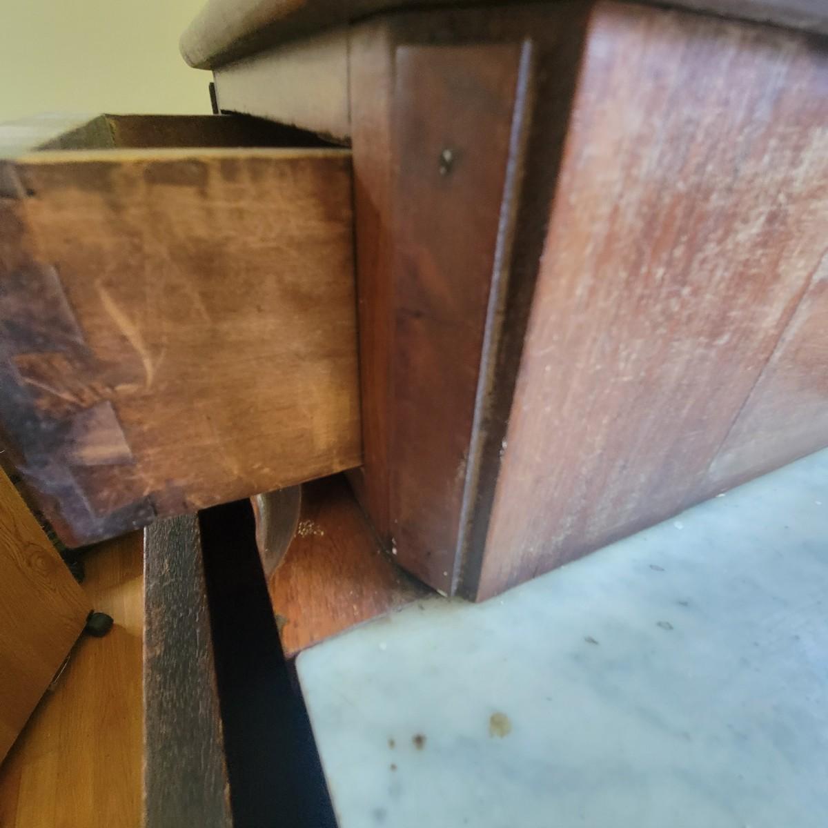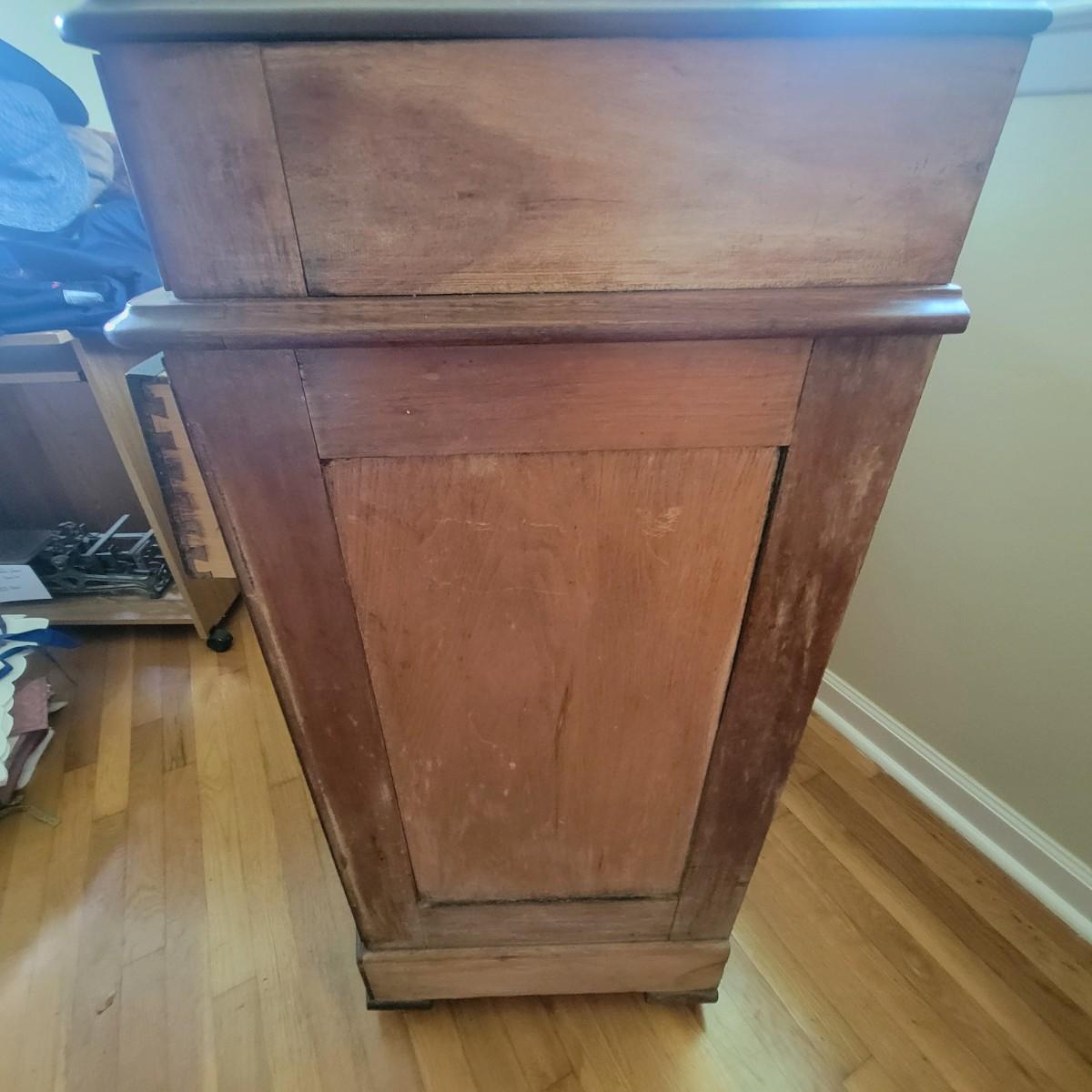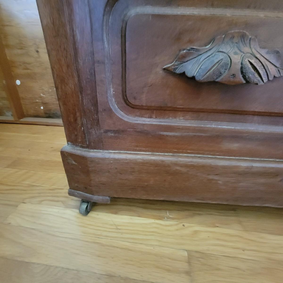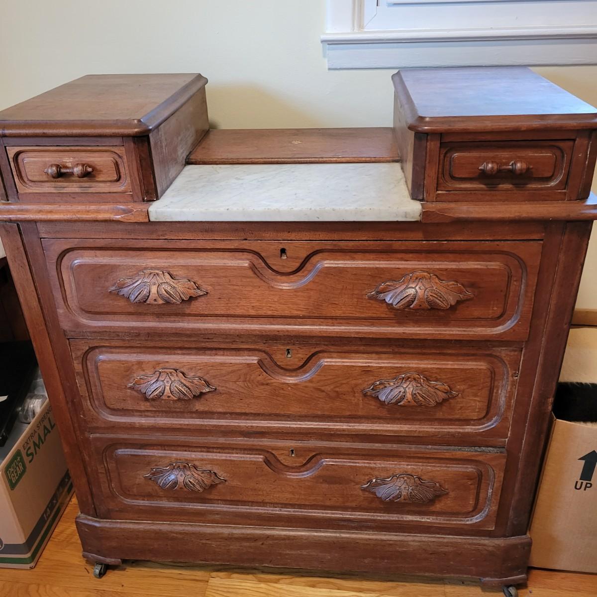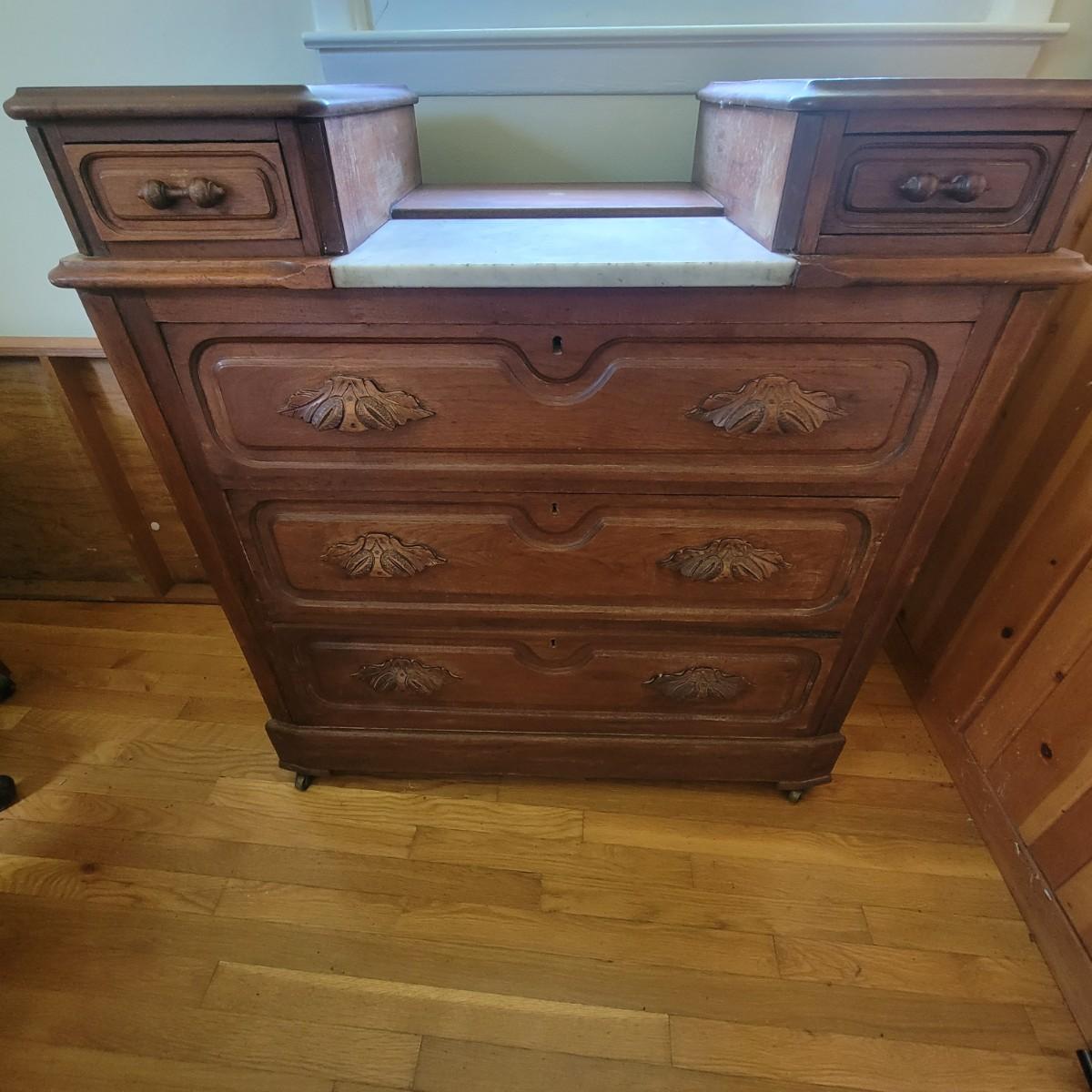 Dresser with a small marble top, 5 drawers and brass wheels. Drawers have carved wood handles and are dovetailed. Drawers open, but do require some effort. Marble is intact with no cracks and there is no key for the locks. Dresser does show its age with some damage and blemishes on the top surface, see attached pictures. Measures approximately 32" x 18" x 42" Local pickup only, please bring help to load.