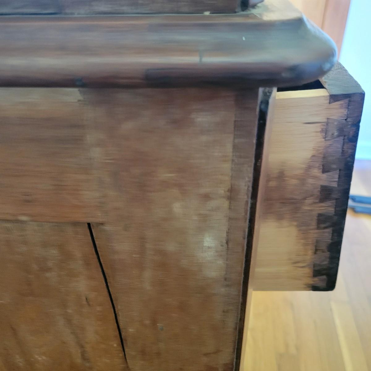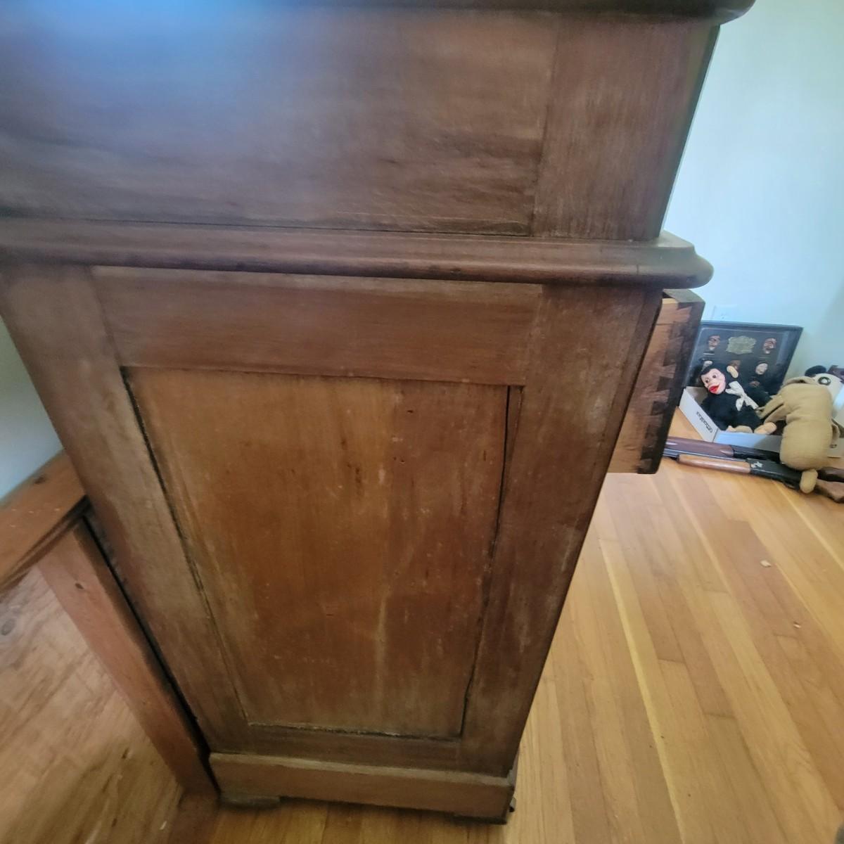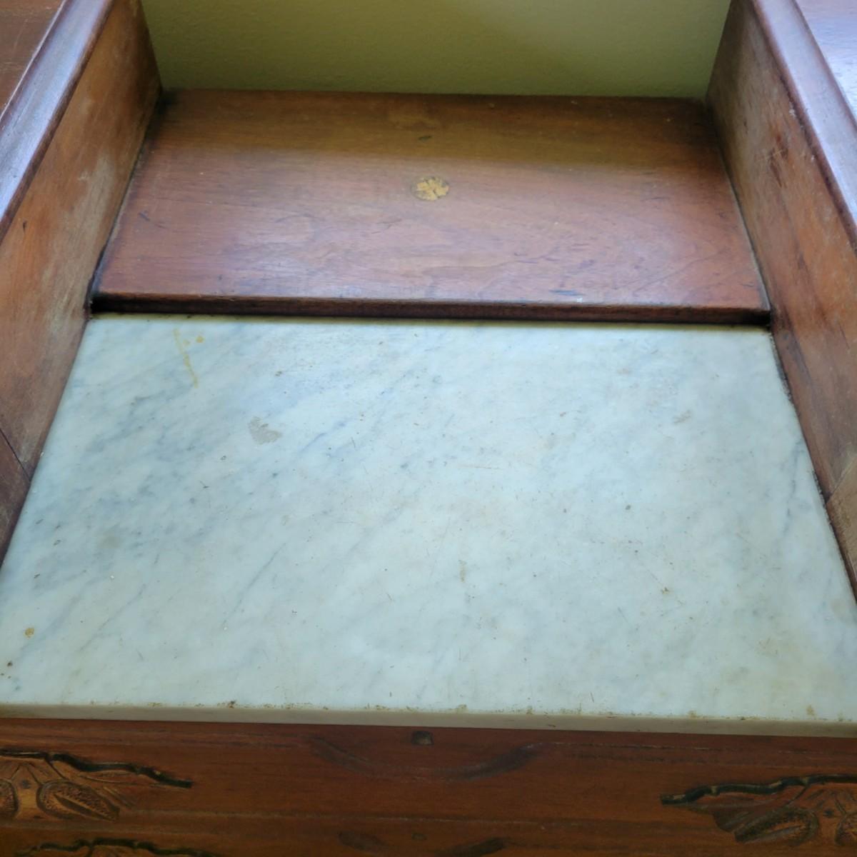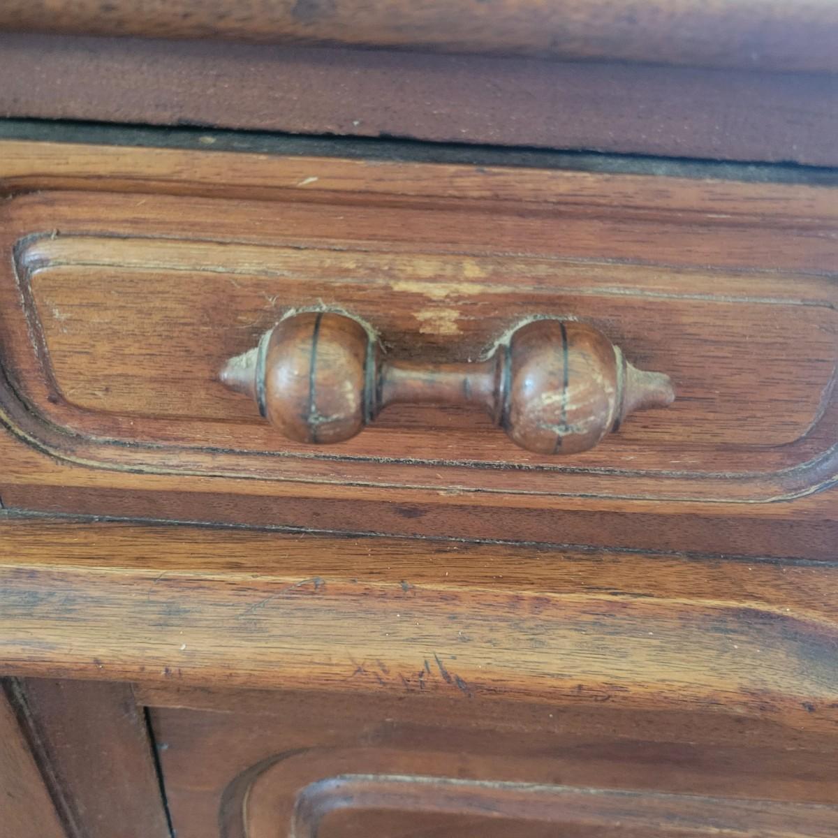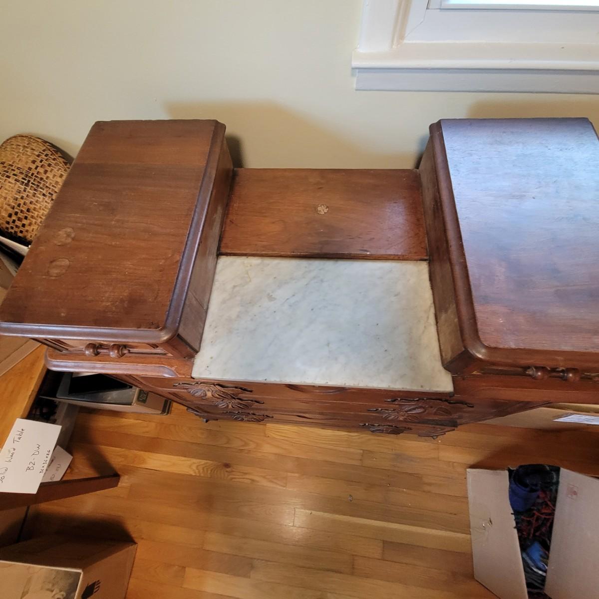 Dresser with a small marble top, 5 drawers and brass wheels. Drawers have carved wood handles and are dovetailed. Drawers open, but do require some effort. Marble is intact with no cracks and there is no key for the locks. Dresser does show its age with some damage and blemishes on the top surface, see attached pictures. Measures approximately 32" x 18" x 42" Local pickup only, please bring help to load.