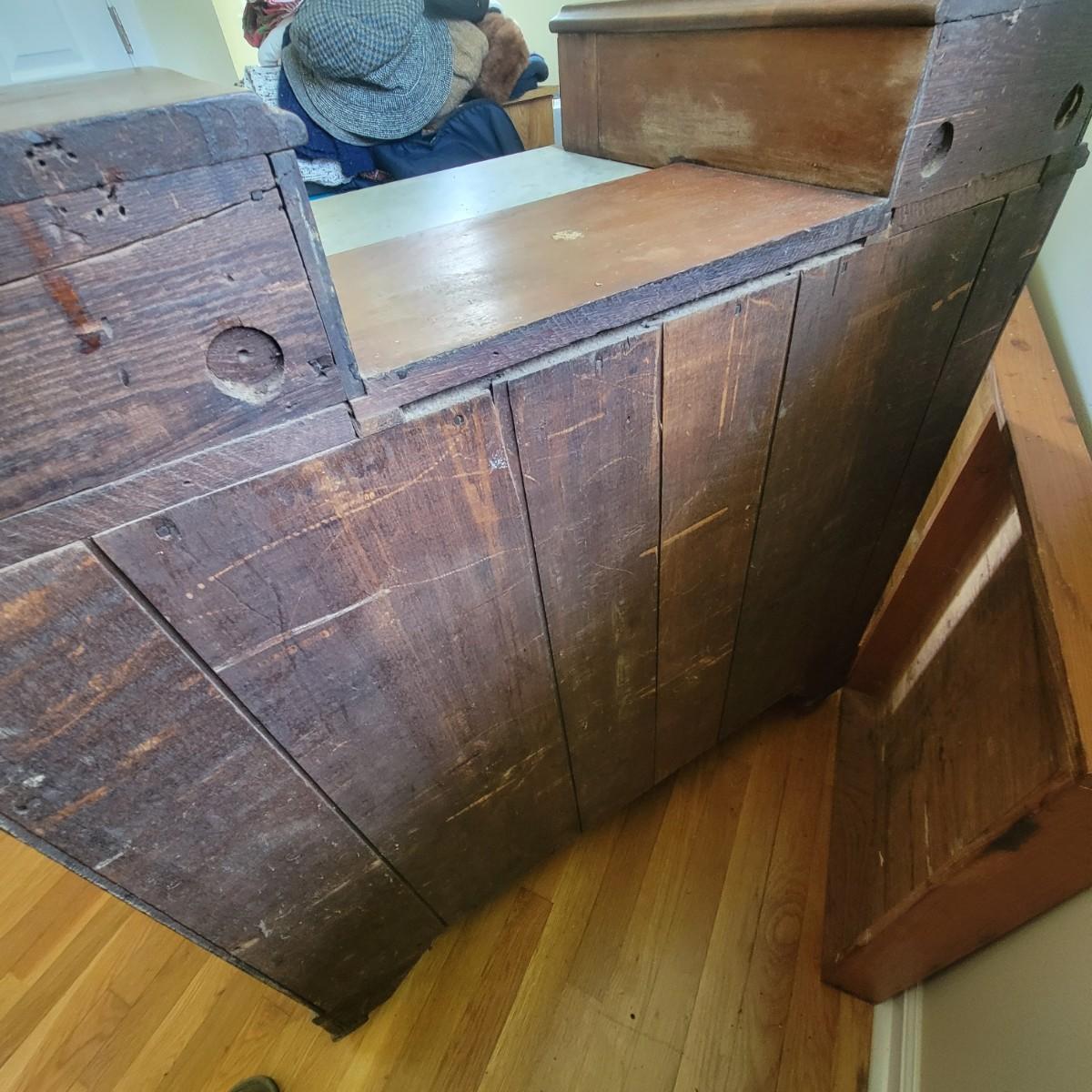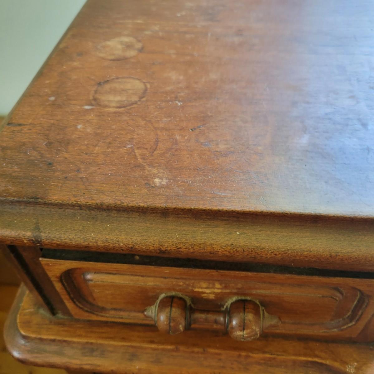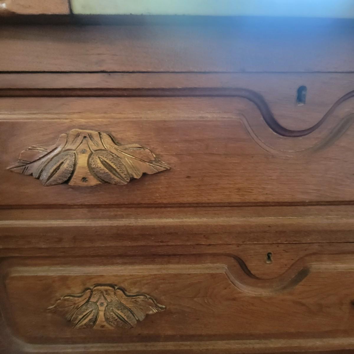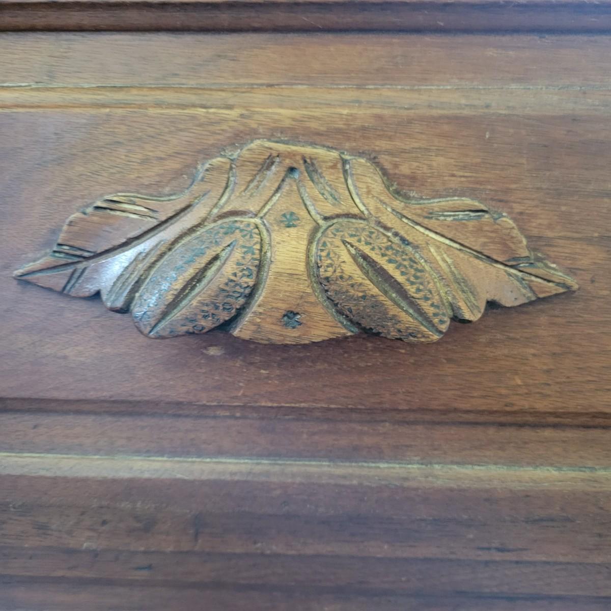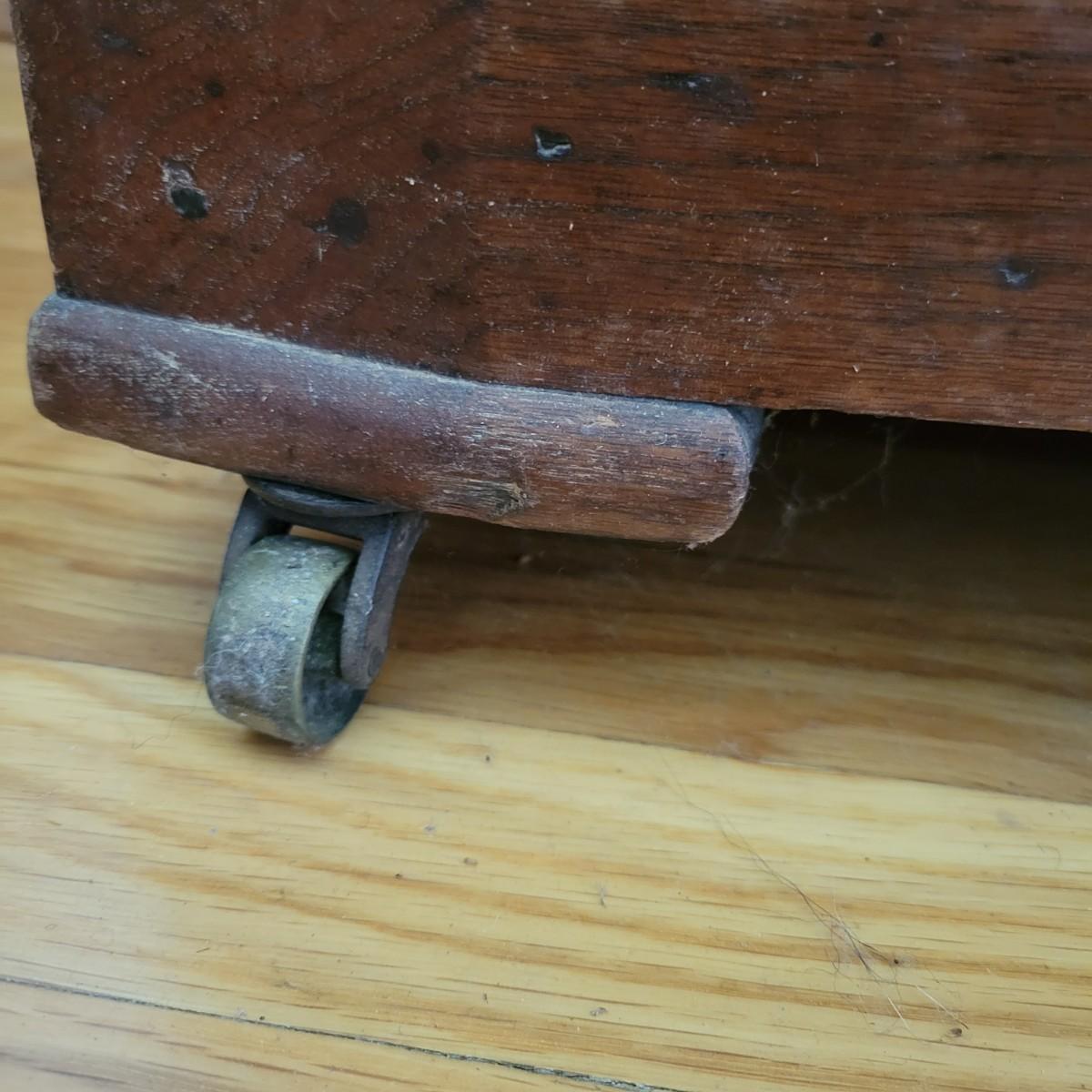 Dresser with a small marble top, 5 drawers and brass wheels. Drawers have carved wood handles and are dovetailed. Drawers open, but do require some effort. Marble is intact with no cracks and there is no key for the locks. Dresser does show its age with some damage and blemishes on the top surface, see attached pictures. Measures approximately 32" x 18" x 42" Local pickup only, please bring help to load.