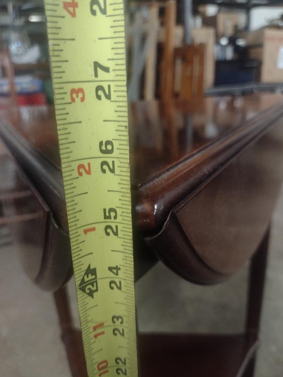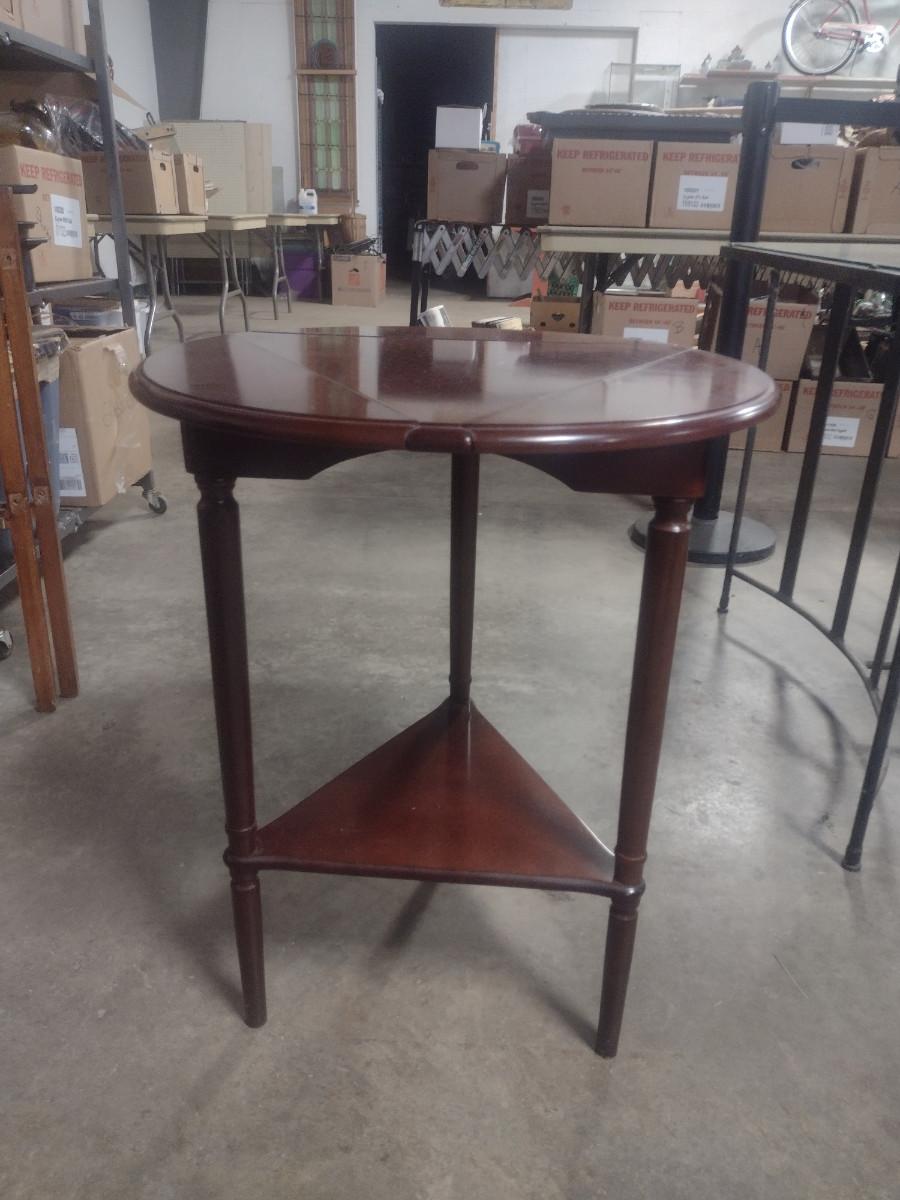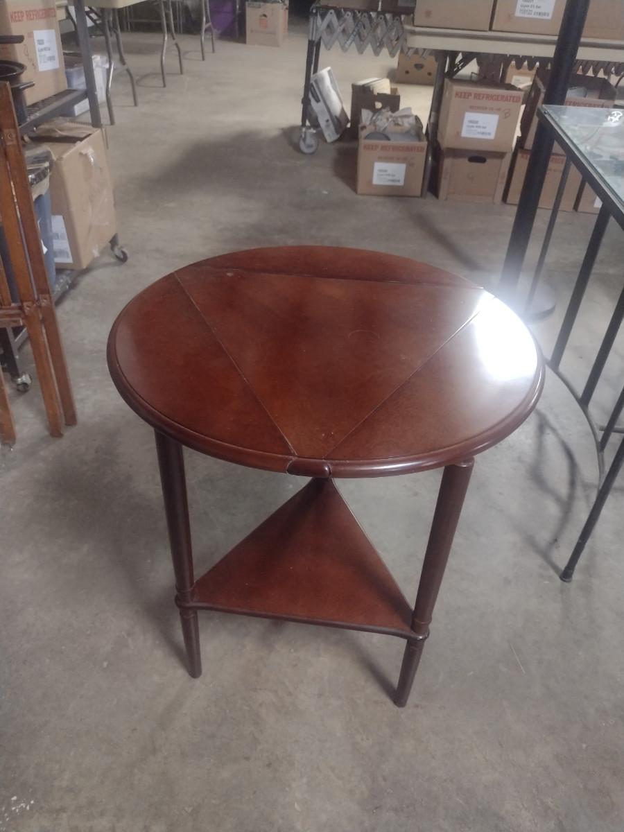 Solid Wood Drop Leaf Accent Table with Stretcher Shelf. With leaves up= approx. 20 1/2" in diameter.