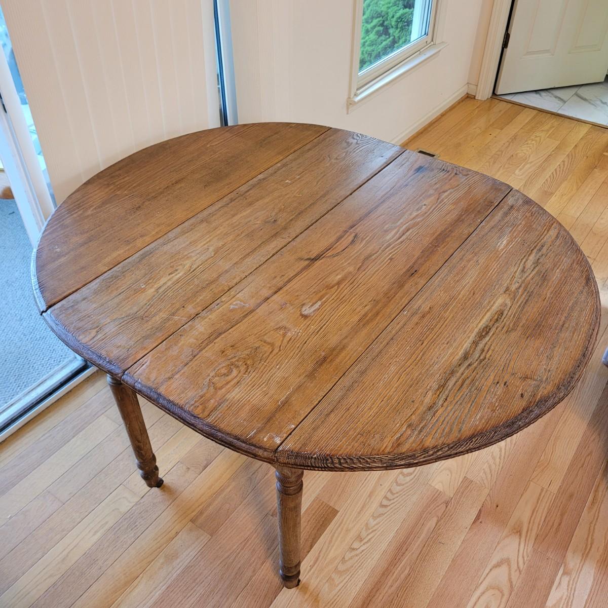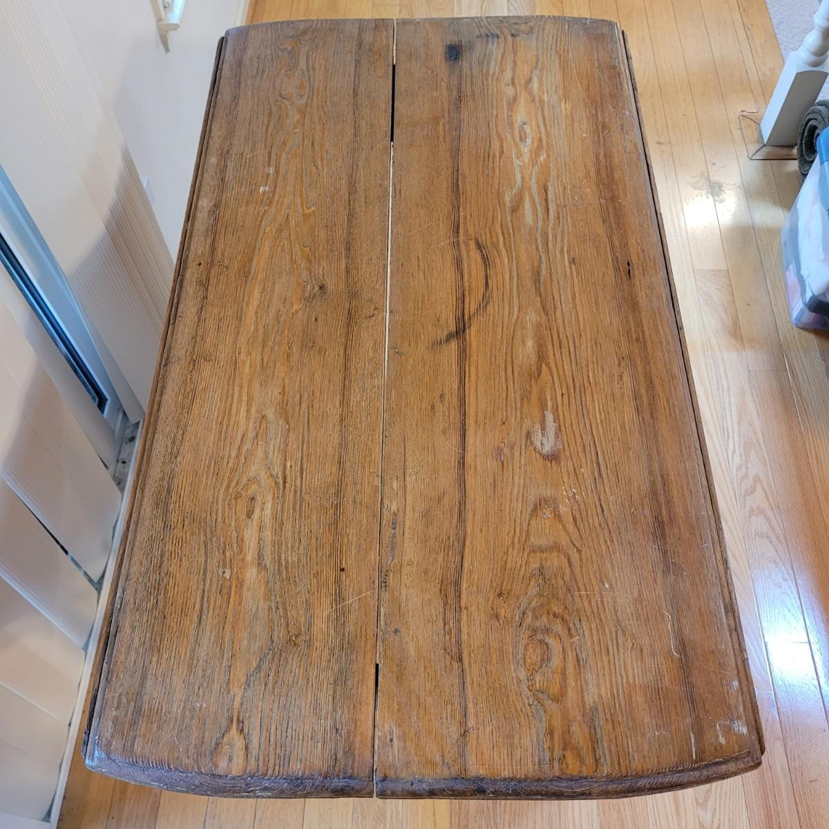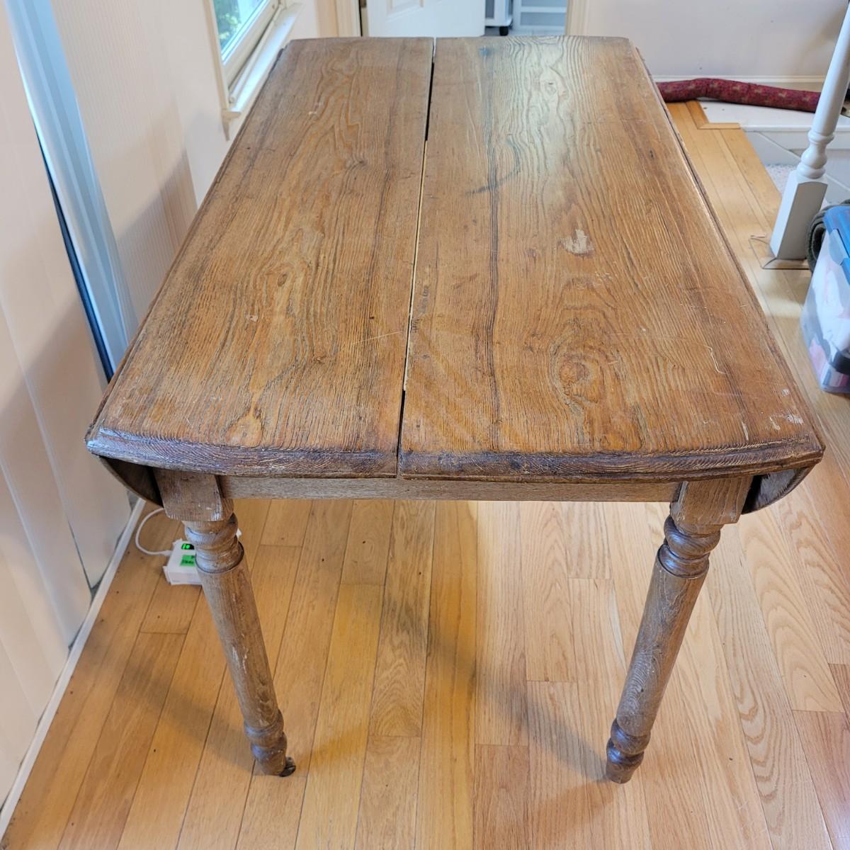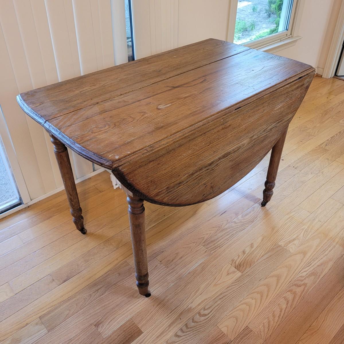 This lot includes a wooden drop leaf dining table. The table is made from solid wood with metal casterz attached to the bottom. When the leaves are down the table is rectangular and measures 25" x 44" x 31"H. With the leaves up the table becomes oblong and ovular measuring 52" x 44" x 31"H. As you will see from photos, there is a small gap in the planks of wood.