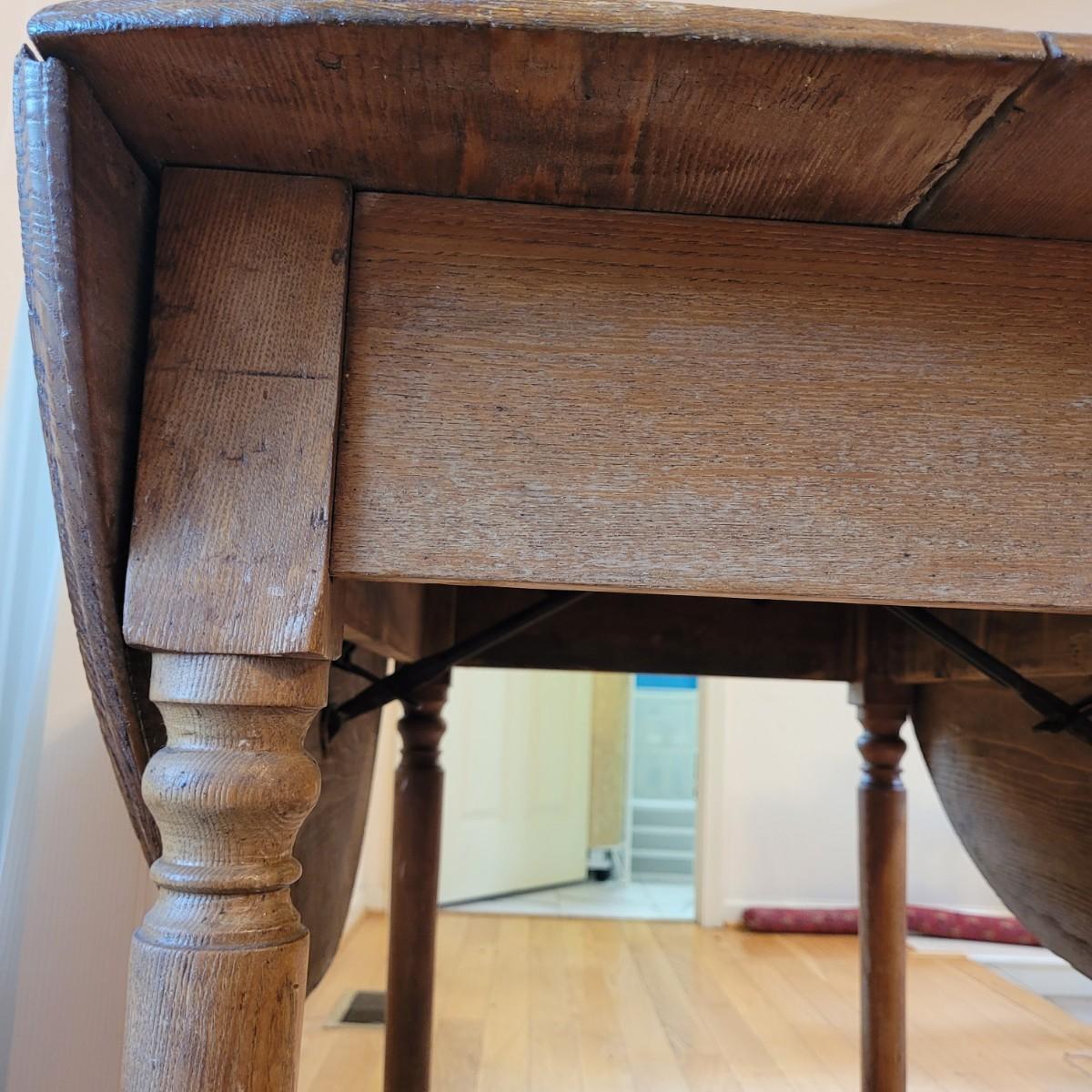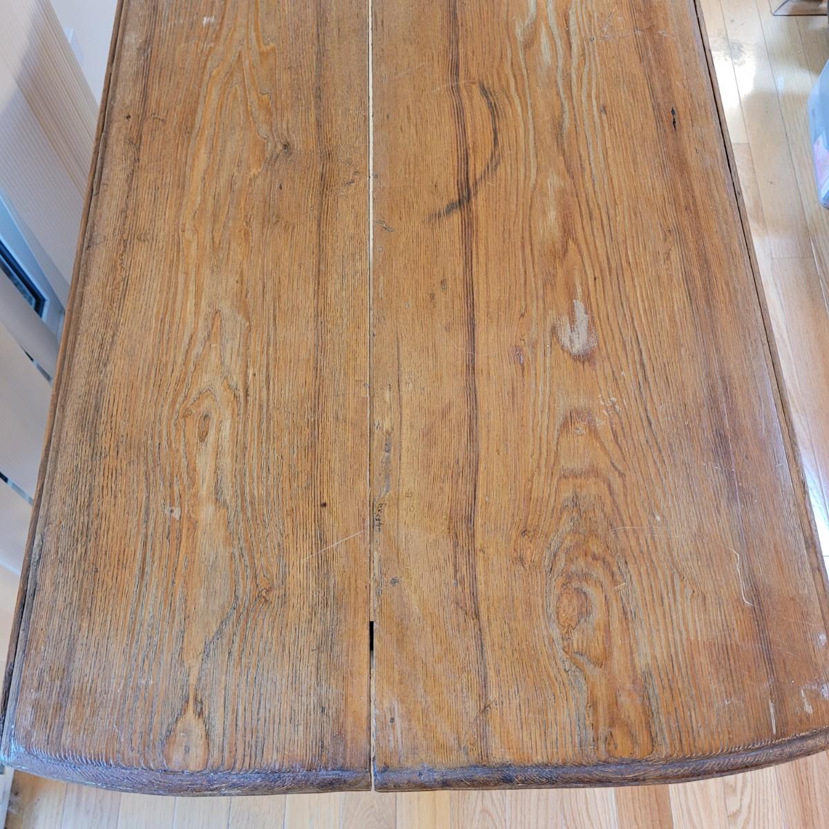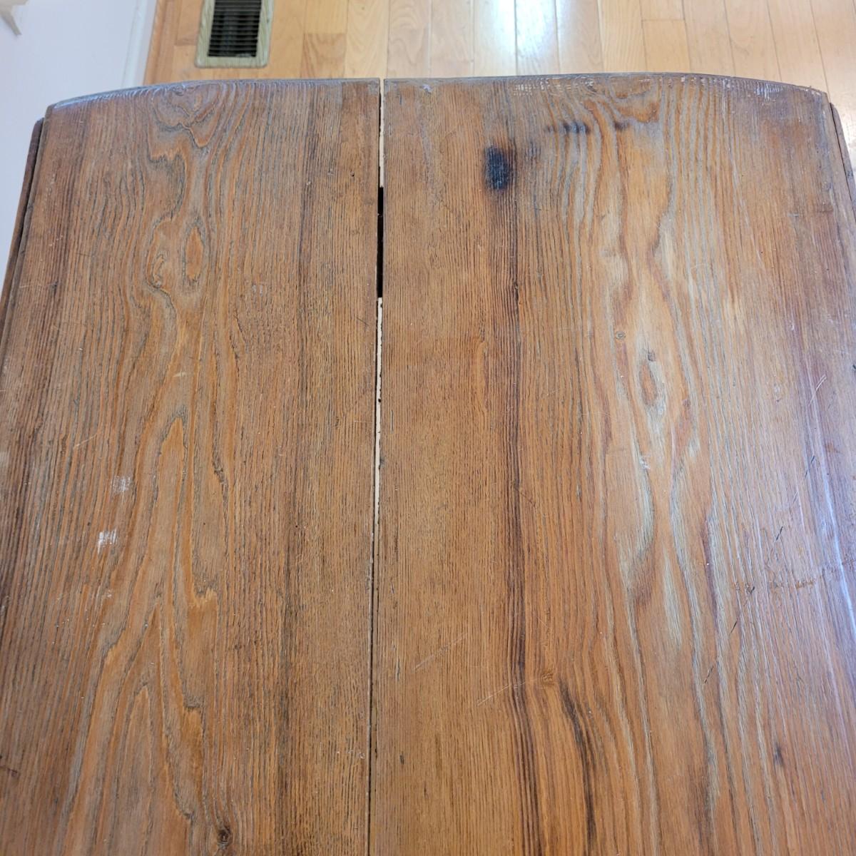 This lot includes a wooden drop leaf dining table. The table is made from solid wood with metal casterz attached to the bottom. When the leaves are down the table is rectangular and measures 25" x 44" x 31"H. With the leaves up the table becomes oblong and ovular measuring 52" x 44" x 31"H. As you will see from photos, there is a small gap in the planks of wood.