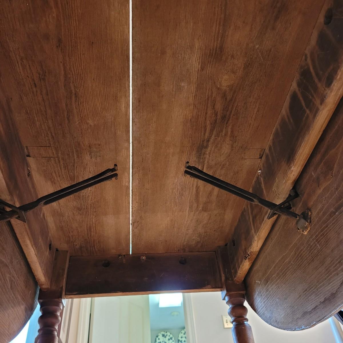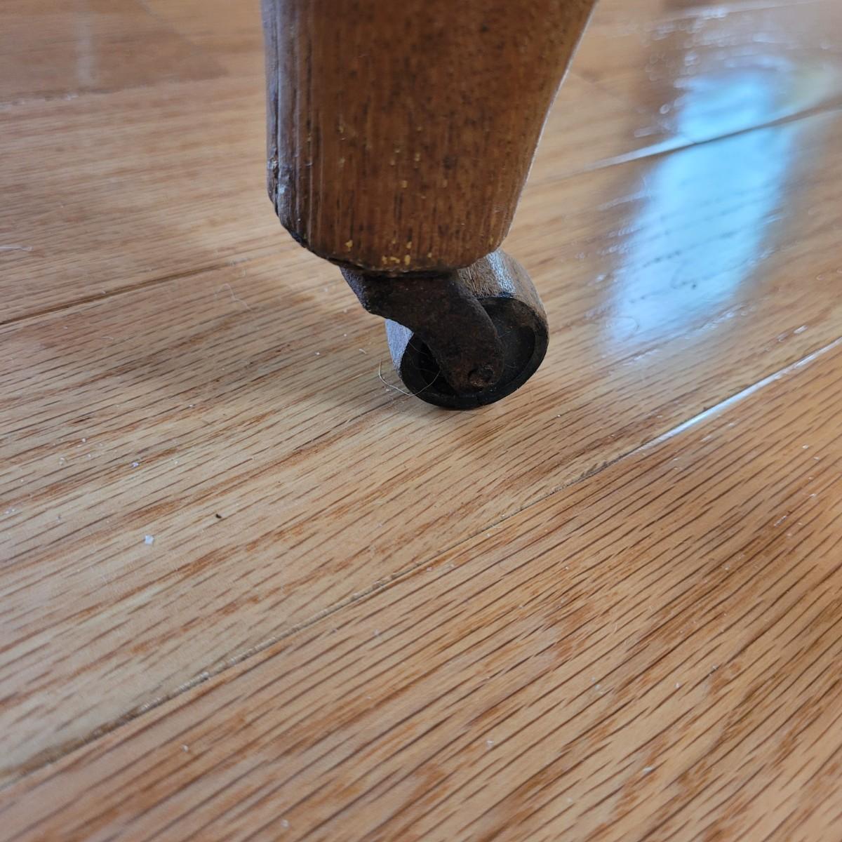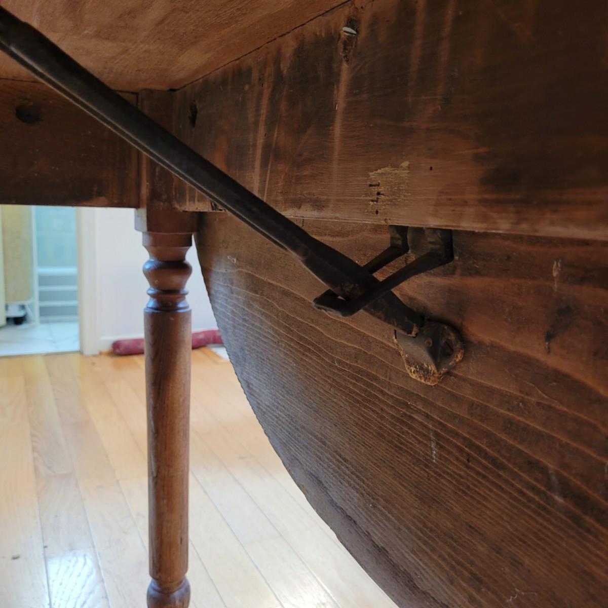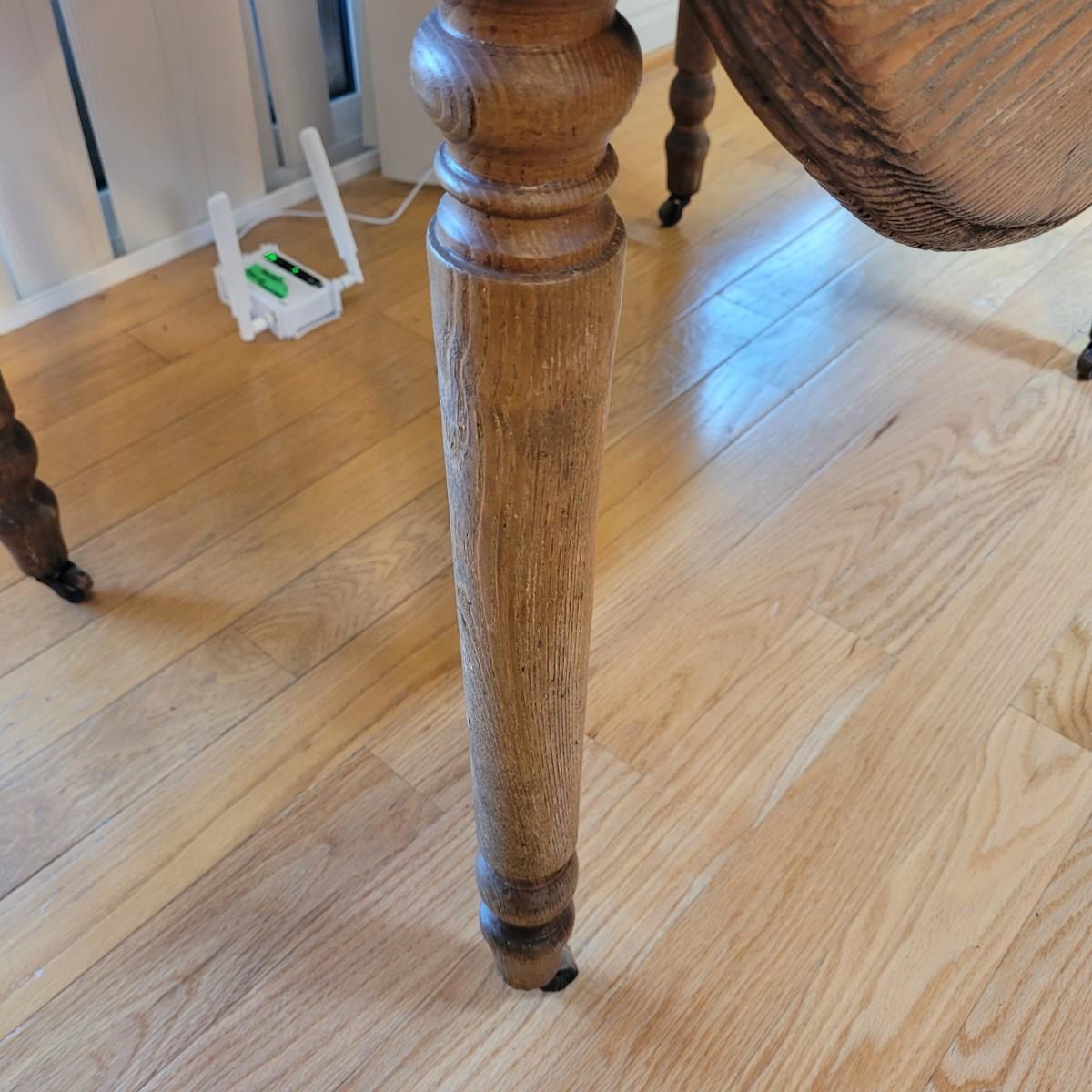 This lot includes a wooden drop leaf dining table. The table is made from solid wood with metal casterz attached to the bottom. When the leaves are down the table is rectangular and measures 25" x 44" x 31"H. With the leaves up the table becomes oblong and ovular measuring 52" x 44" x 31"H. As you will see from photos, there is a small gap in the planks of wood.