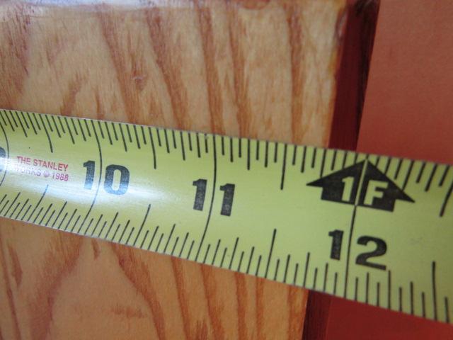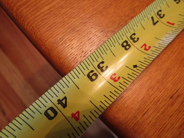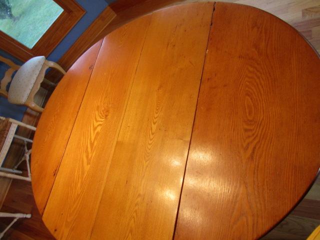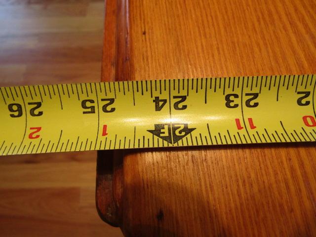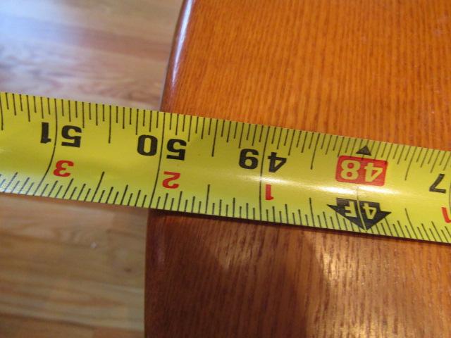 Solid Wood Drop Leaf Table. Approx 39 1/2" Wide. Measures approx 25" with leaves down, 50" with leaves up. Also has 2 additional leaves- each 11 3/4".