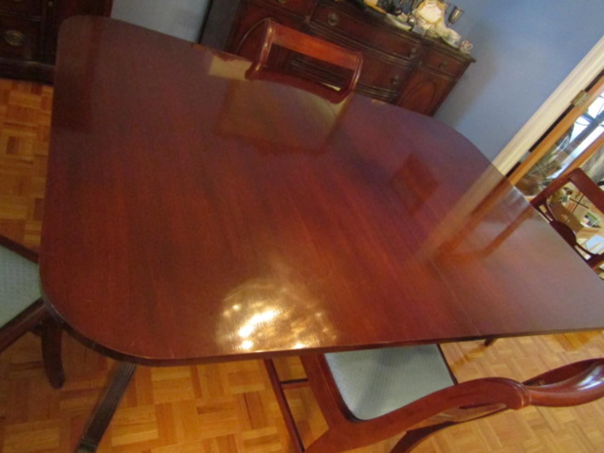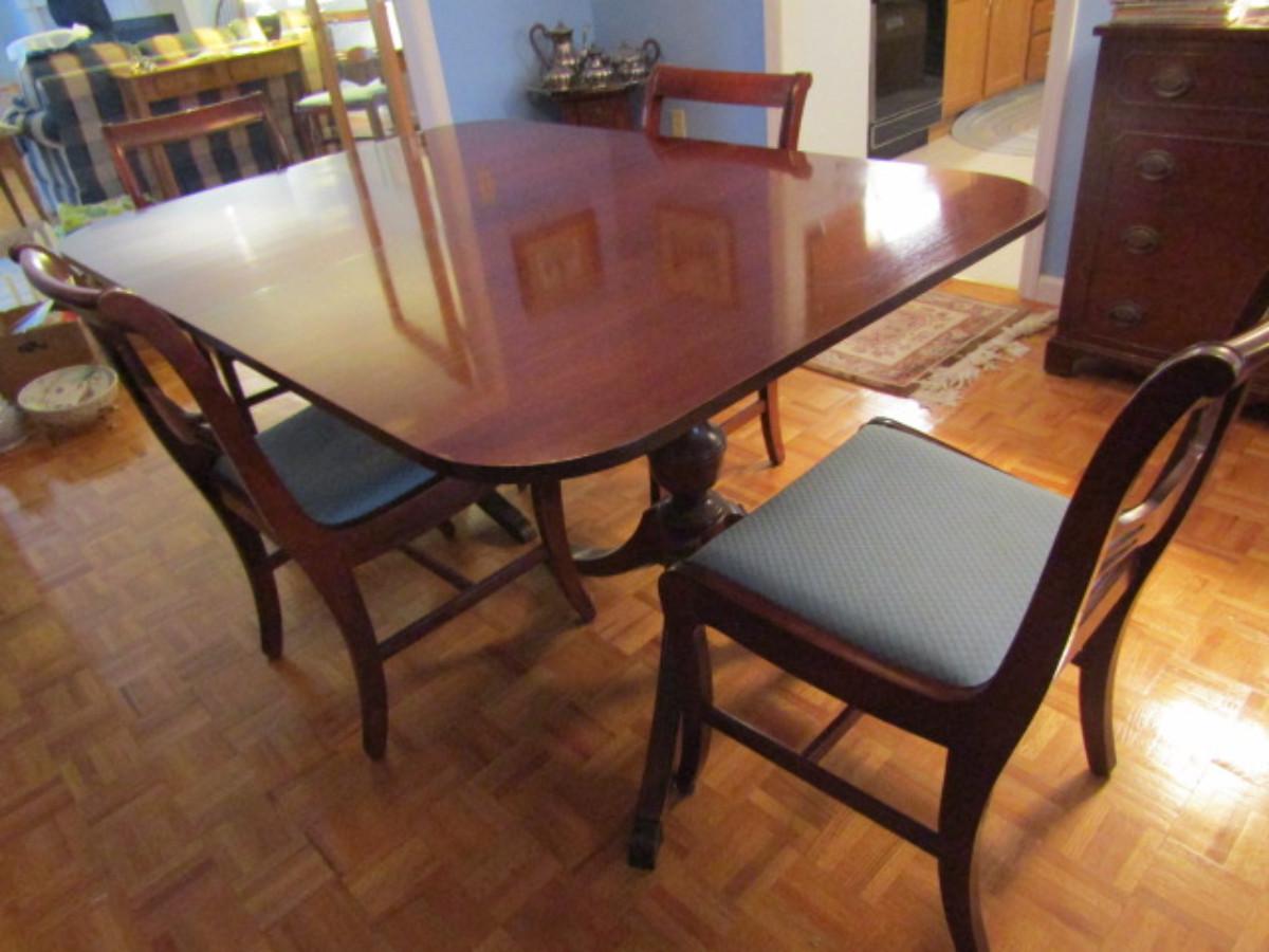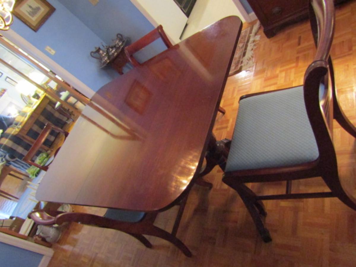 Solid Wood Duncan Phyfe Style Dining Table and Upholstered Chairs- Maker Not Marked
