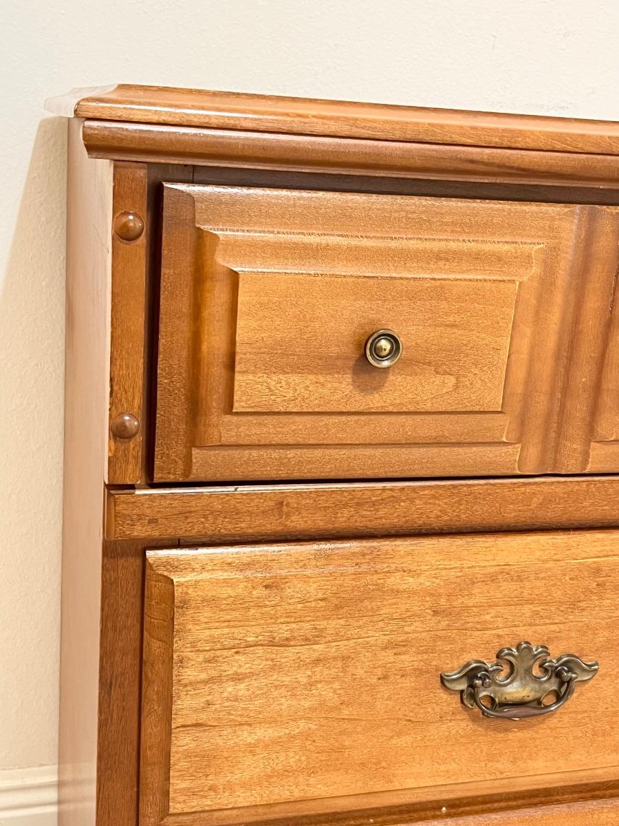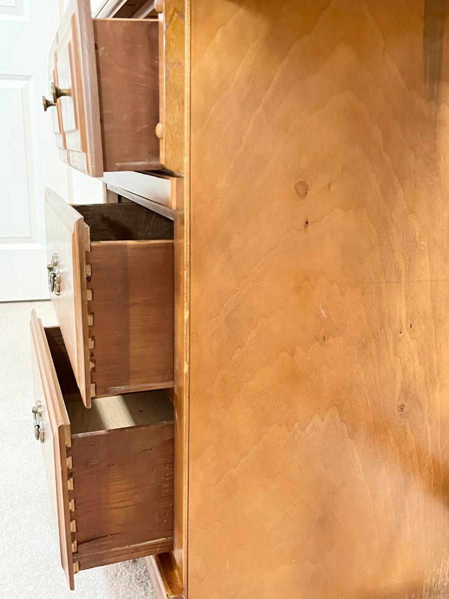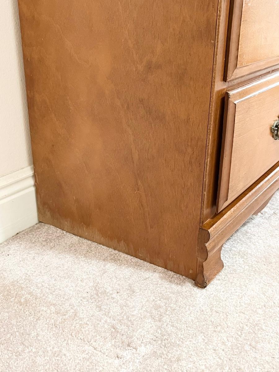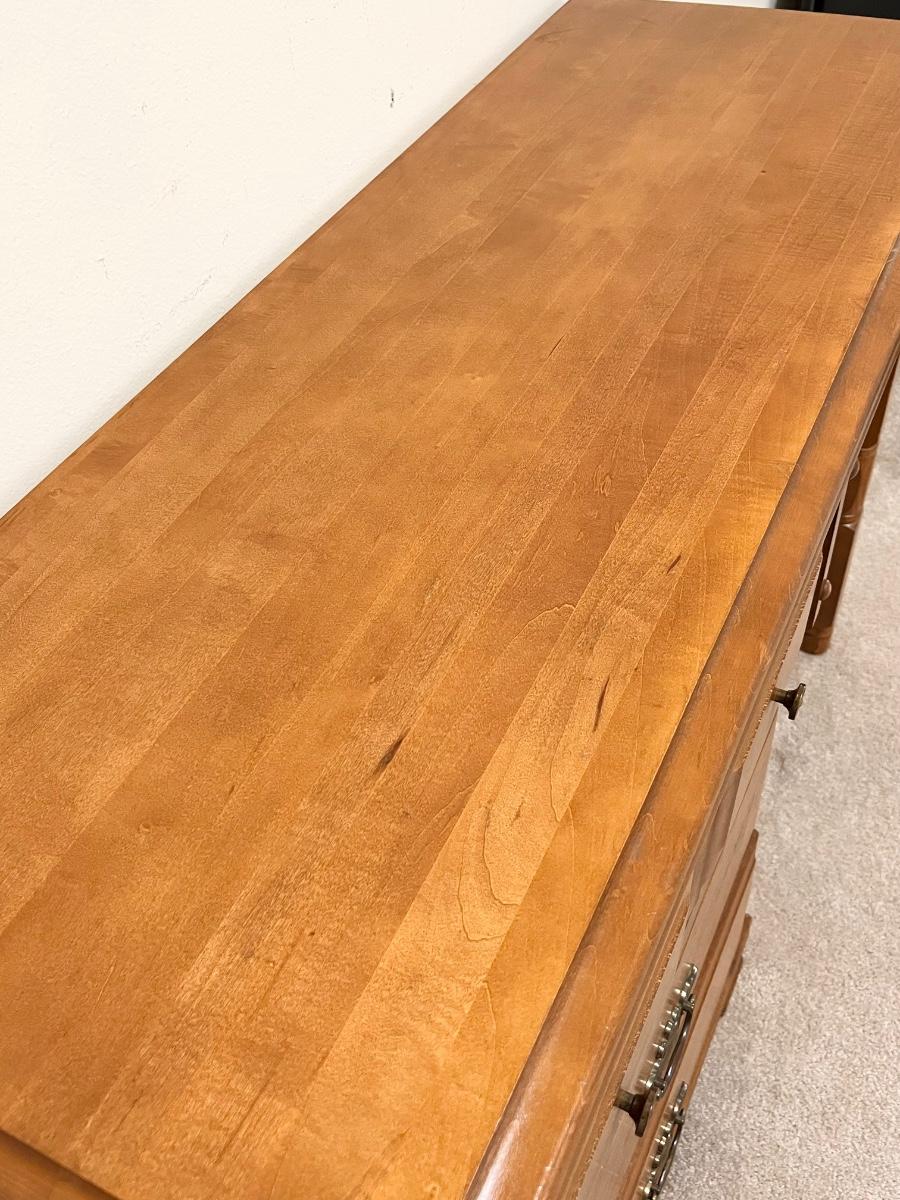 No brand name found ~ Top has minor scratches, feet have major scratches and appears to have water damage along the bottom. ~ 30.5” H x 44” W x 16” D