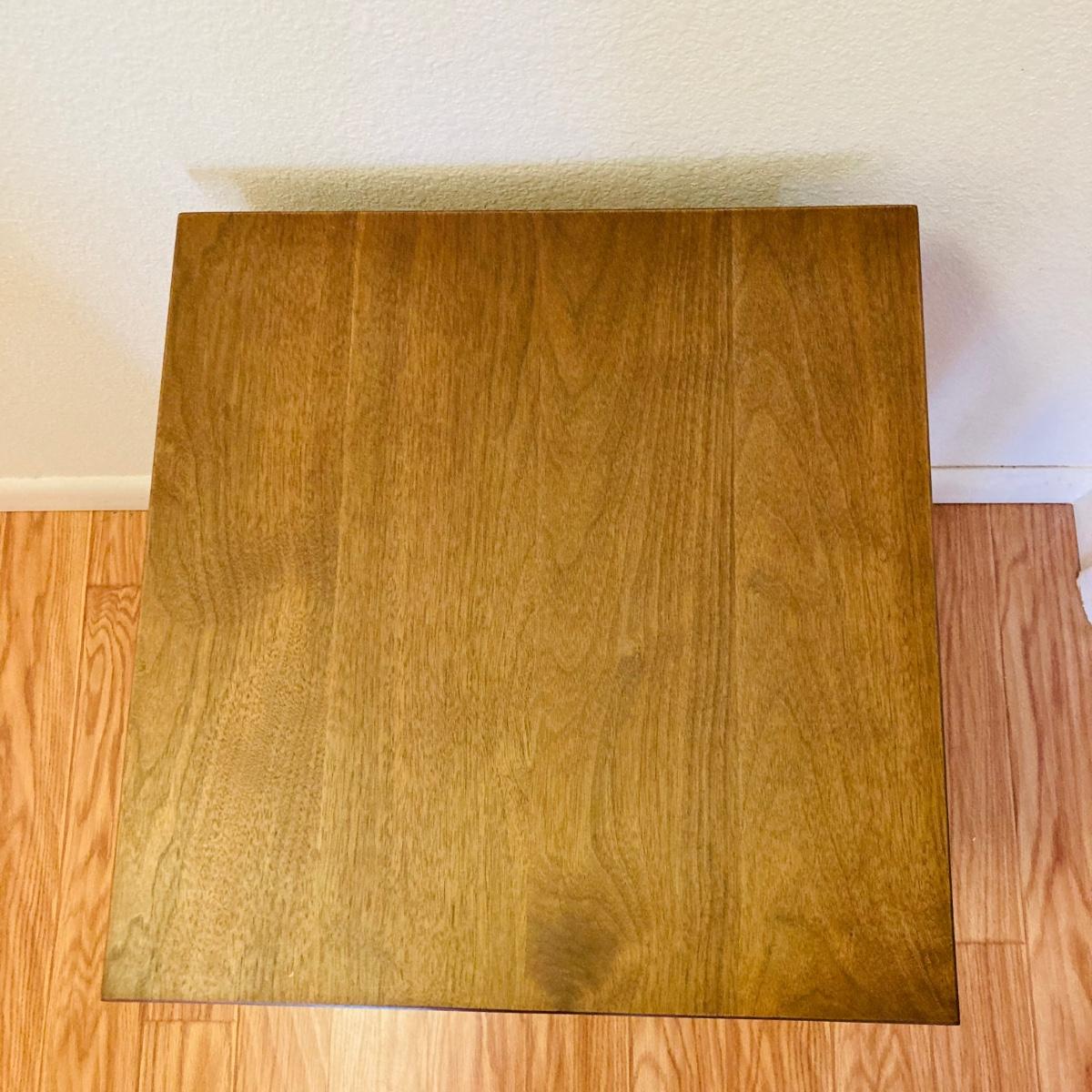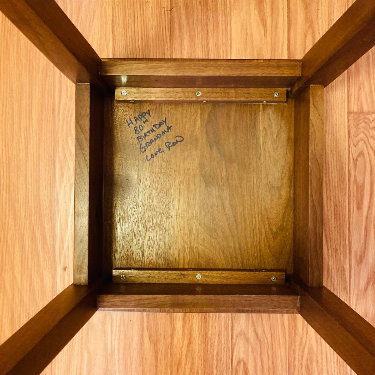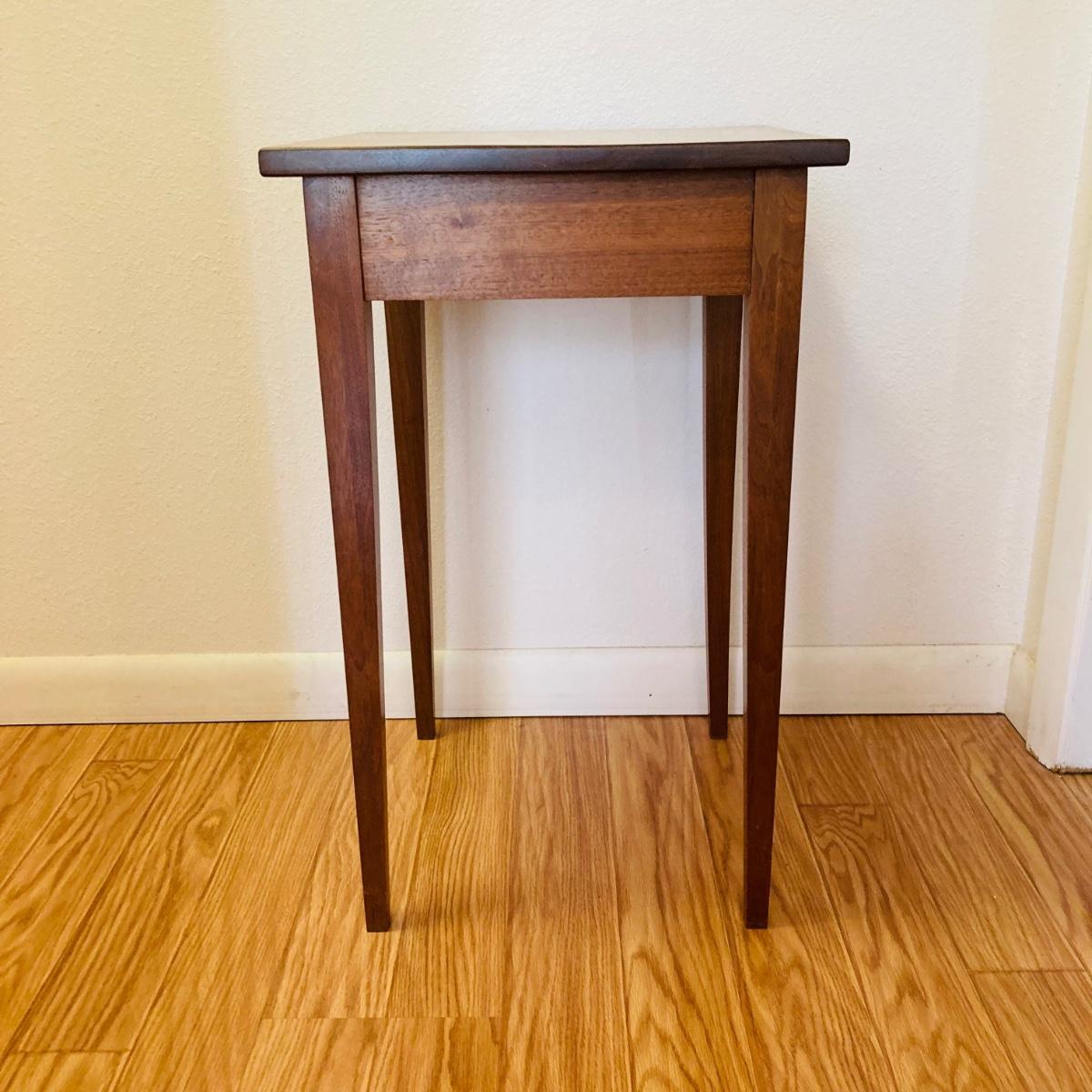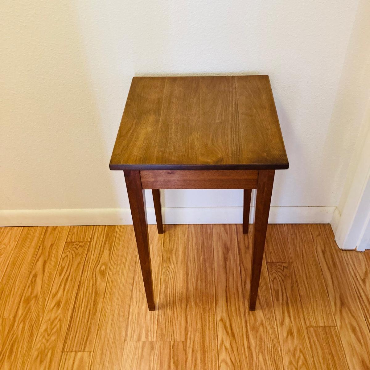 Solid wood end table. In good condition. 16”L x 15 1/2”W x 26”H.
