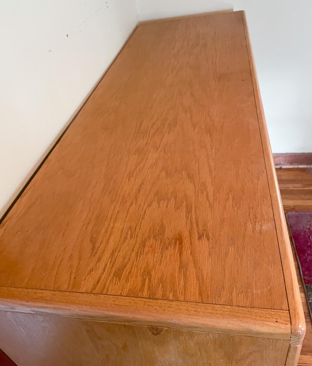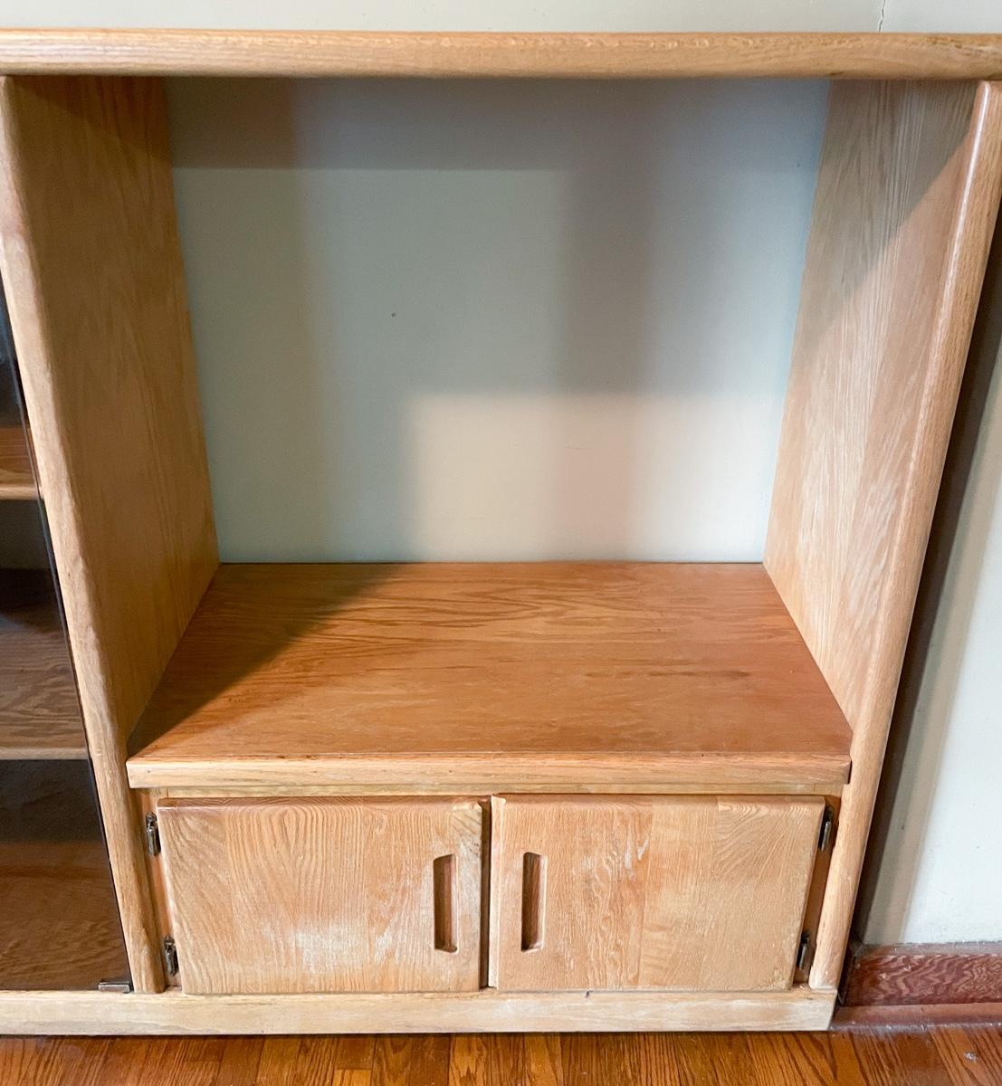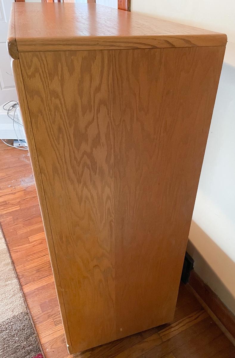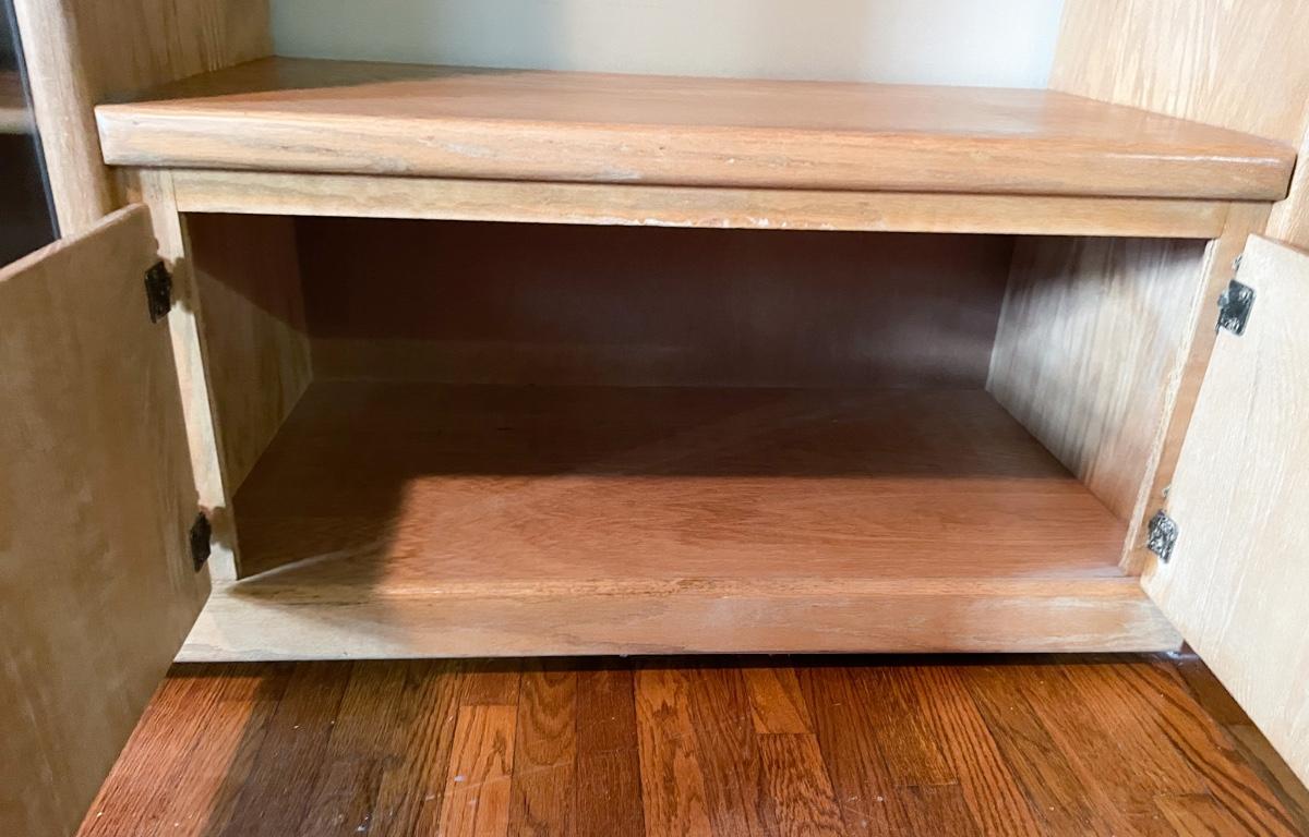 Big sturdy piece, on wheels for easy moving! Glass doors are magnetized and work great. The finish does have some wear, mostly on the bottom doors and a ring spot on the top, as shown in photos. Measures approx 56.5” L x 20” W x 50.5” tall. **MUST BEING HELP TO CARRY OUT FURNITURE**