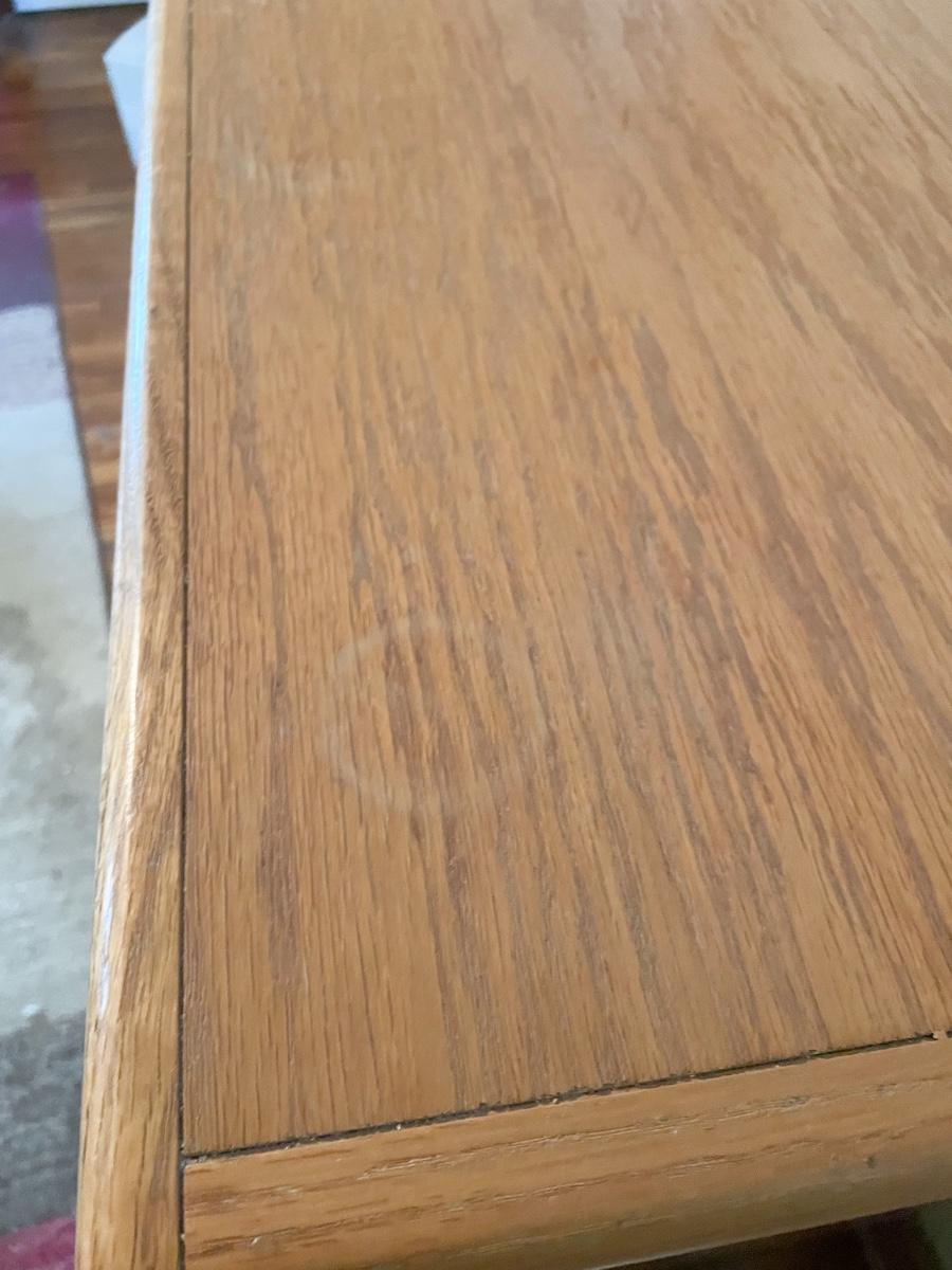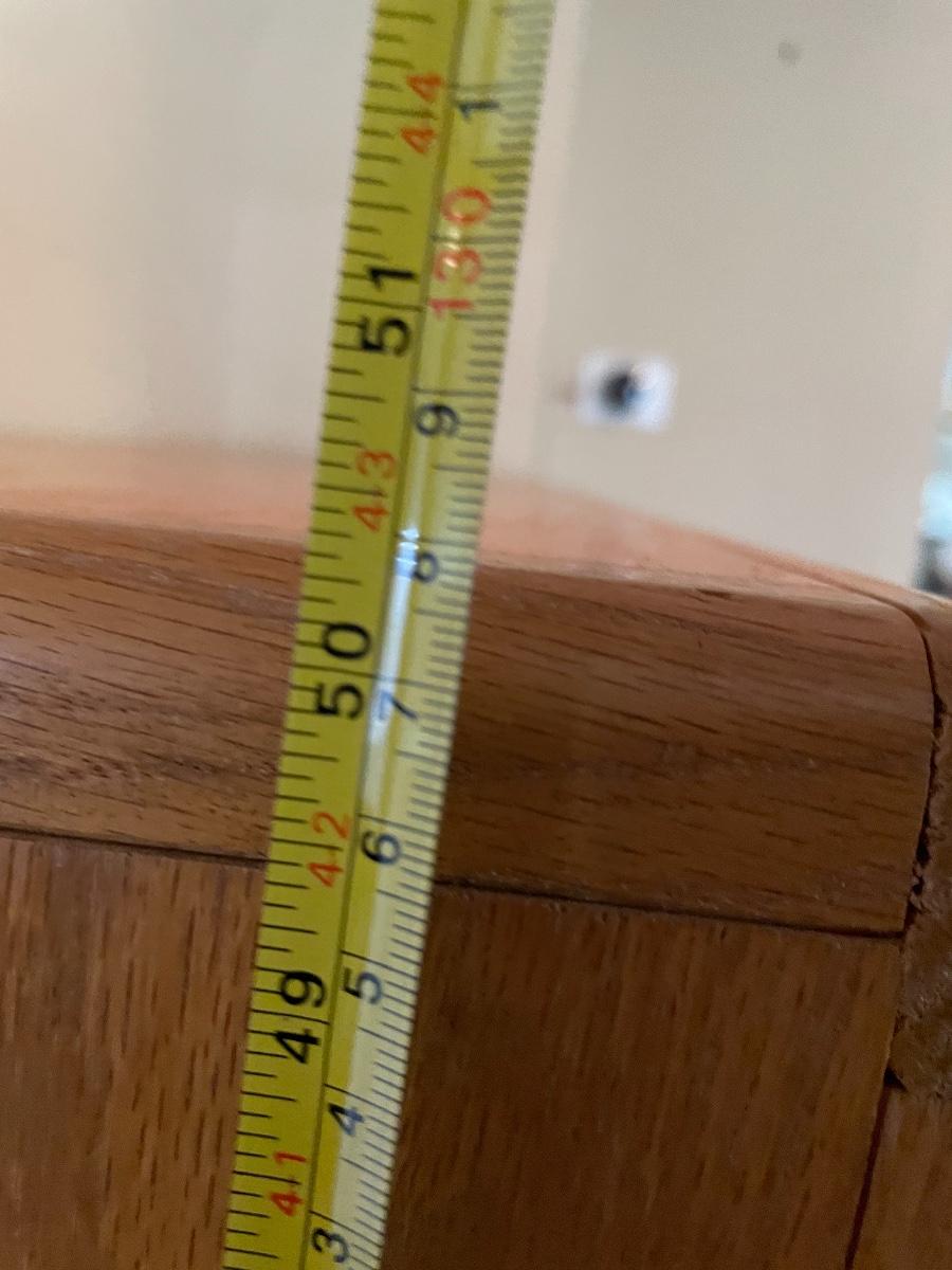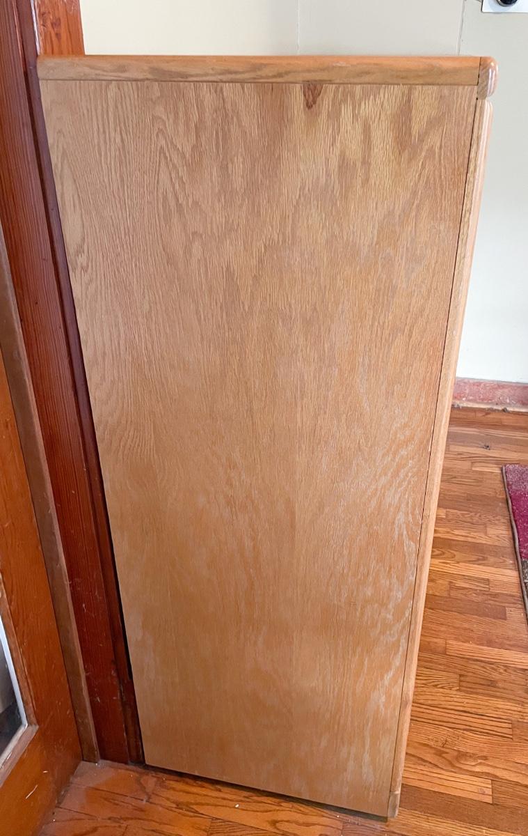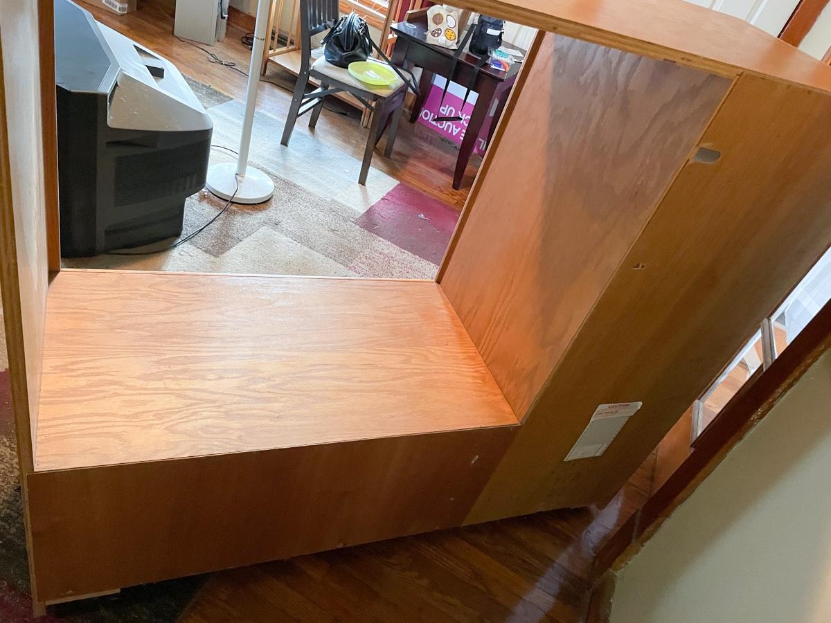 Big sturdy piece, on wheels for easy moving! Glass doors are magnetized and work great. The finish does have some wear, mostly on the bottom doors and a ring spot on the top, as shown in photos. Measures approx 56.5” L x 20” W x 50.5” tall. **MUST BEING HELP TO CARRY OUT FURNITURE**