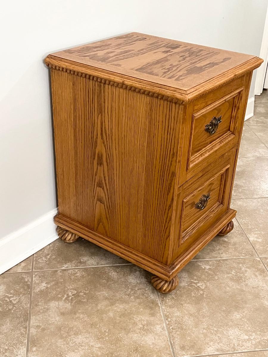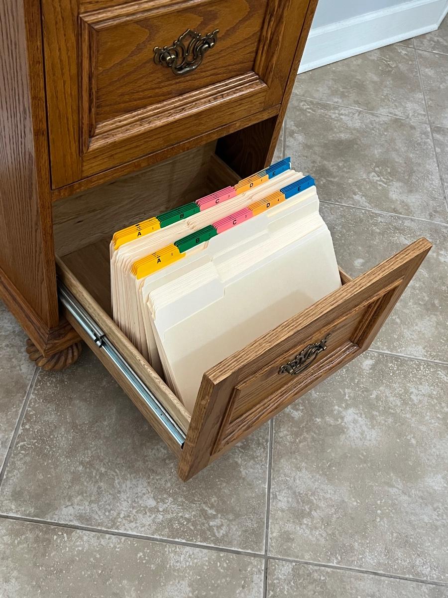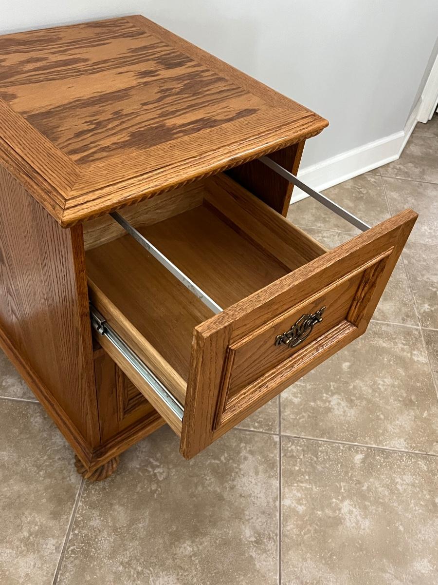 Drawers slide easily ~ Includes legal folders ~ Top drawer has metal hangers, bottom drawer is missing metal hangers ~ Metal hangers can adjust to legal or letter size ~ No brand ~ 31” H x 22” W x 22” D
