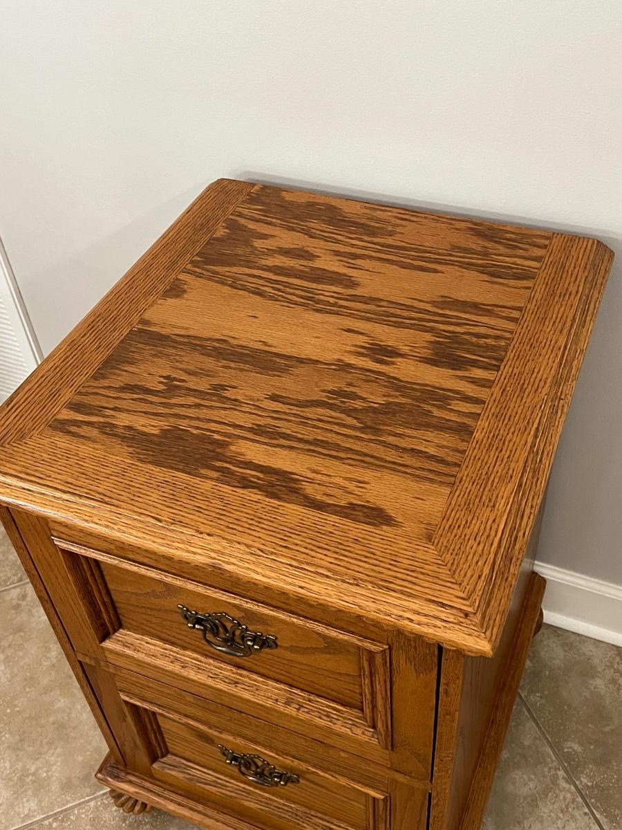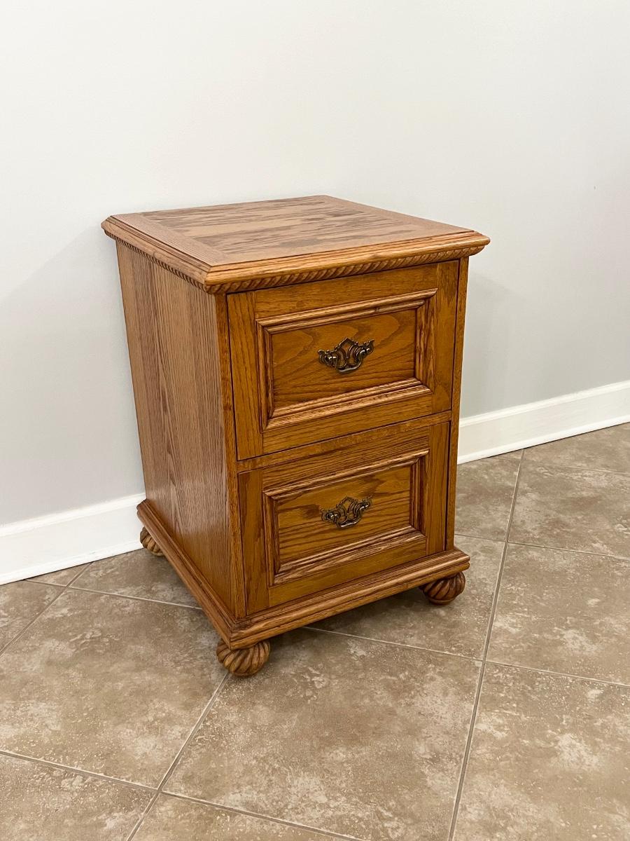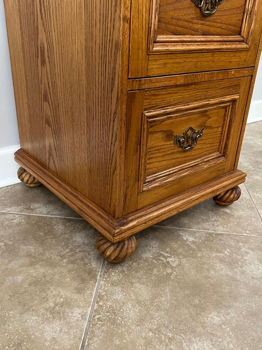 Drawers slide easily ~ Includes legal folders ~ Top drawer has metal hangers, bottom drawer is missing metal hangers ~ Metal hangers can adjust to legal or letter size ~ No brand ~ 31” H x 22” W x 22” D