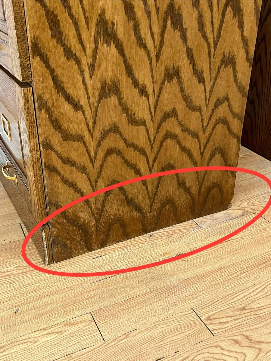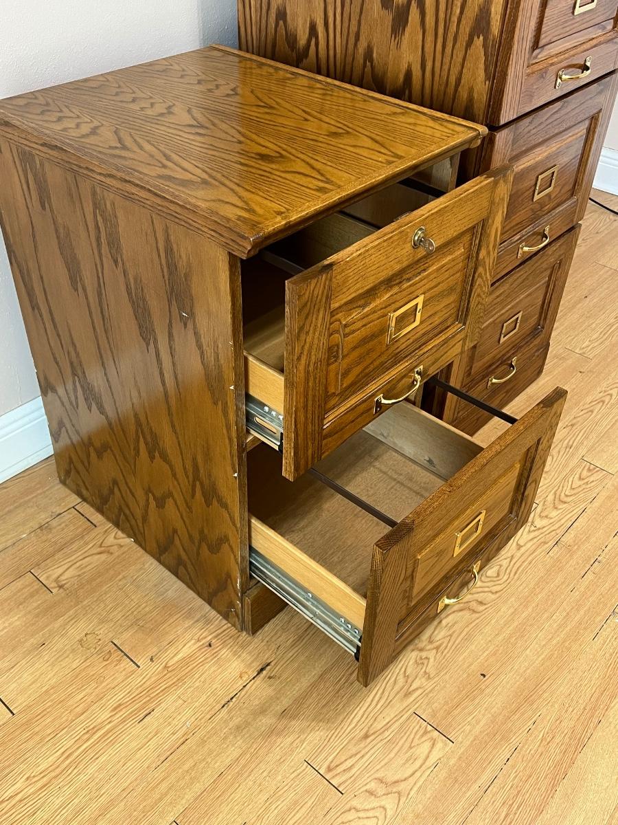Both have keys, keys are interchangeable between the cabinets ~ All drawers slide easily & have hardware for filing ~ **Cabinets have water damage but are still solid ~ Smaller cabinet has corner damage, see photos ~ Tall cabinet = 54.5” H x 19” W x 23” D ~ Smaller cabinet = 30” H x 19” W x 23” D
