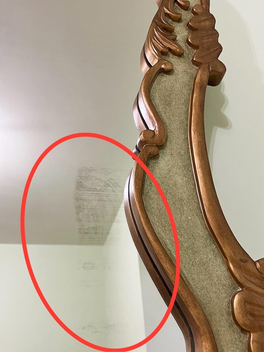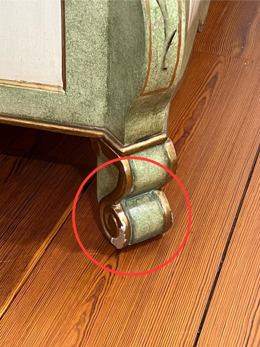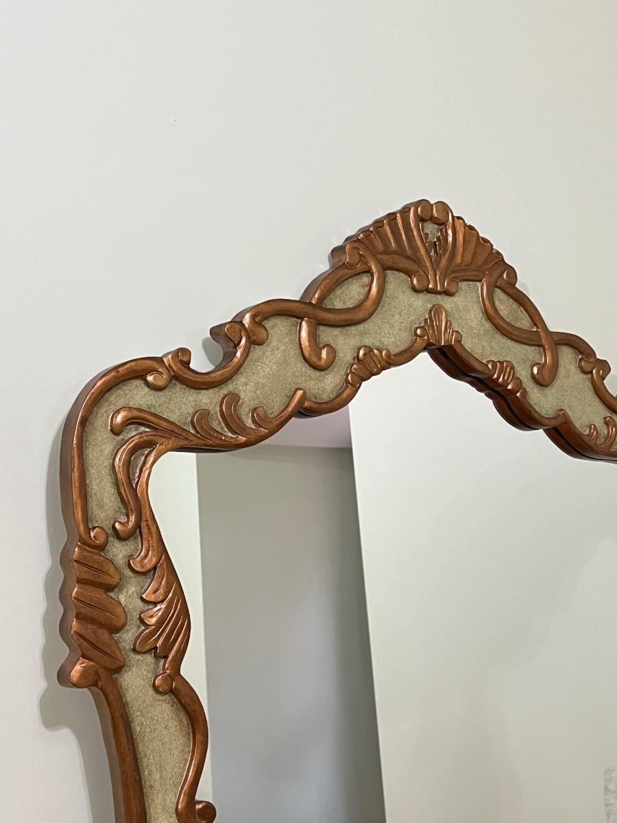 2 pieces ~ Mirror is intended to hang on the wall ~ All drawers are felt lined ~ *Bottom leg has minor damage from moving (see photo) ~ Mirror has some minor silvering ~ All drawers slide easy ~ Dresser = 33” H x 64” W x 20” D ~ Mirror = 45” H x 40” W