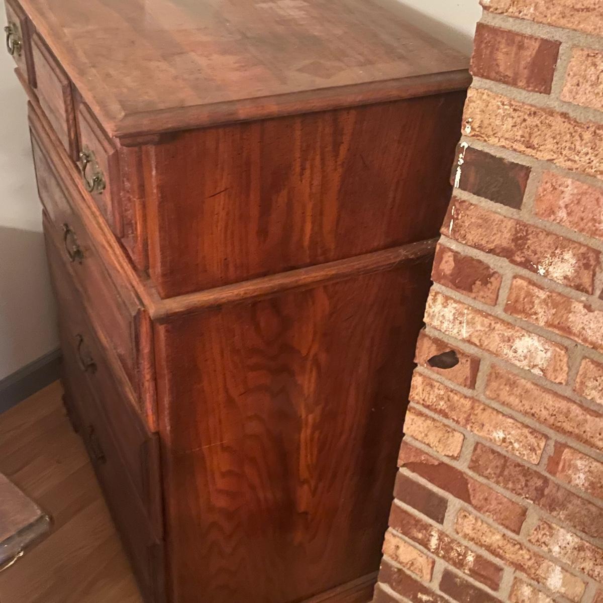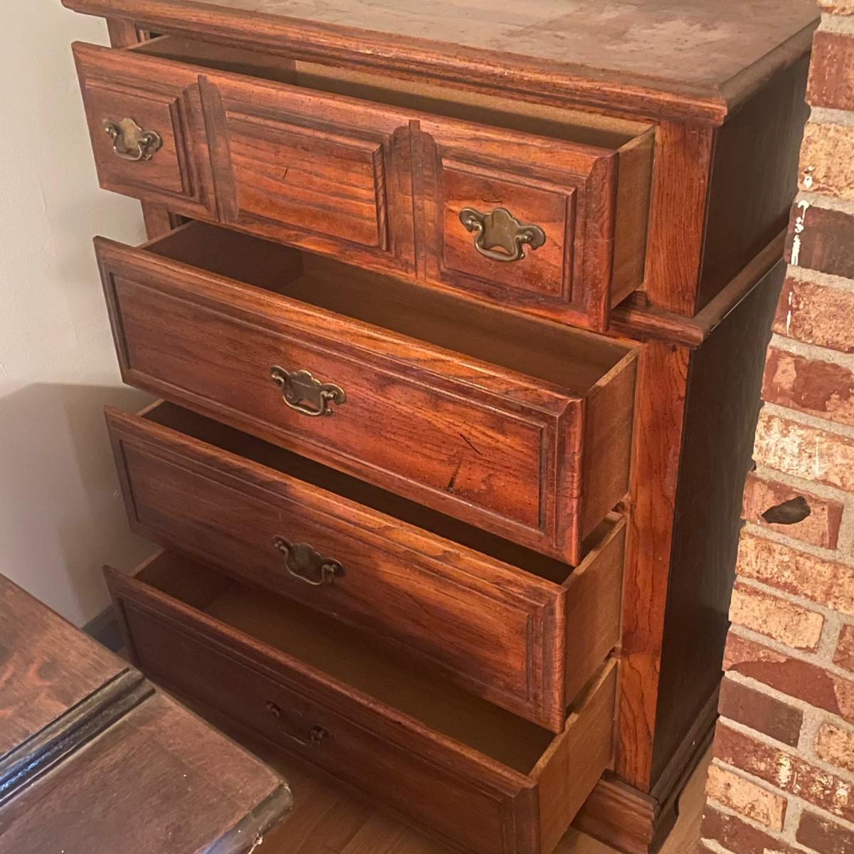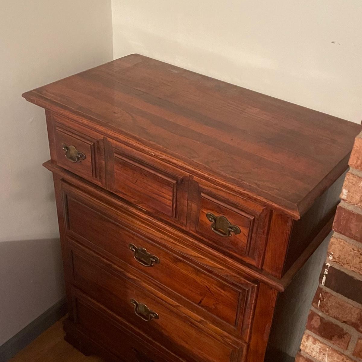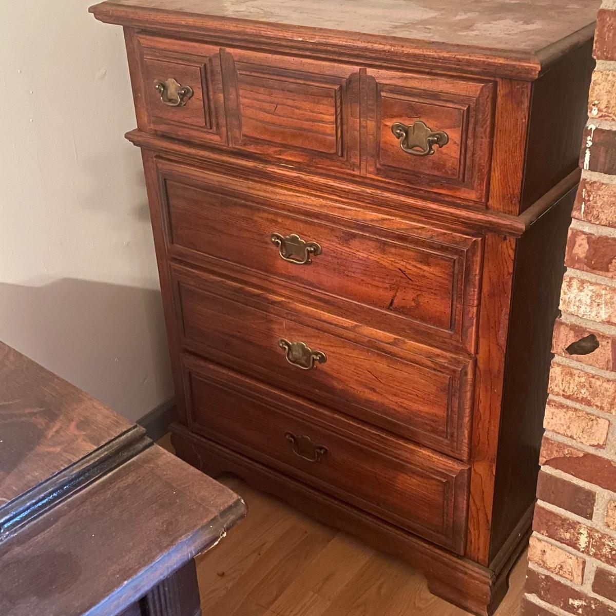 This solid wood four drawer dresser has brass handles and measures 18” deep x 34” wide x 43” tall.