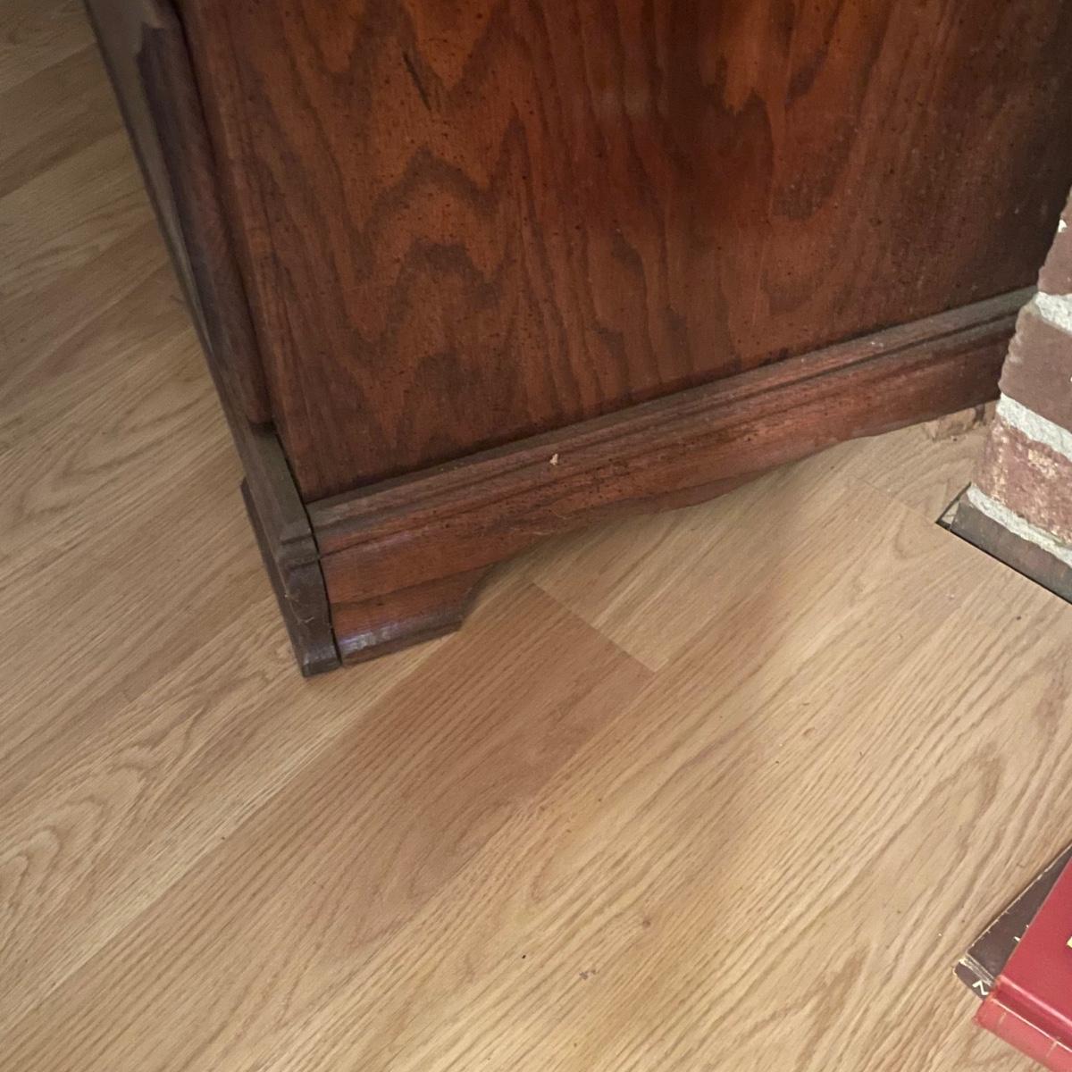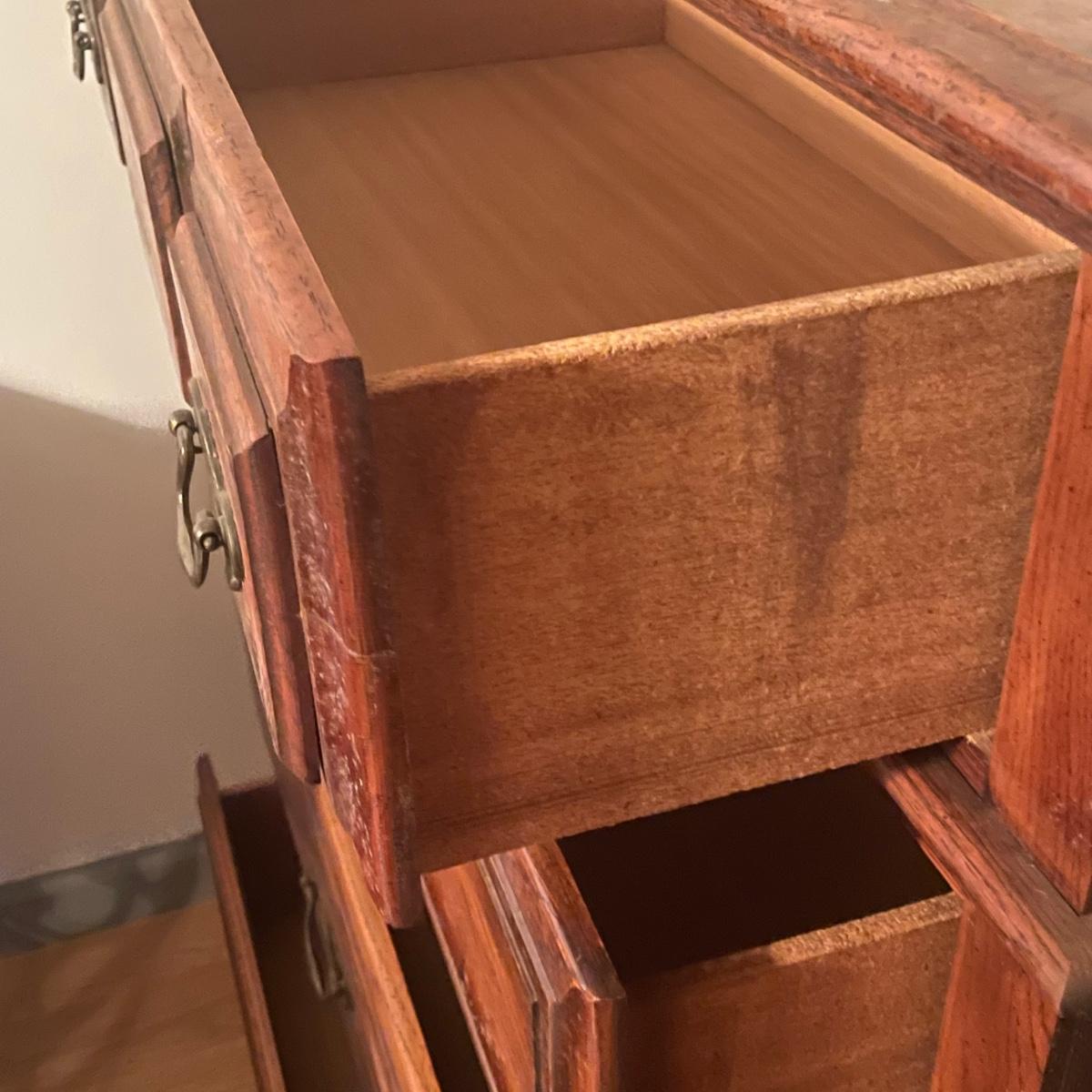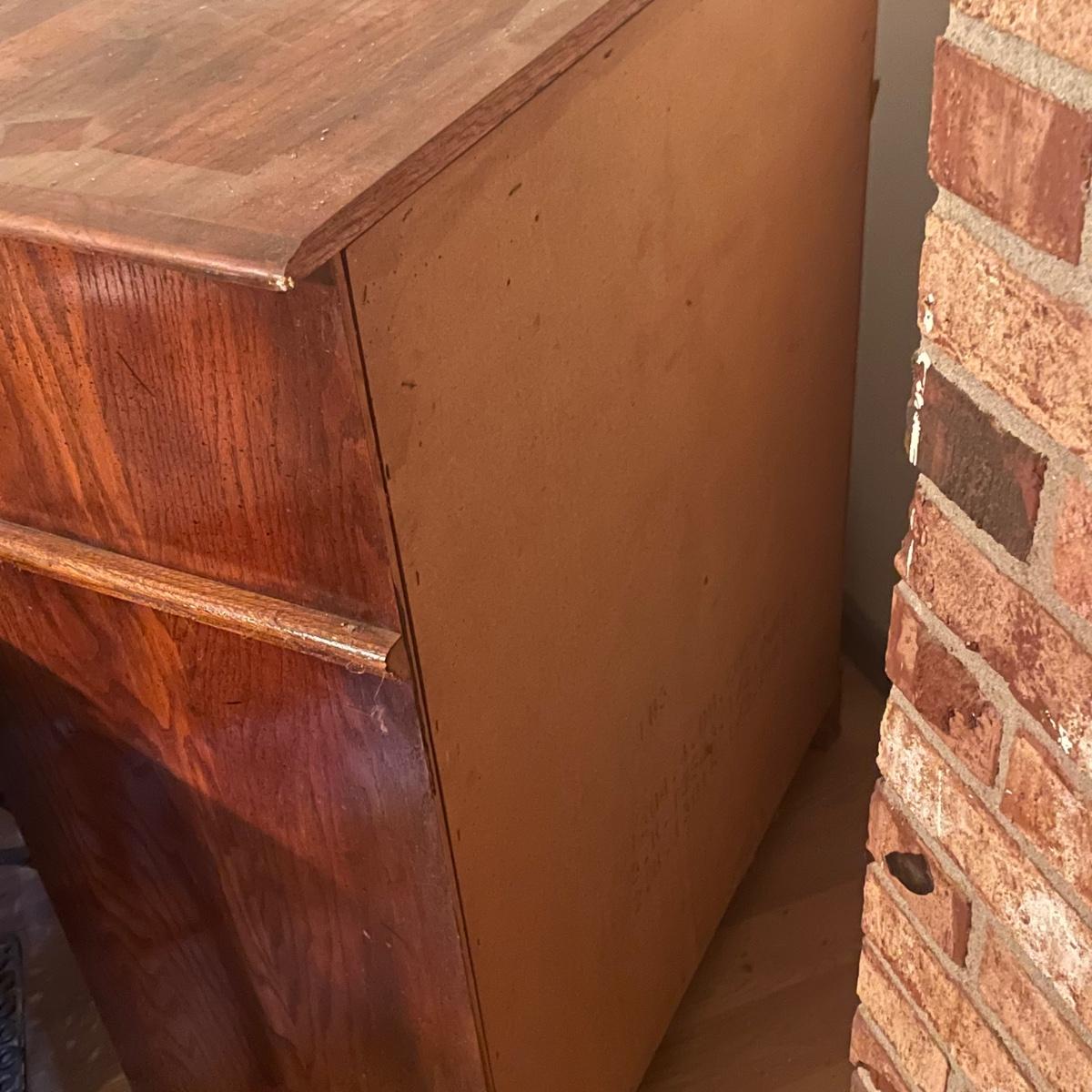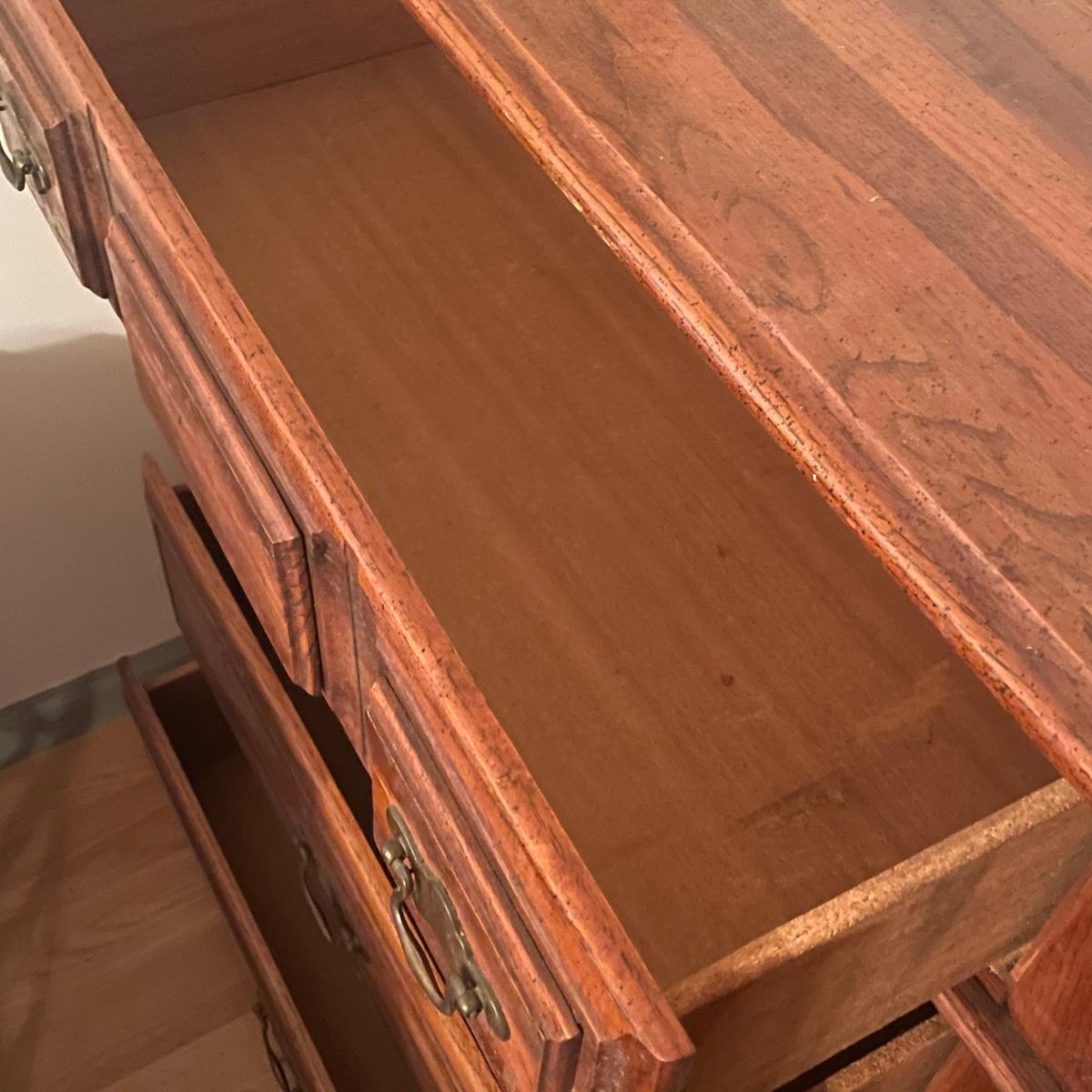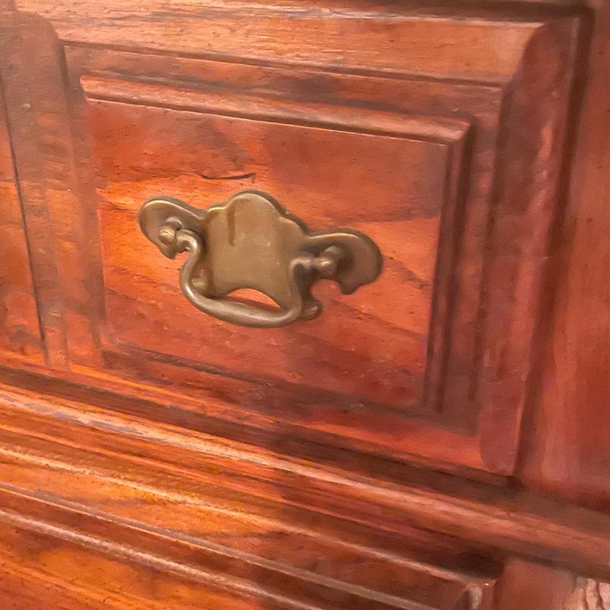 This solid wood four drawer dresser has brass handles and measures 18” deep x 34” wide x 43” tall.