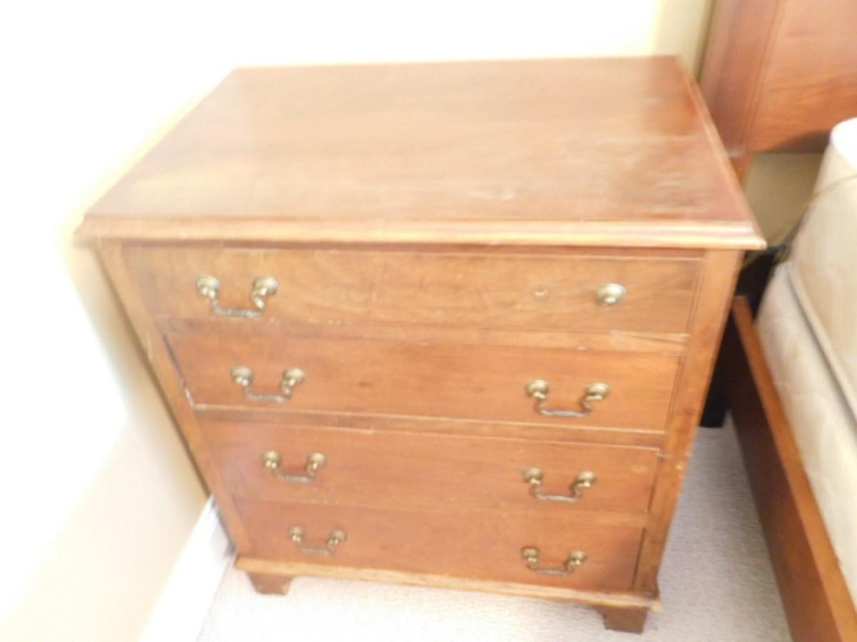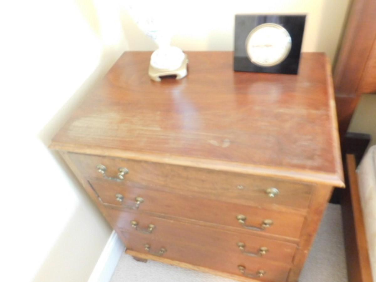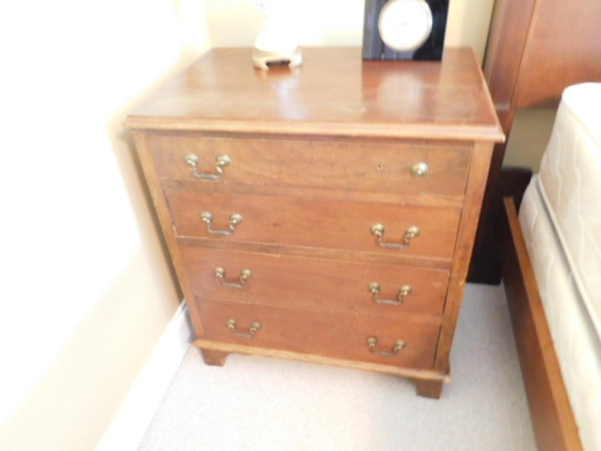 Solid Wood Four Drawer Side Dresser. Has some scratches and wear. One pull needs repair. Upstairs item. Bring help to remove.