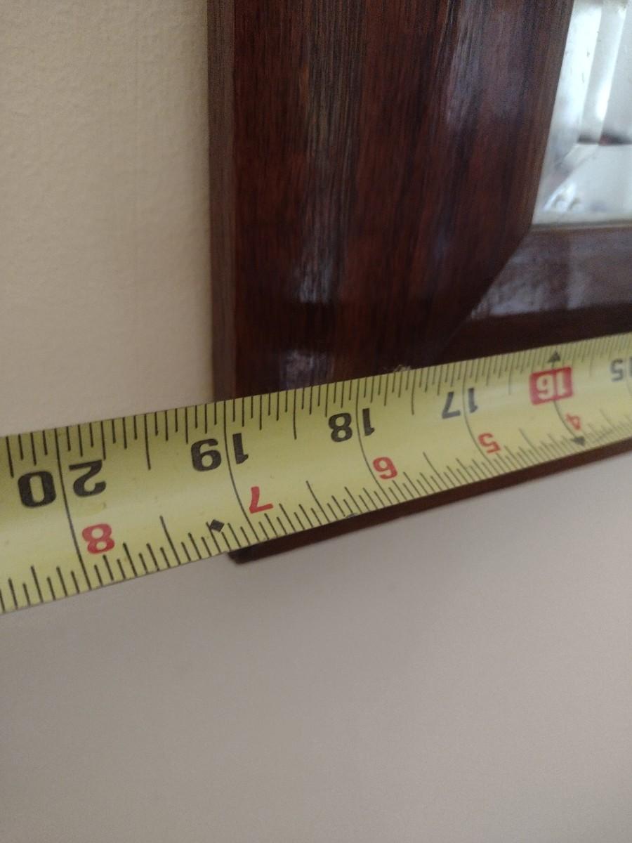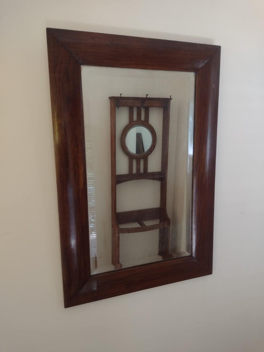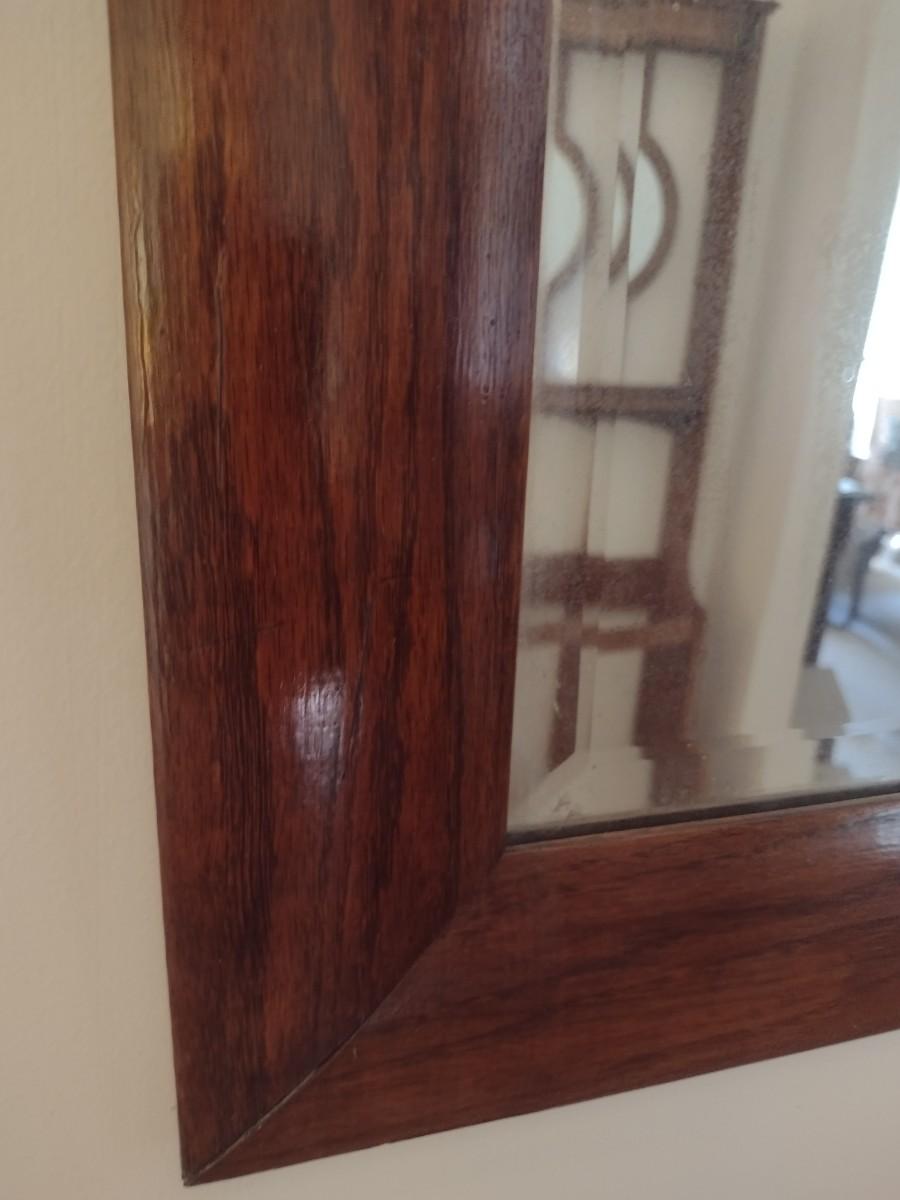 Solid Wood Framed Beveled Glass Wall Mirror. Image in center is reflection of furniture in the background.