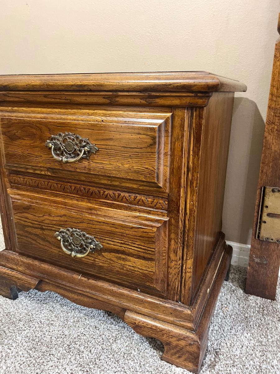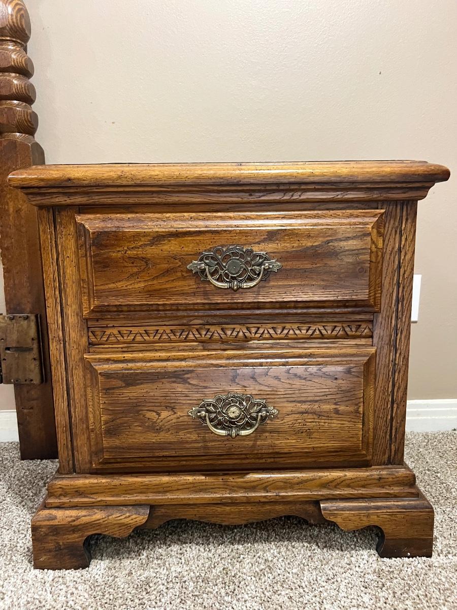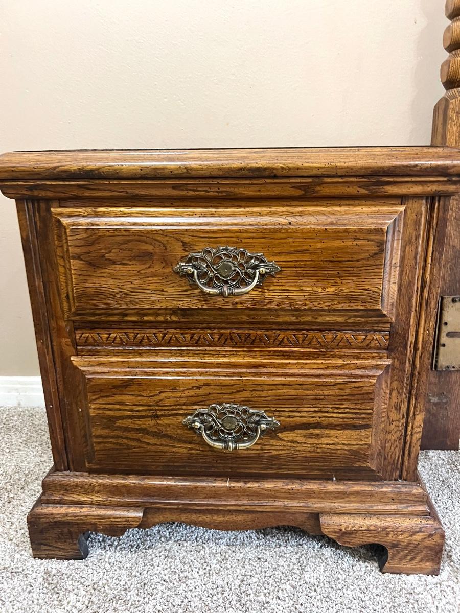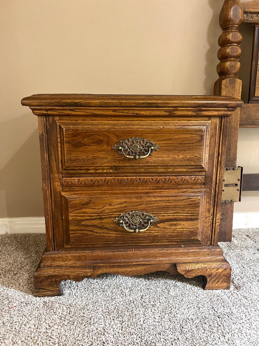 QUEEN SIZE Solid wood headboard and two matching night stands. Headboard measures 62 inches wide and 47 inches tall. Night stand measures 24 inches tall and 24 1/2 inches wide and 16 1/2 inches deep.