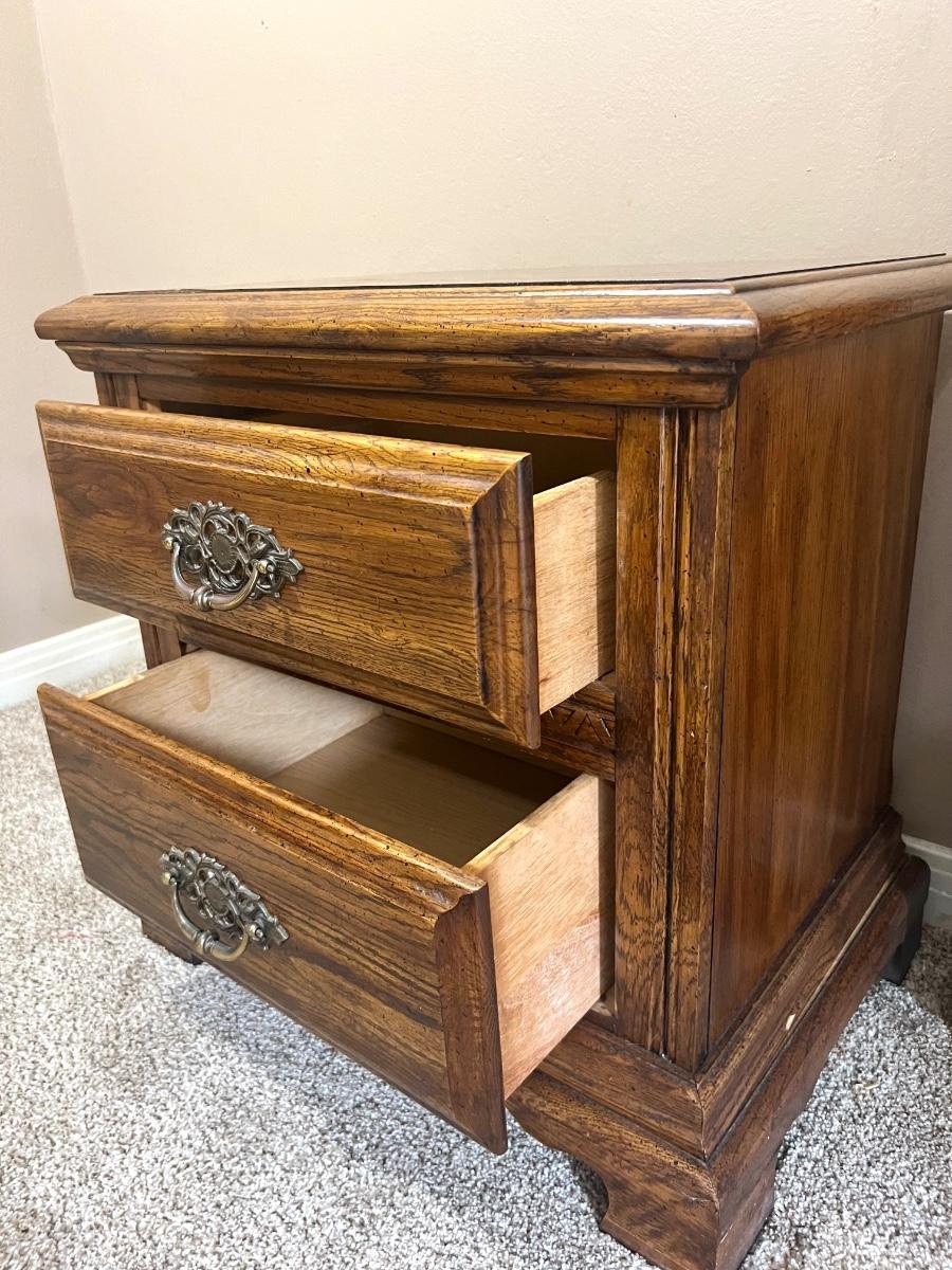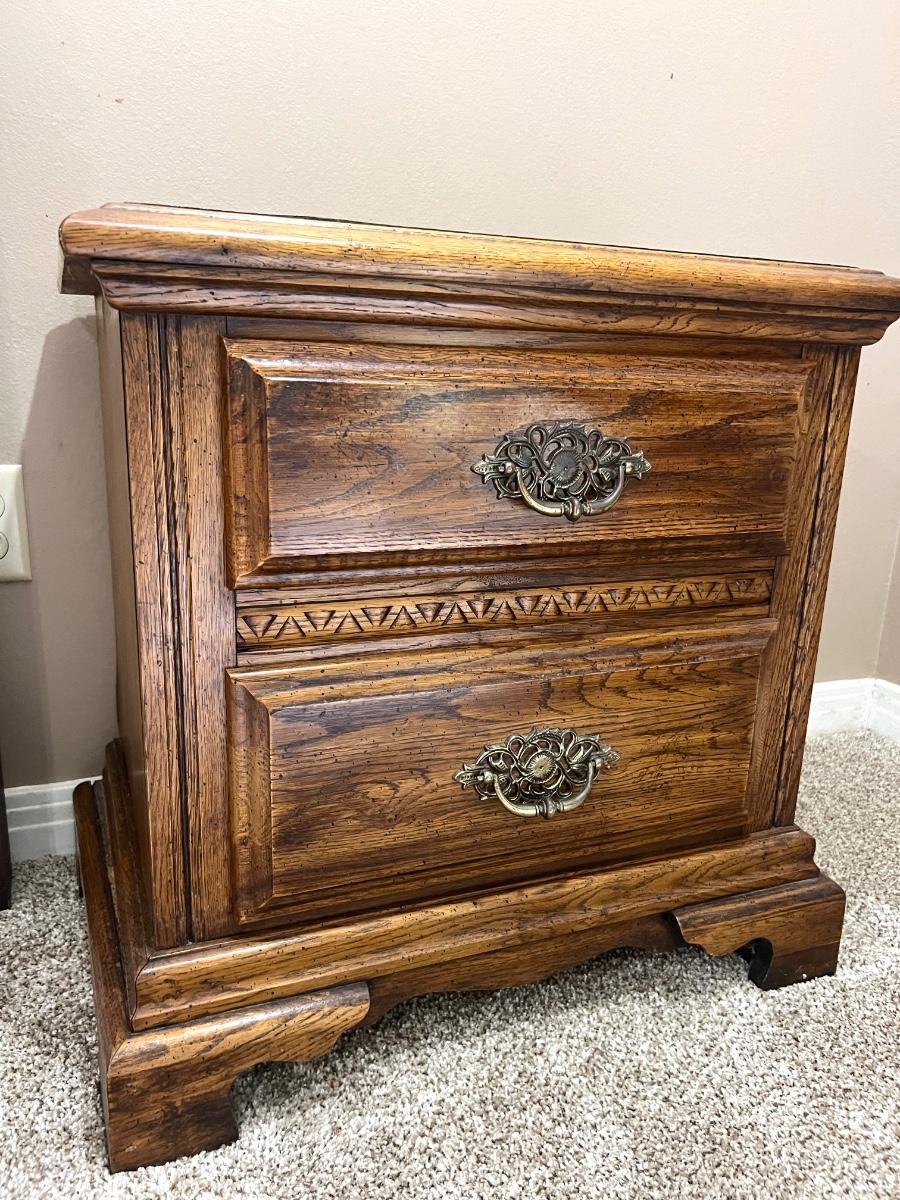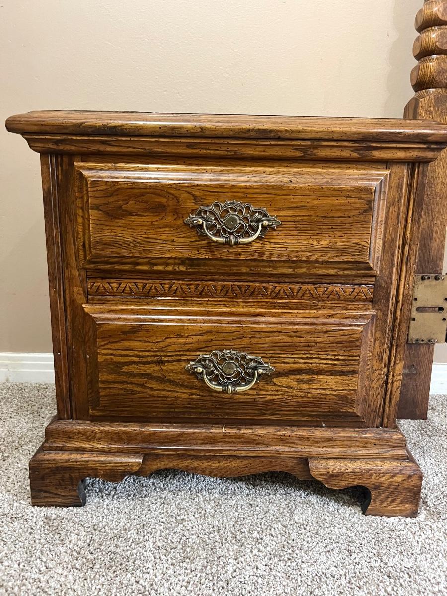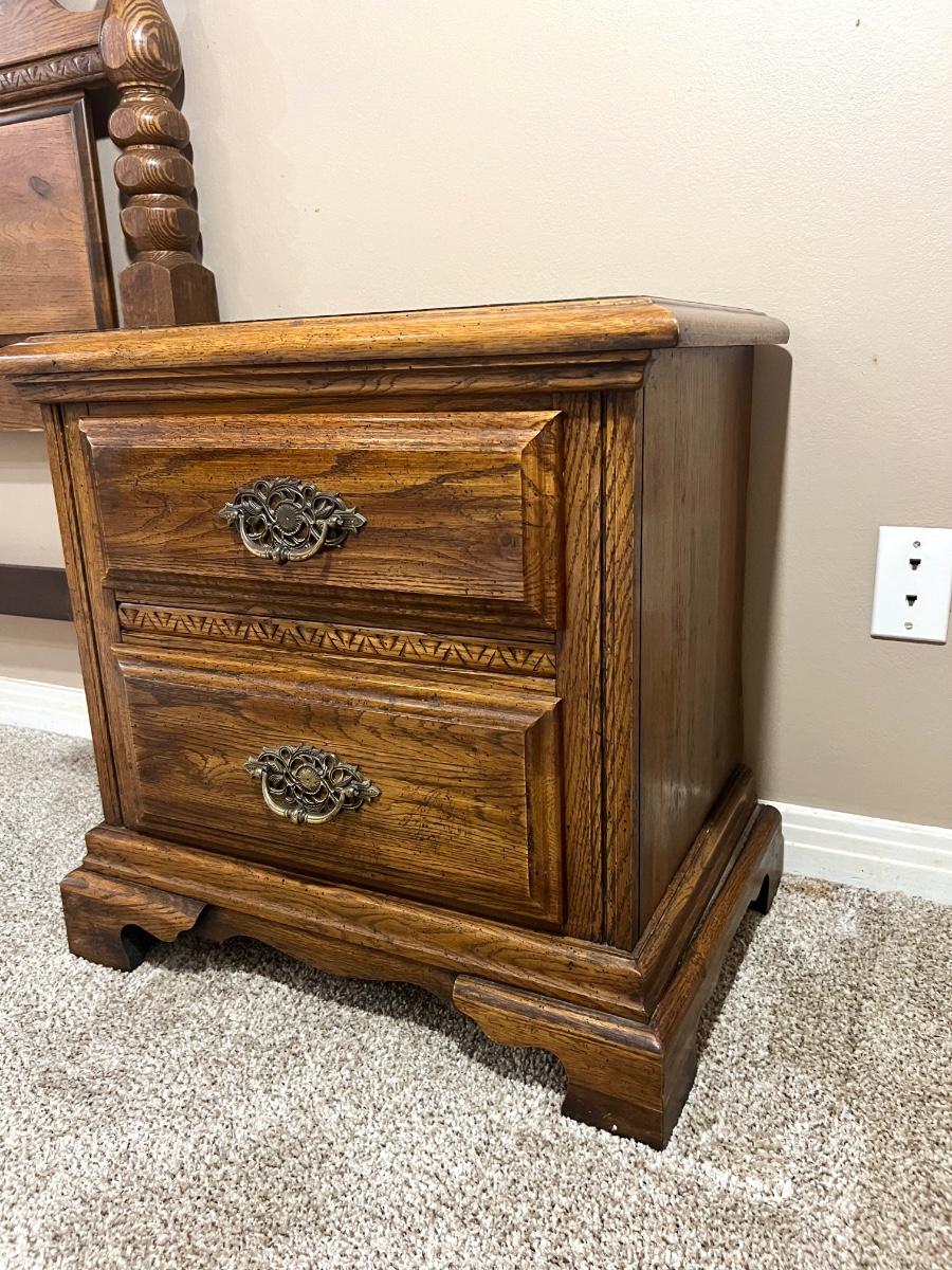 QUEEN SIZE Solid wood headboard and two matching night stands. Headboard measures 62 inches wide and 47 inches tall. Night stand measures 24 inches tall and 24 1/2 inches wide and 16 1/2 inches deep.