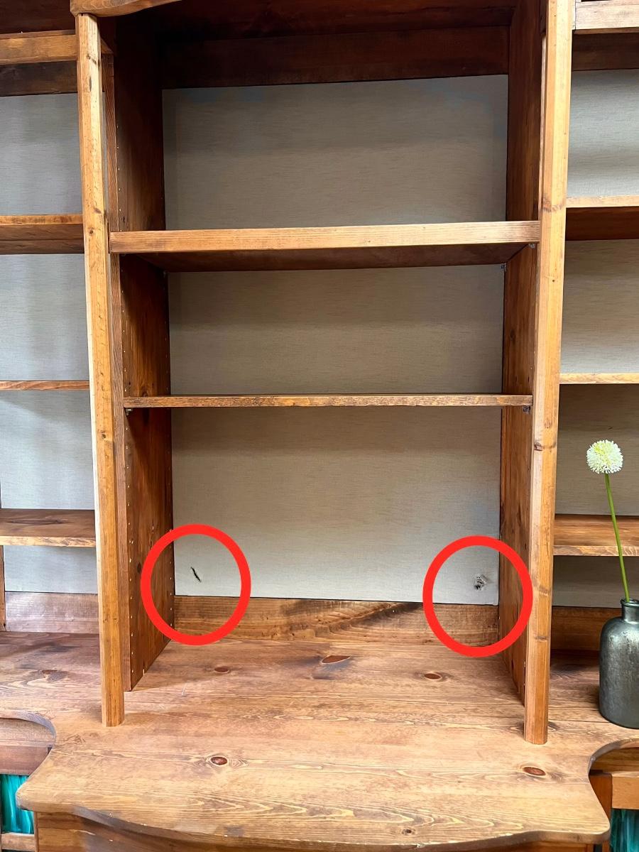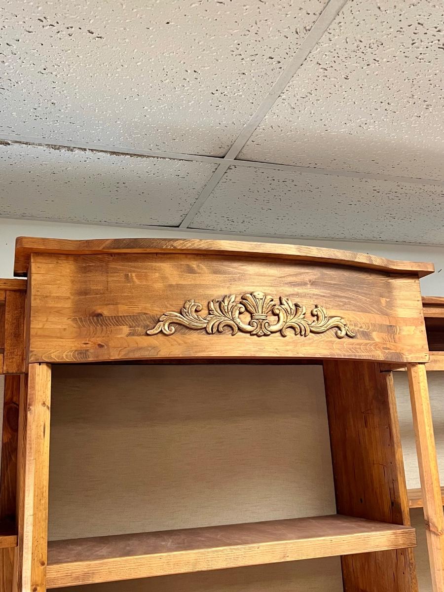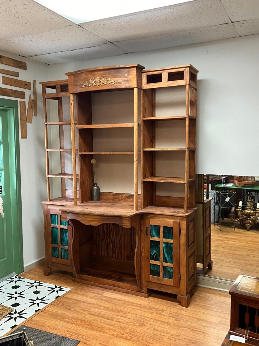 2 pieces ~ The middle of the tapestry has 2 holes made for lamp cords, can be hidden with decor, see photos ~ Bring tools to dismantle ~ Entire hutch = 92” H x 72” W x 28” D ~ Bottom = 36” H ~ Top = 57” H