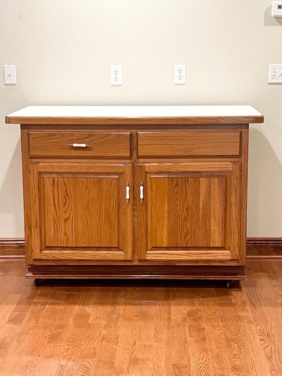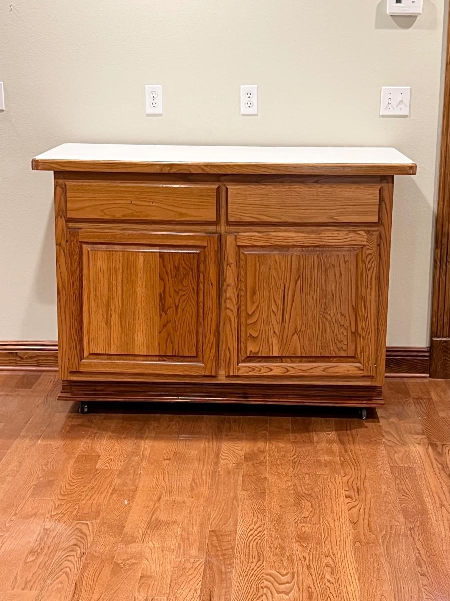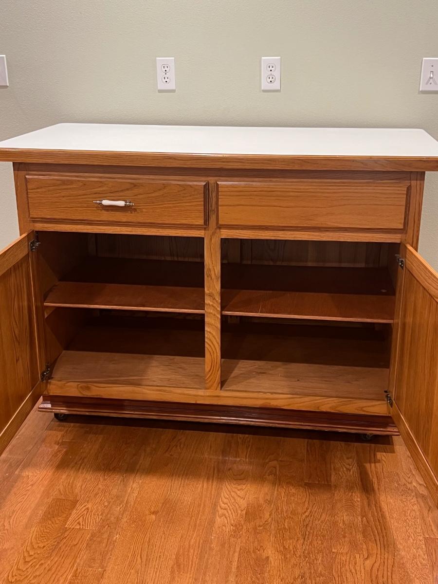Rolls easy ~ Drawers slide easy ~ Has cut out for electrical outlet on 1 side ~ Shelf is removable ~ 1 side does not have hardware ~ 39.5” H x 54” W x 27.5” D