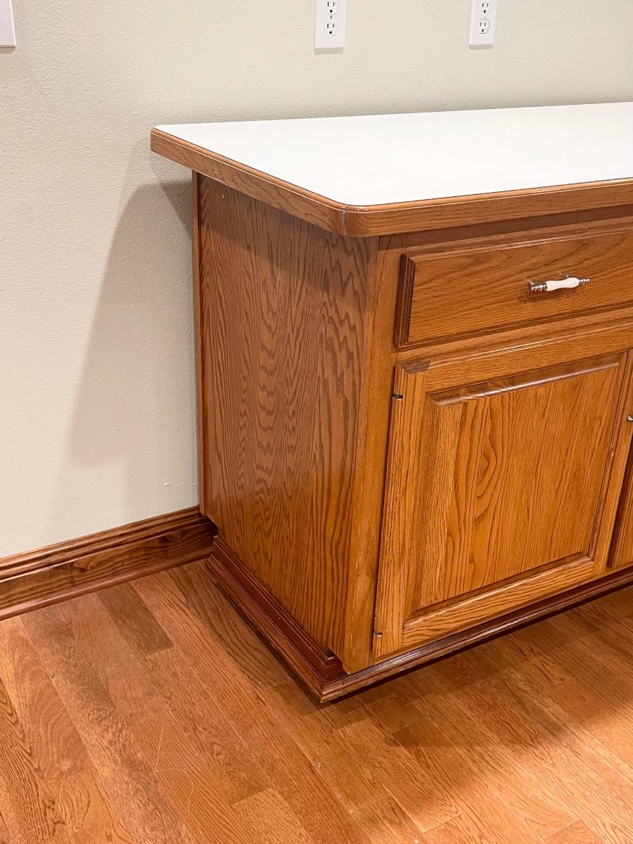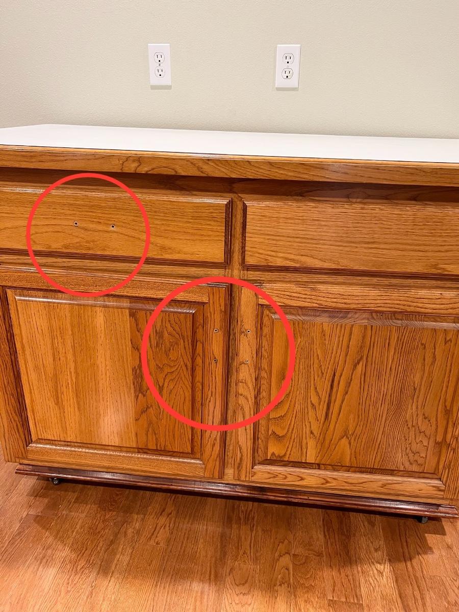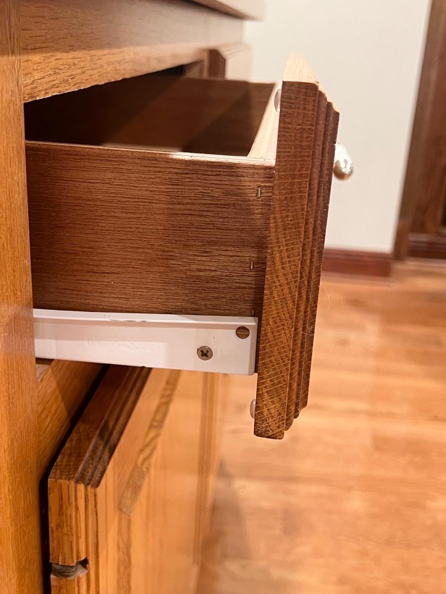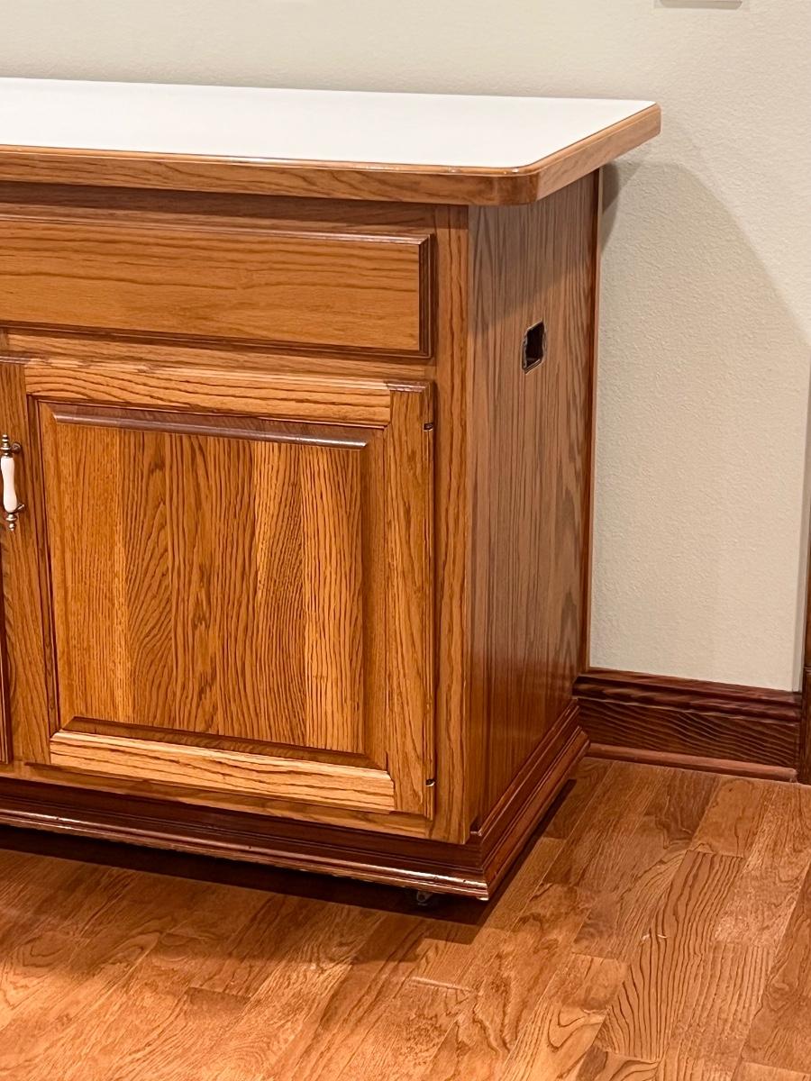 Rolls easy ~ Drawers slide easy ~ Has cut out for electrical outlet on 1 side ~ Shelf is removable ~ 1 side does not have hardware ~ 39.5” H x 54” W x 27.5” D