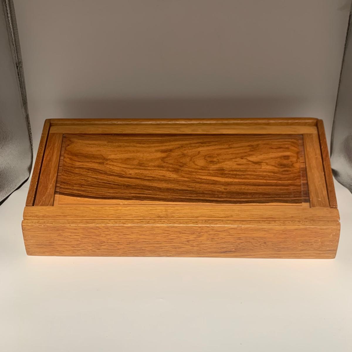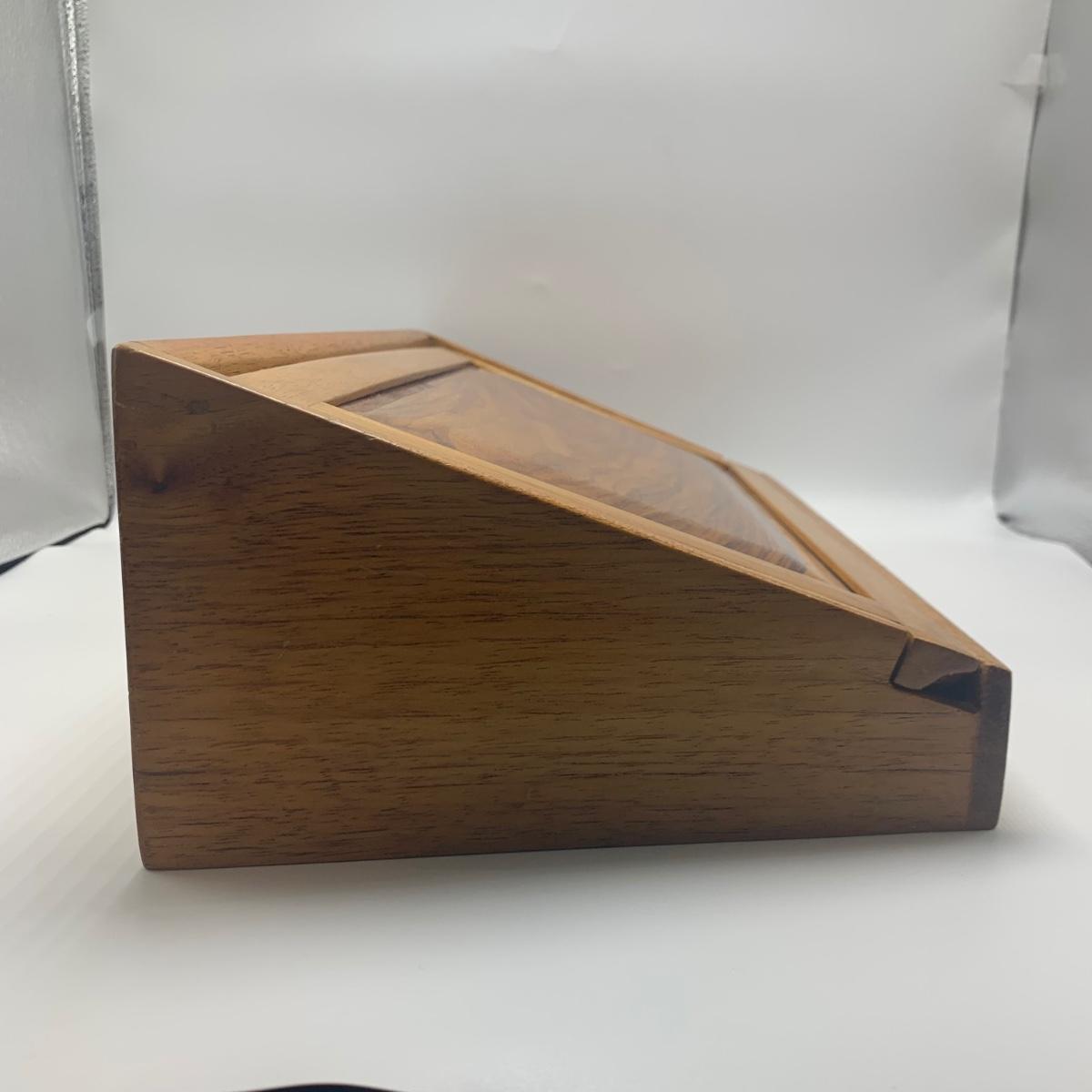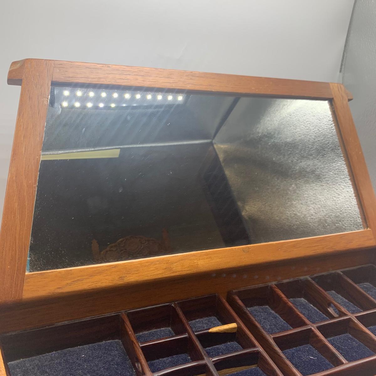 Gorgeous solid wood jewelry box with a unique shape. Jewelry box is approximately 19” x 9.5” x 5.25”H at the tallest part. There is a mirror on the inside of the lid. Inside the jewelry box it is lined with navy blue velvet and has two removable trays. See photos to see the beautiful wood the removable trays are made of. The box is a bit dusty inside and needs to be cleaned. It has some very small scratches on the outer surface. All sales are final. No returns or refunds. Please bid accordingly.