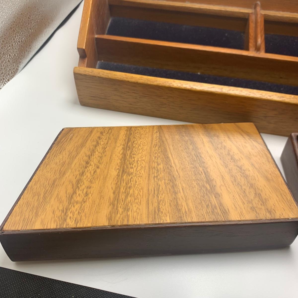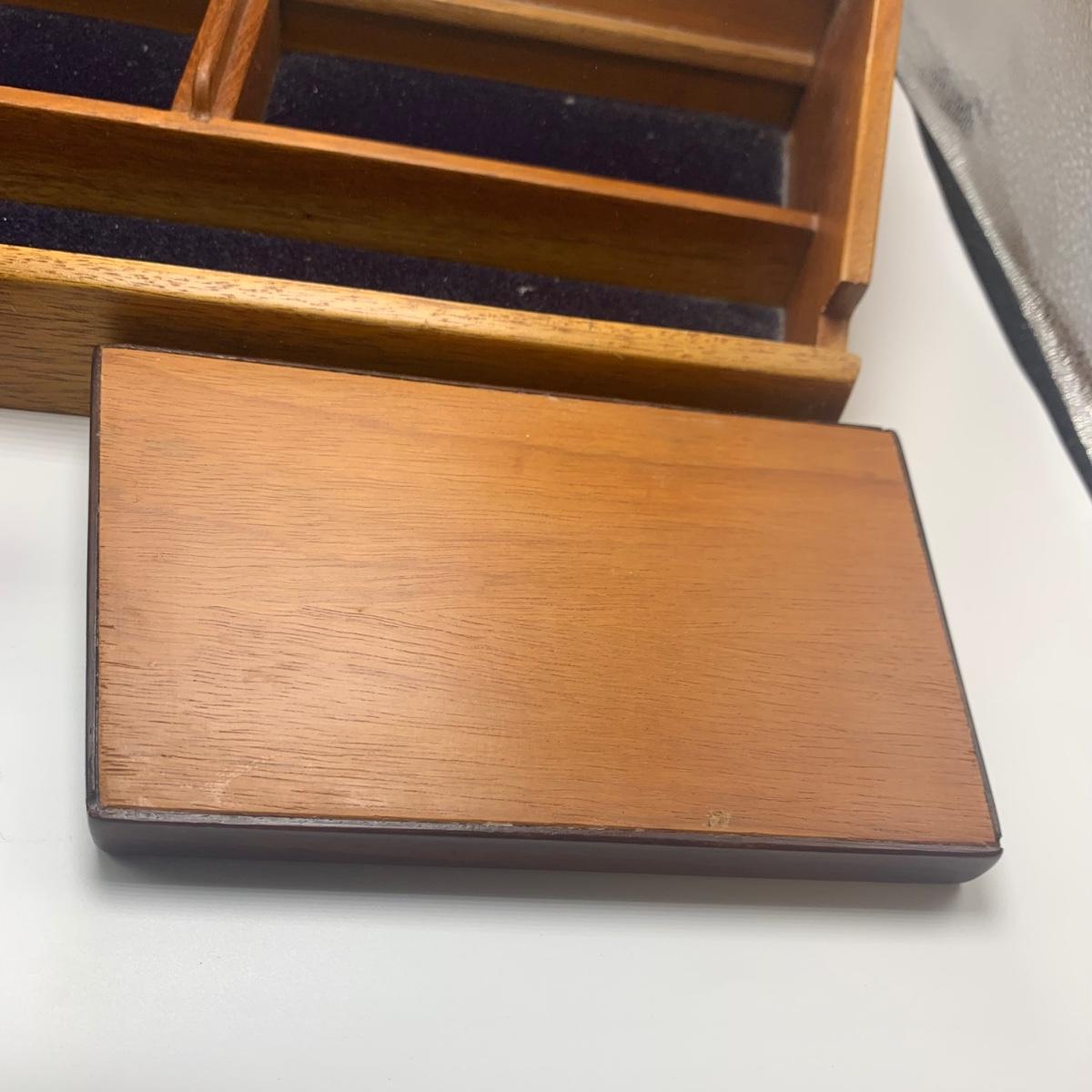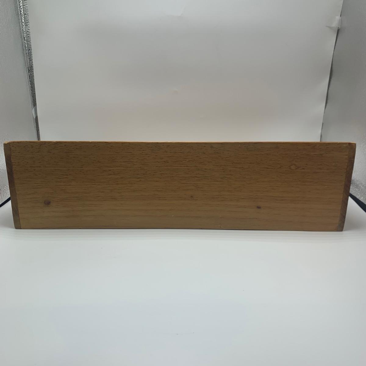 Gorgeous solid wood jewelry box with a unique shape. Jewelry box is approximately 19” x 9.5” x 5.25”H at the tallest part. There is a mirror on the inside of the lid. Inside the jewelry box it is lined with navy blue velvet and has two removable trays. See photos to see the beautiful wood the removable trays are made of. The box is a bit dusty inside and needs to be cleaned. It has some very small scratches on the outer surface. All sales are final. No returns or refunds. Please bid accordingly.